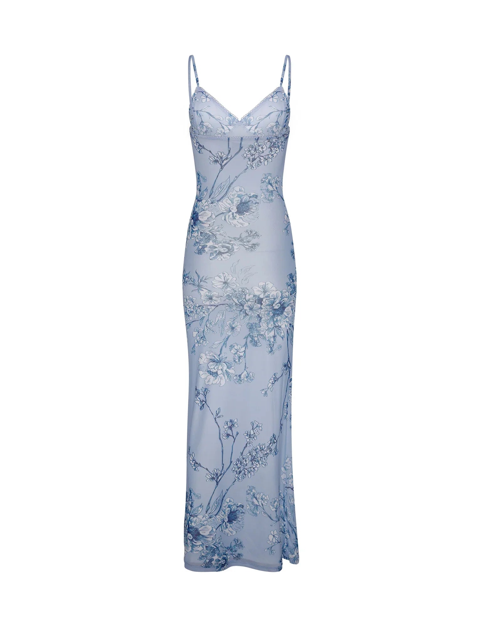 Women’s Blue Floral Maxi Dress – Full-Length Printed One-Piece for Seasonal Wear