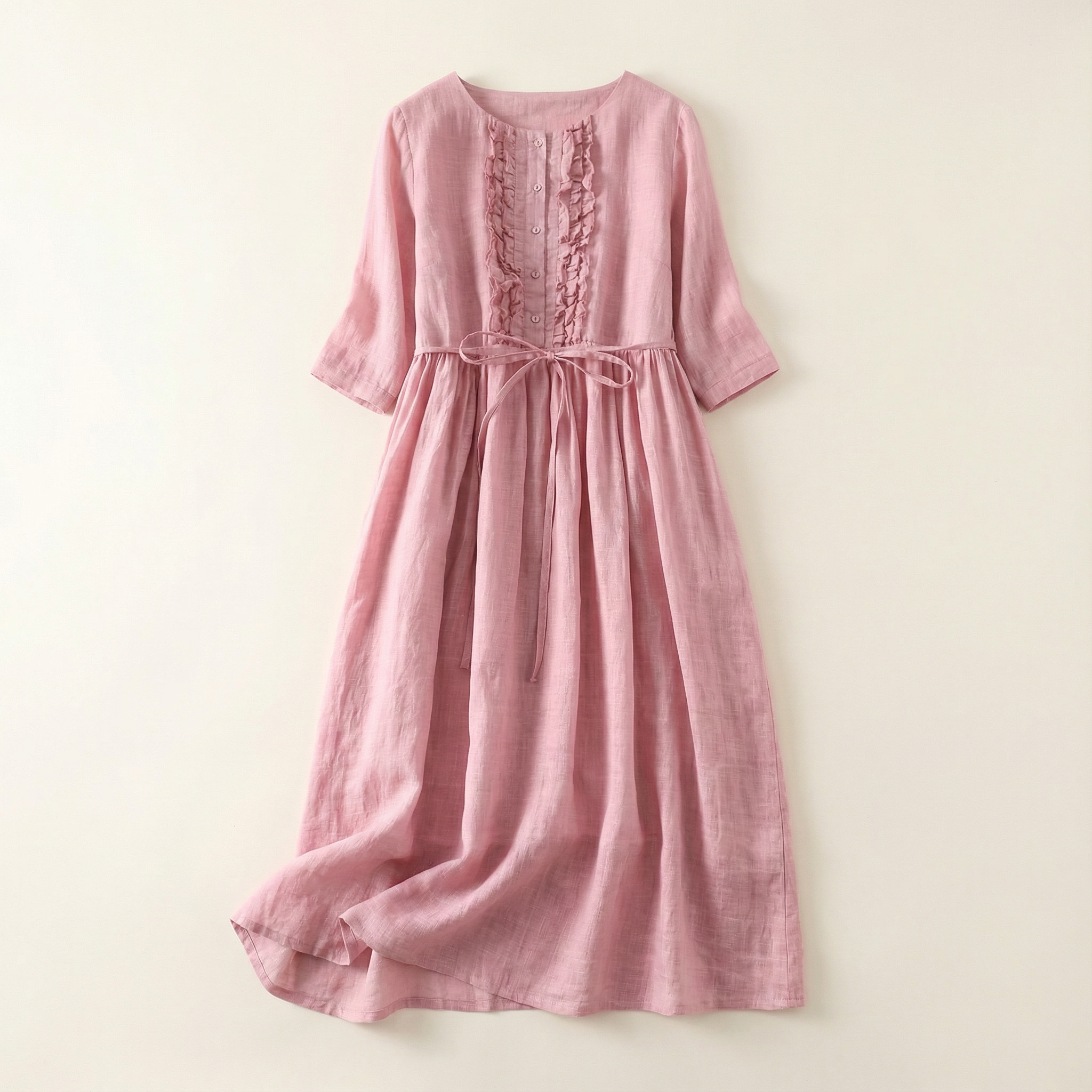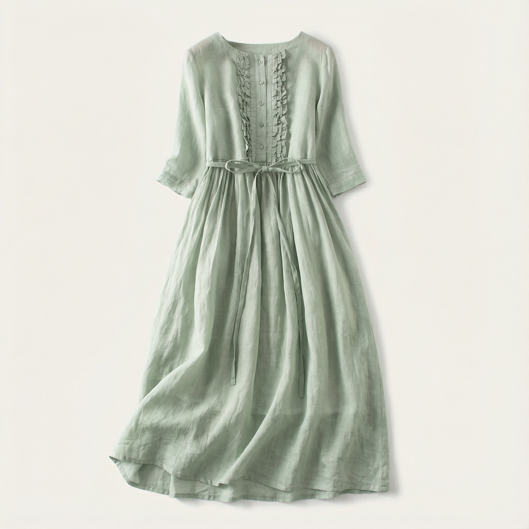 Women’s Midi Dress – Long Sleeves, Tie Waist, Front Pleat Detail