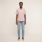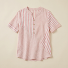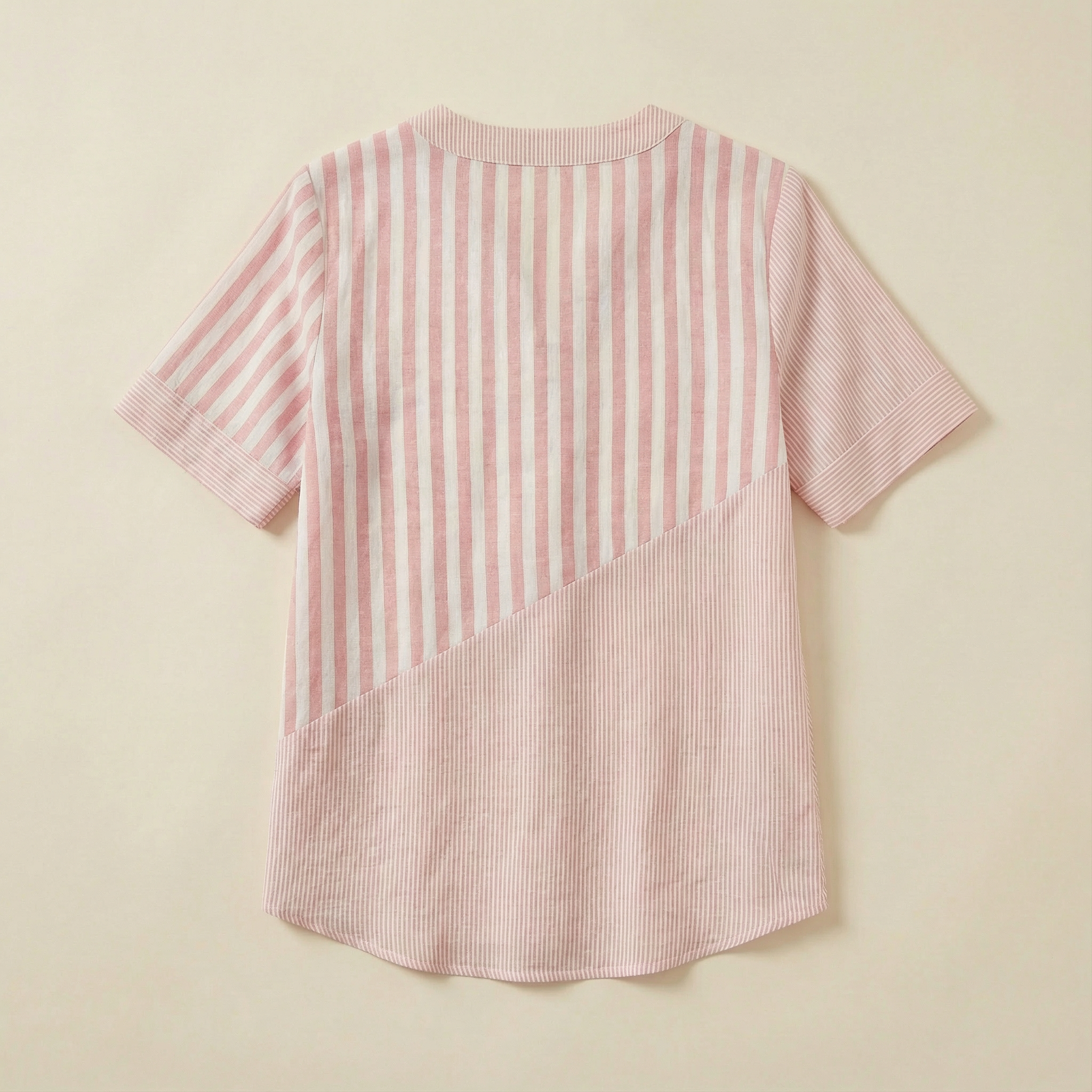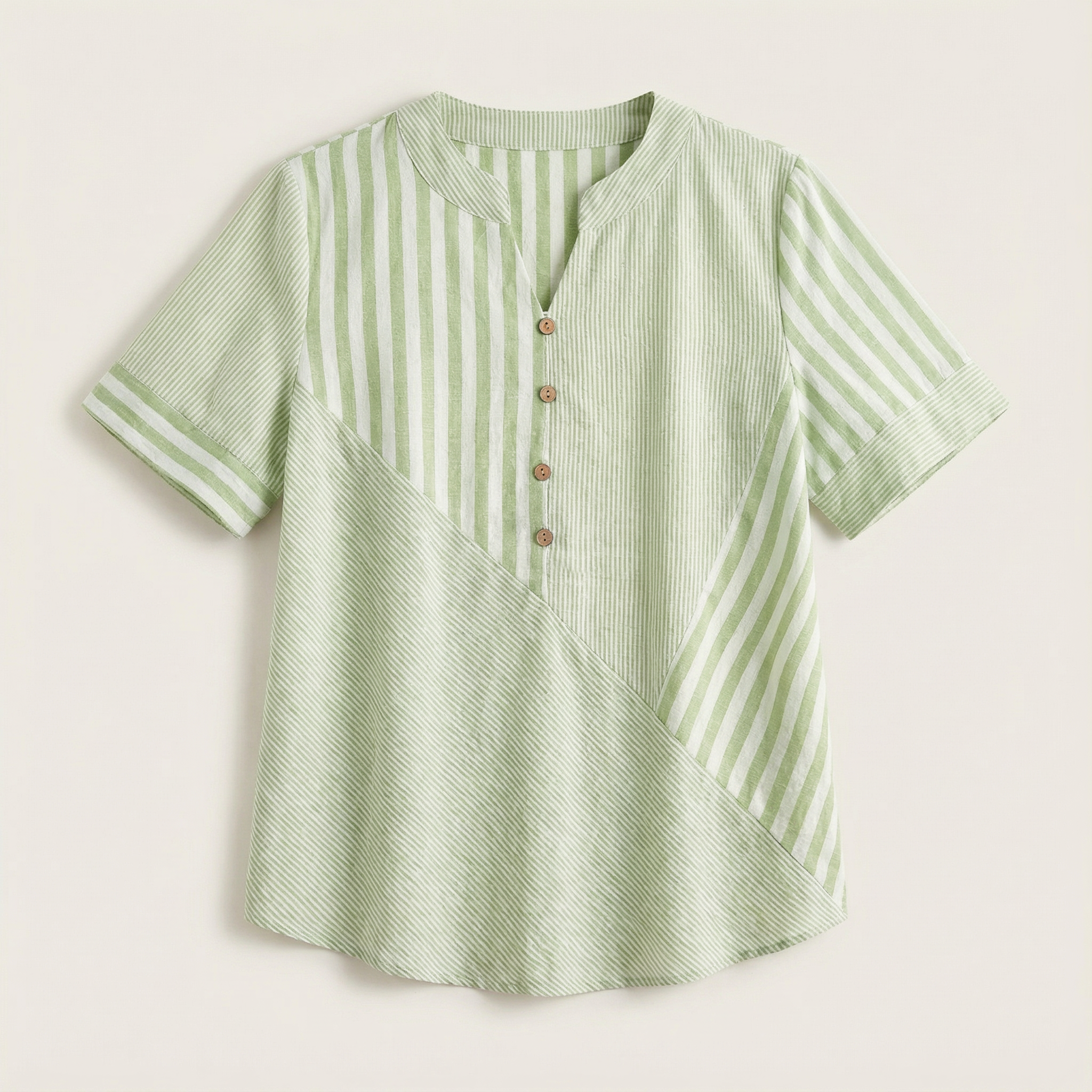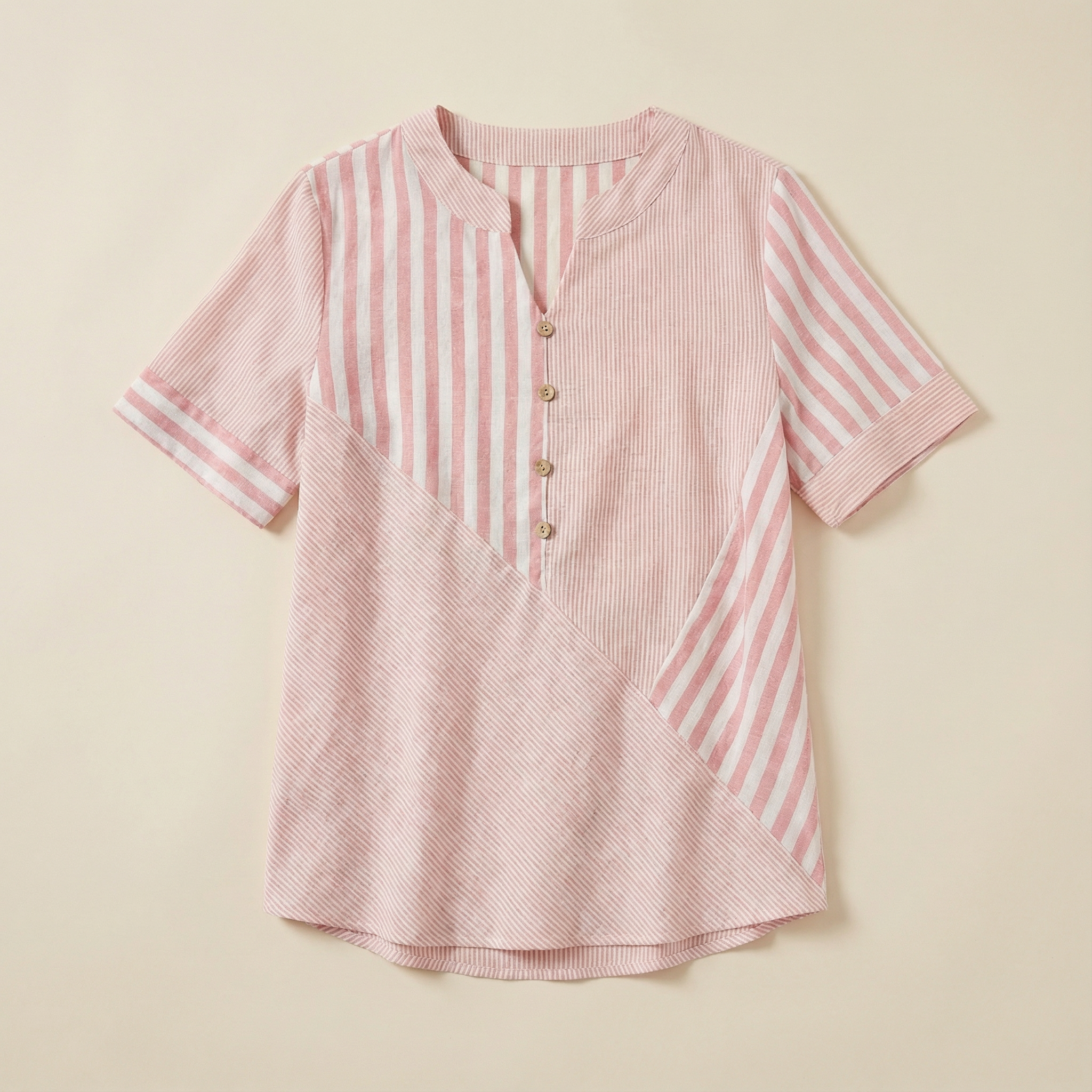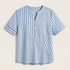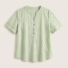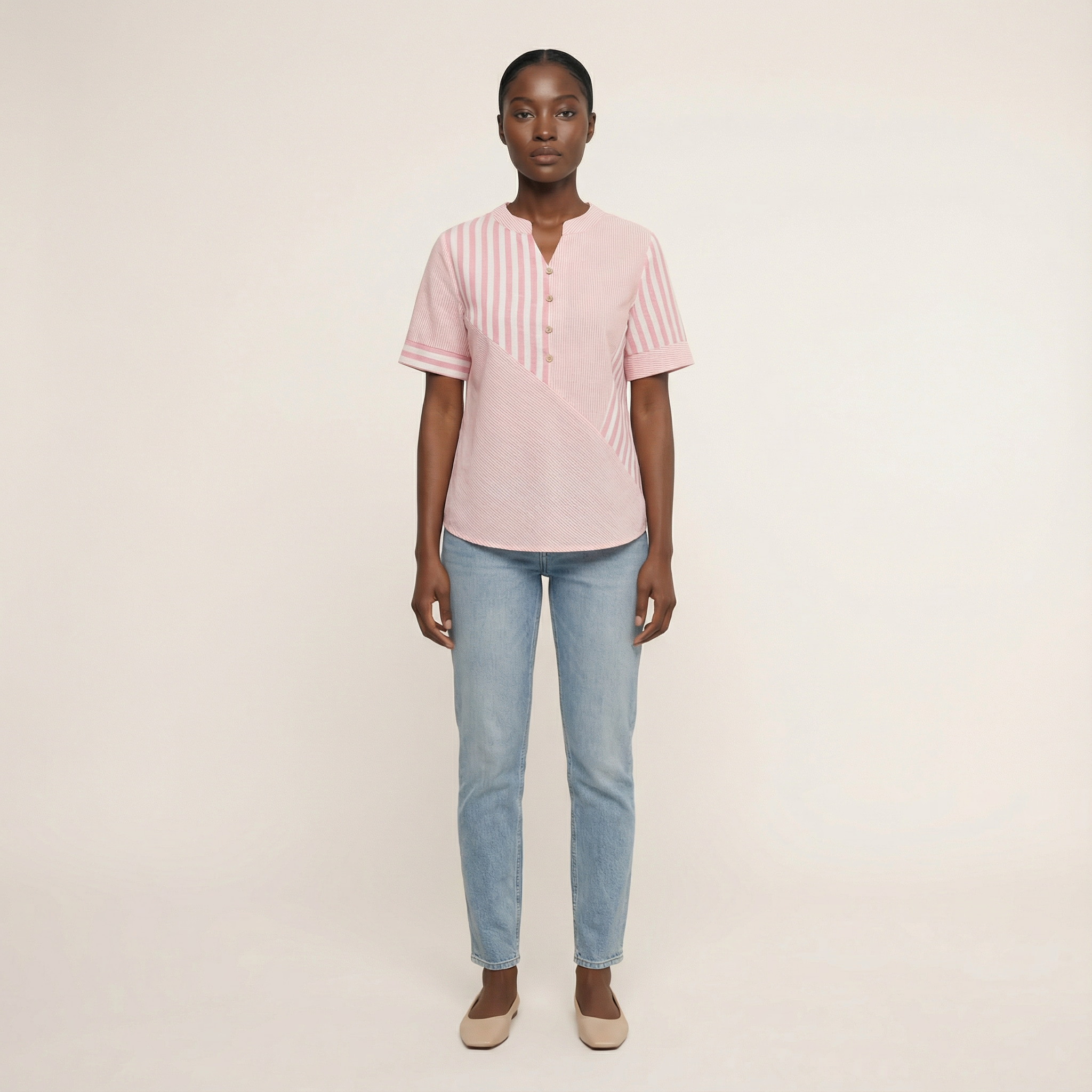 This women’s blouse is designed for everyday and casual wear. It features a V-neckline with short sleeves and a button-front detail.