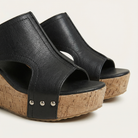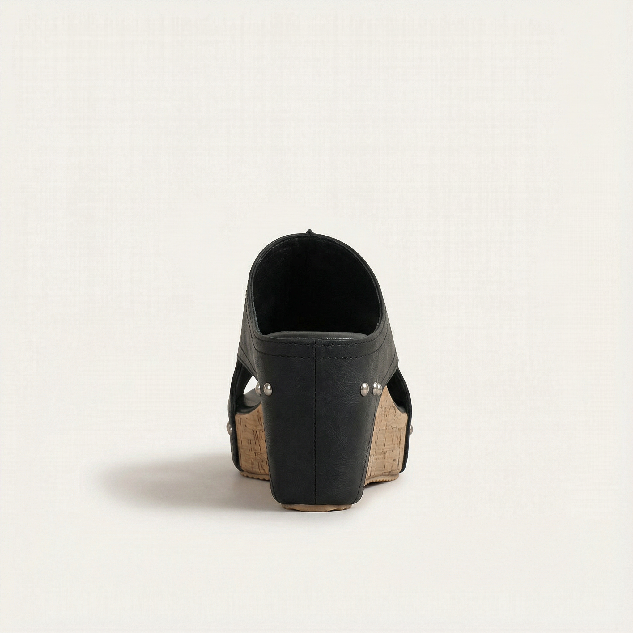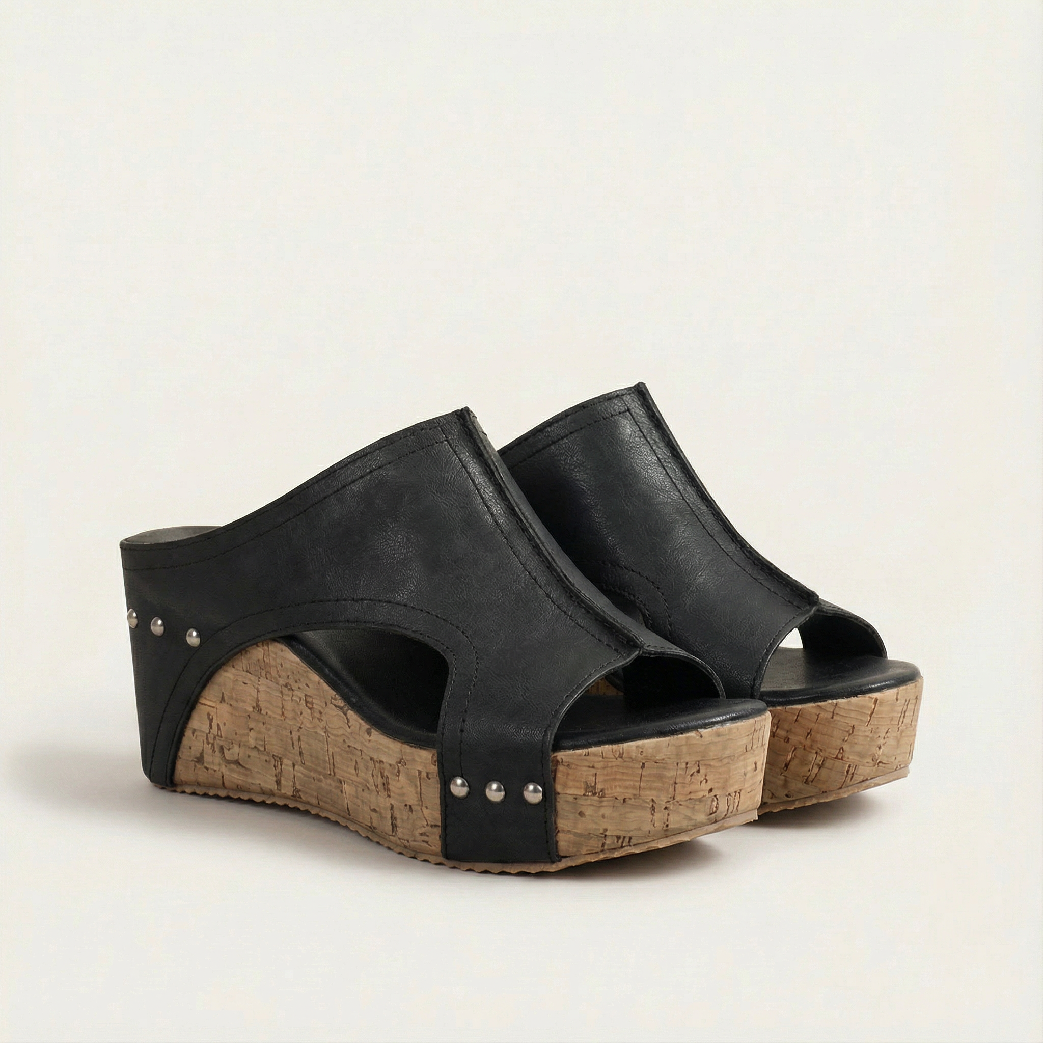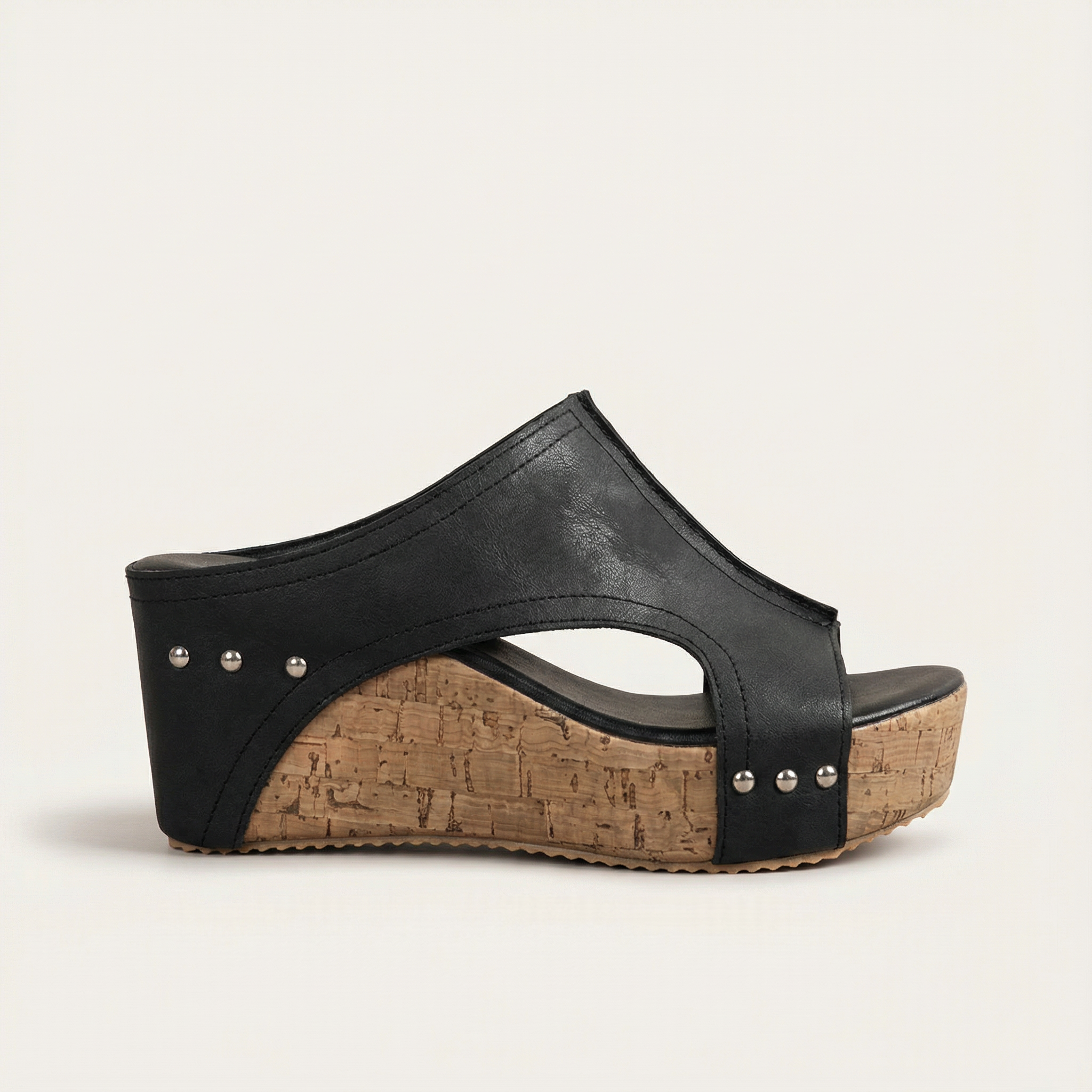 These women’s open-toe sandals feature a flat sole and open front design intended for general warm-weather use.
