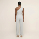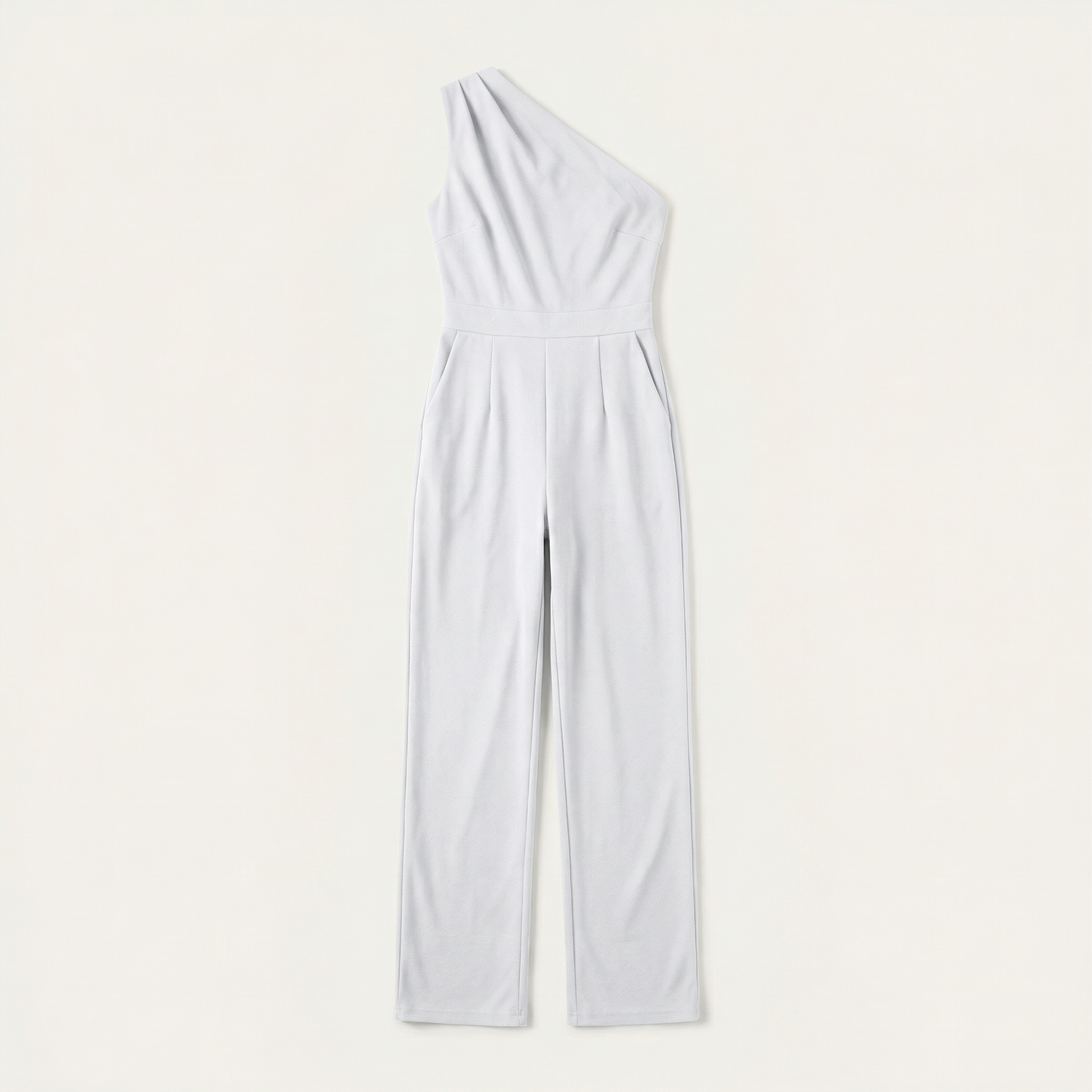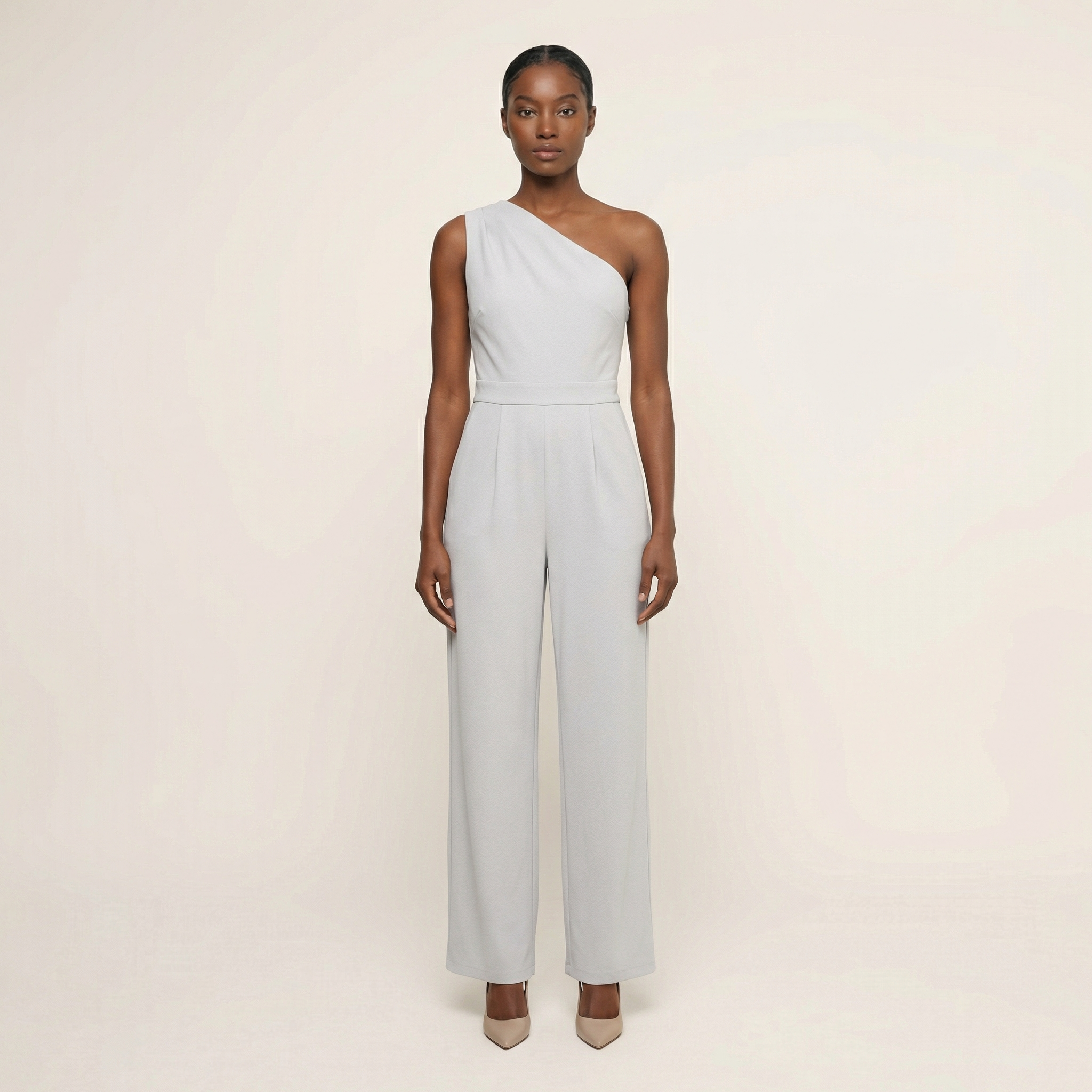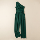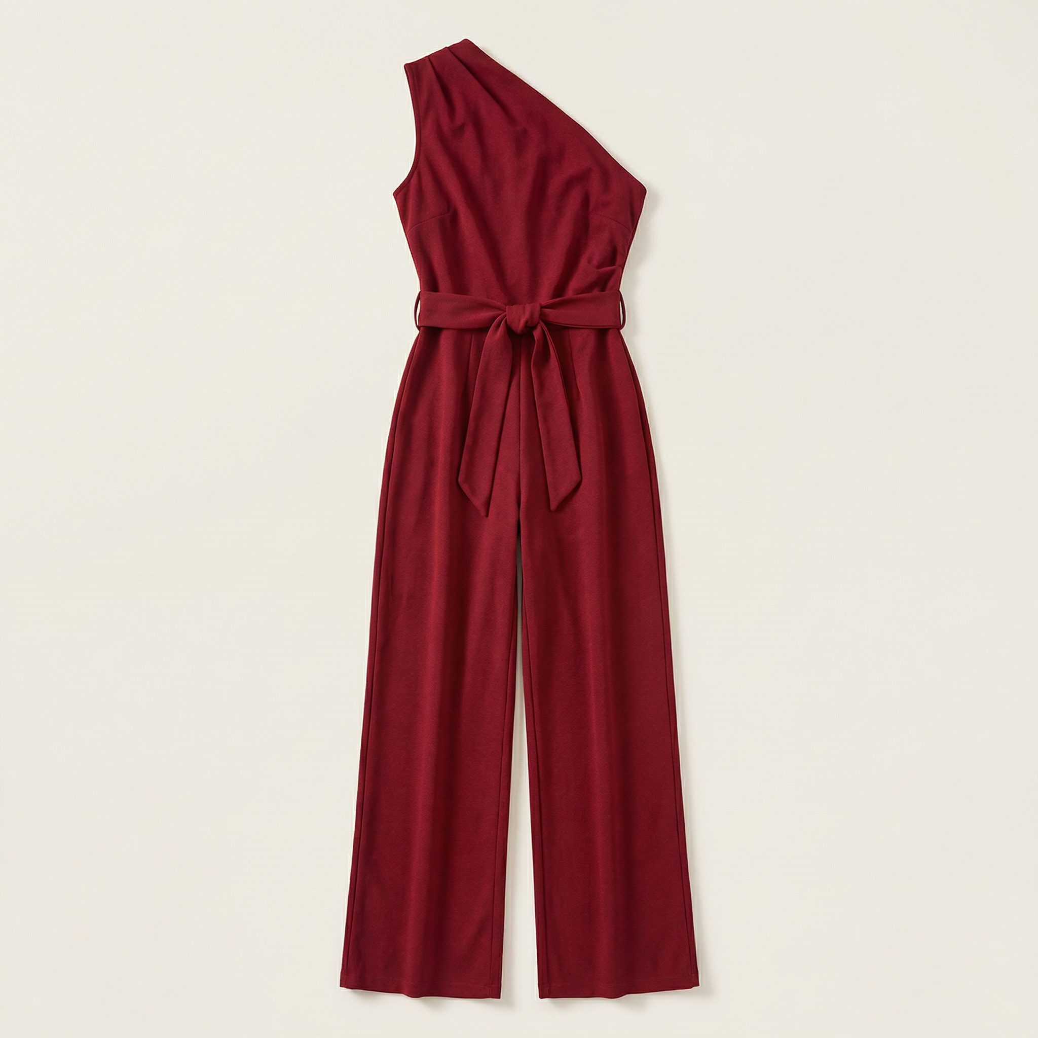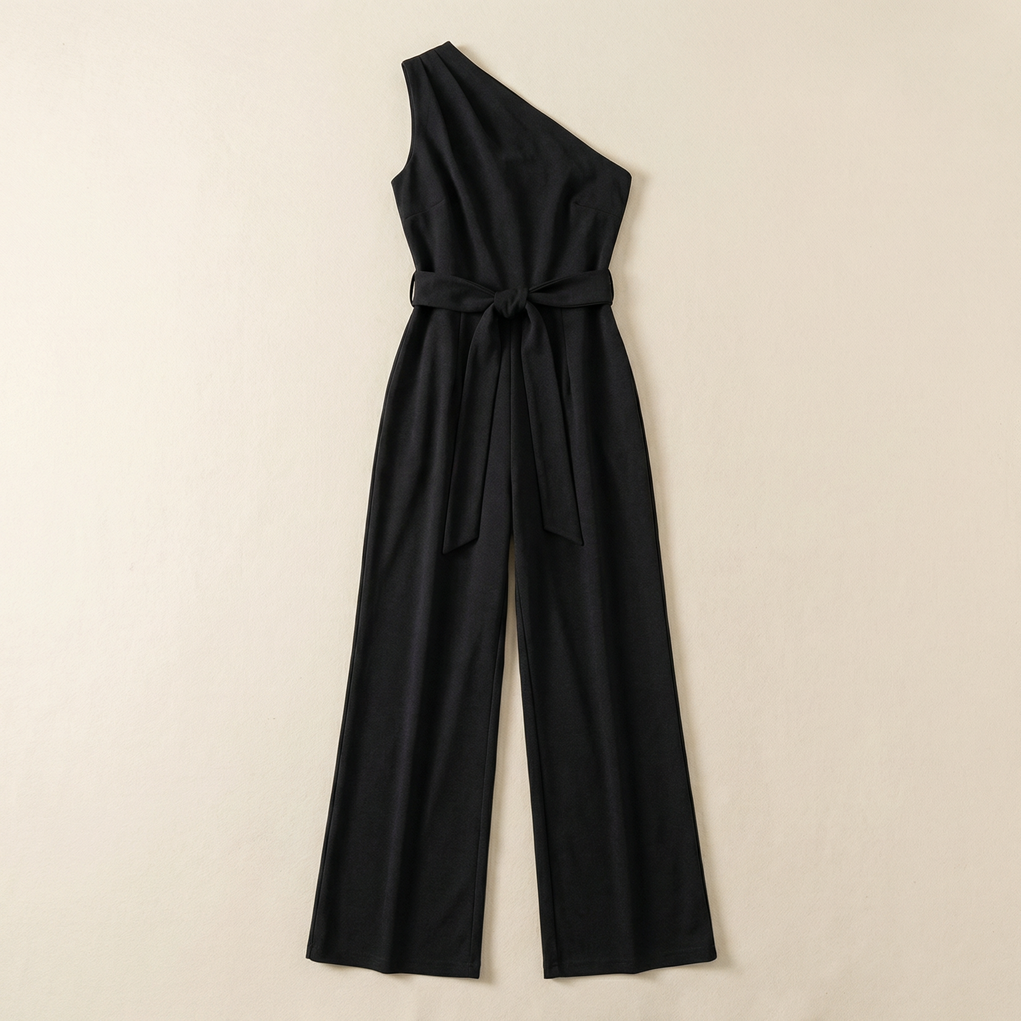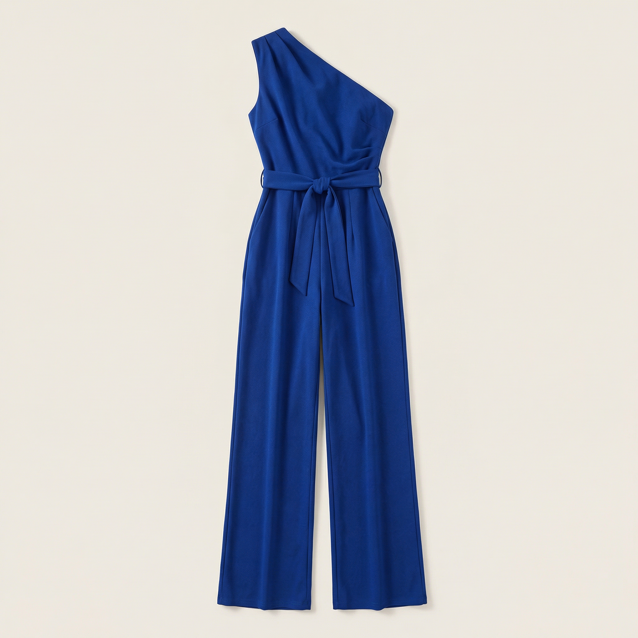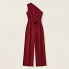 Women’s one-shoulder jumpsuit designed for everyday and occasion wear. Features a one-piece construction with a waist tie detail.