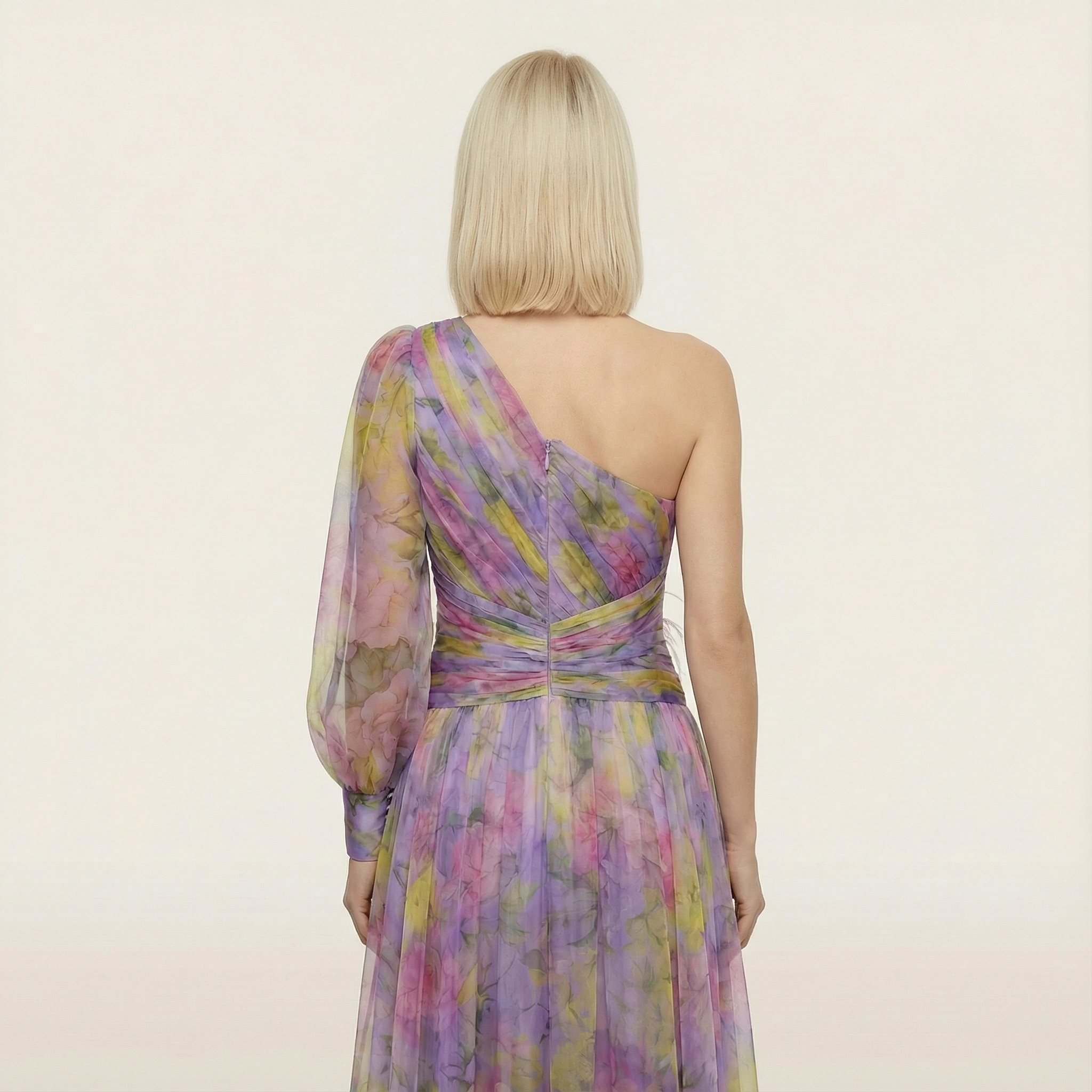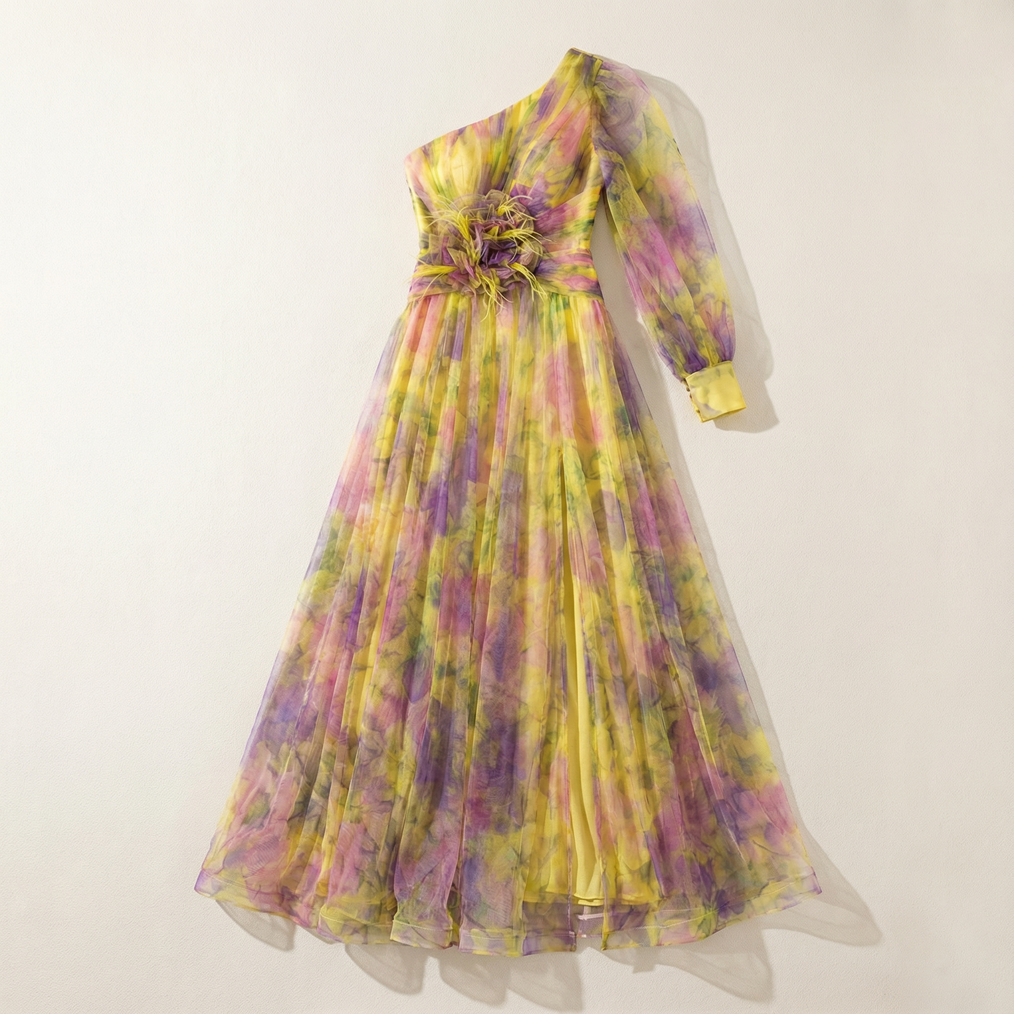 This women’s off-shoulder dress features a full-length silhouette with a colorful, semi-sheer overlay.