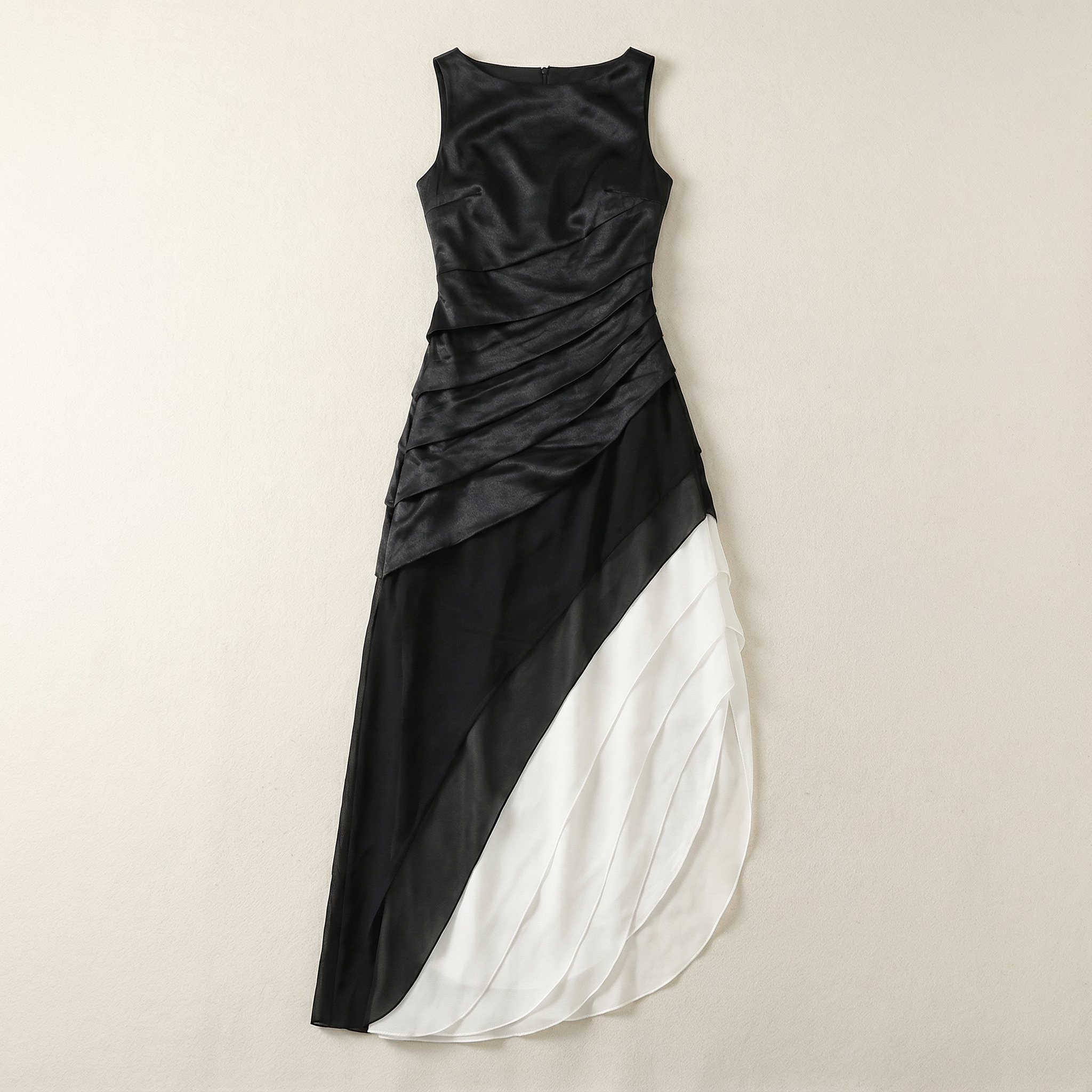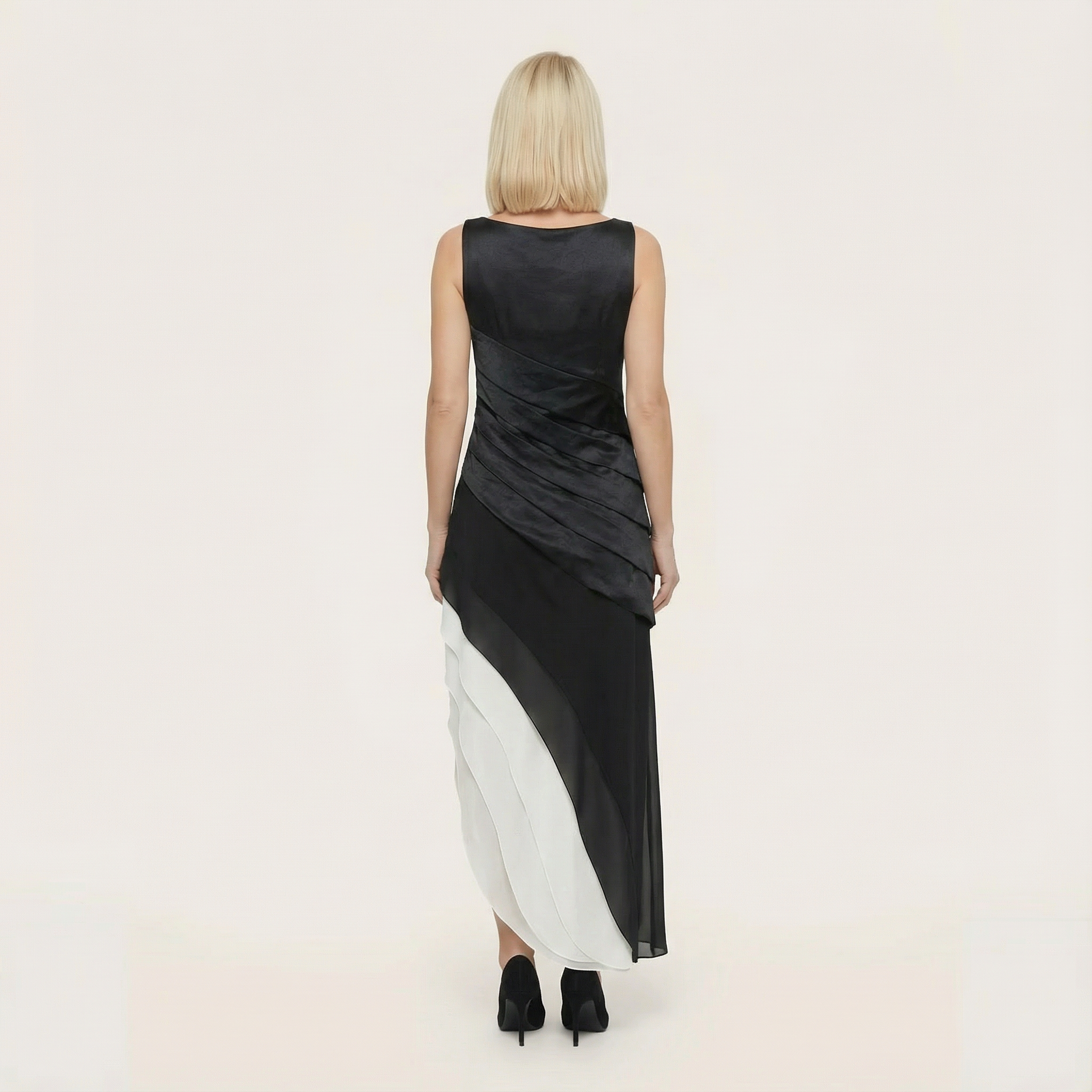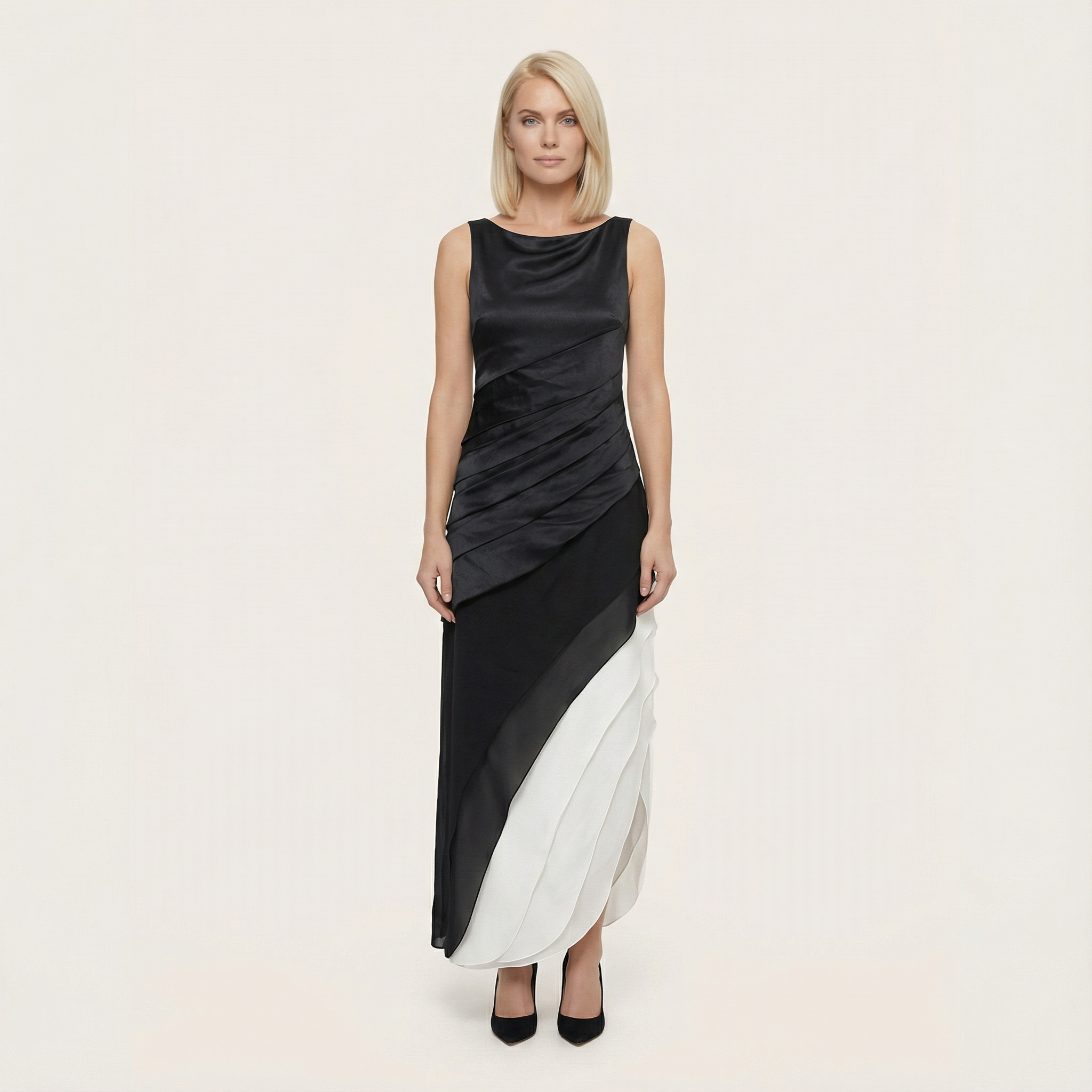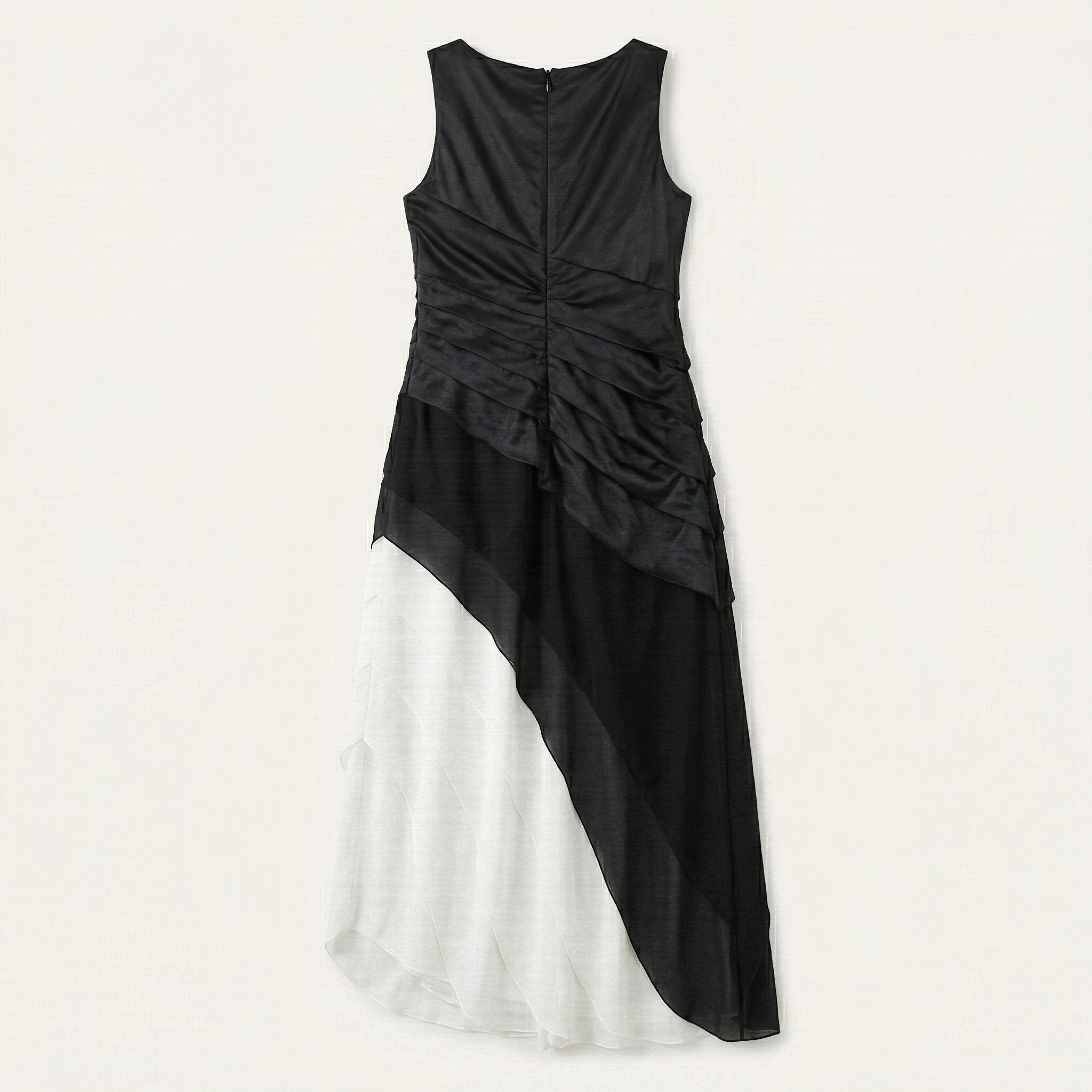 This women’s dress is designed for occasion or evening wear. It features a sleeveless design with a multi-layered skirt.