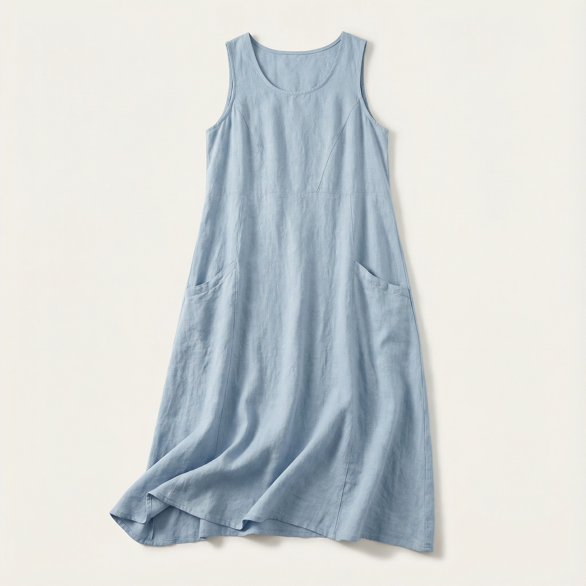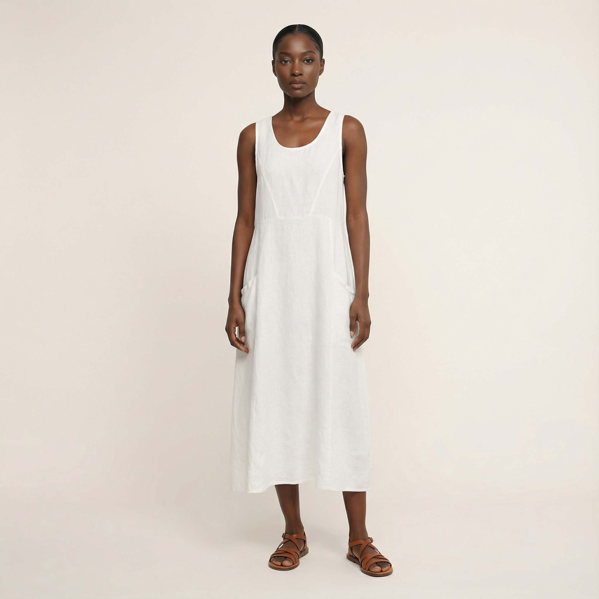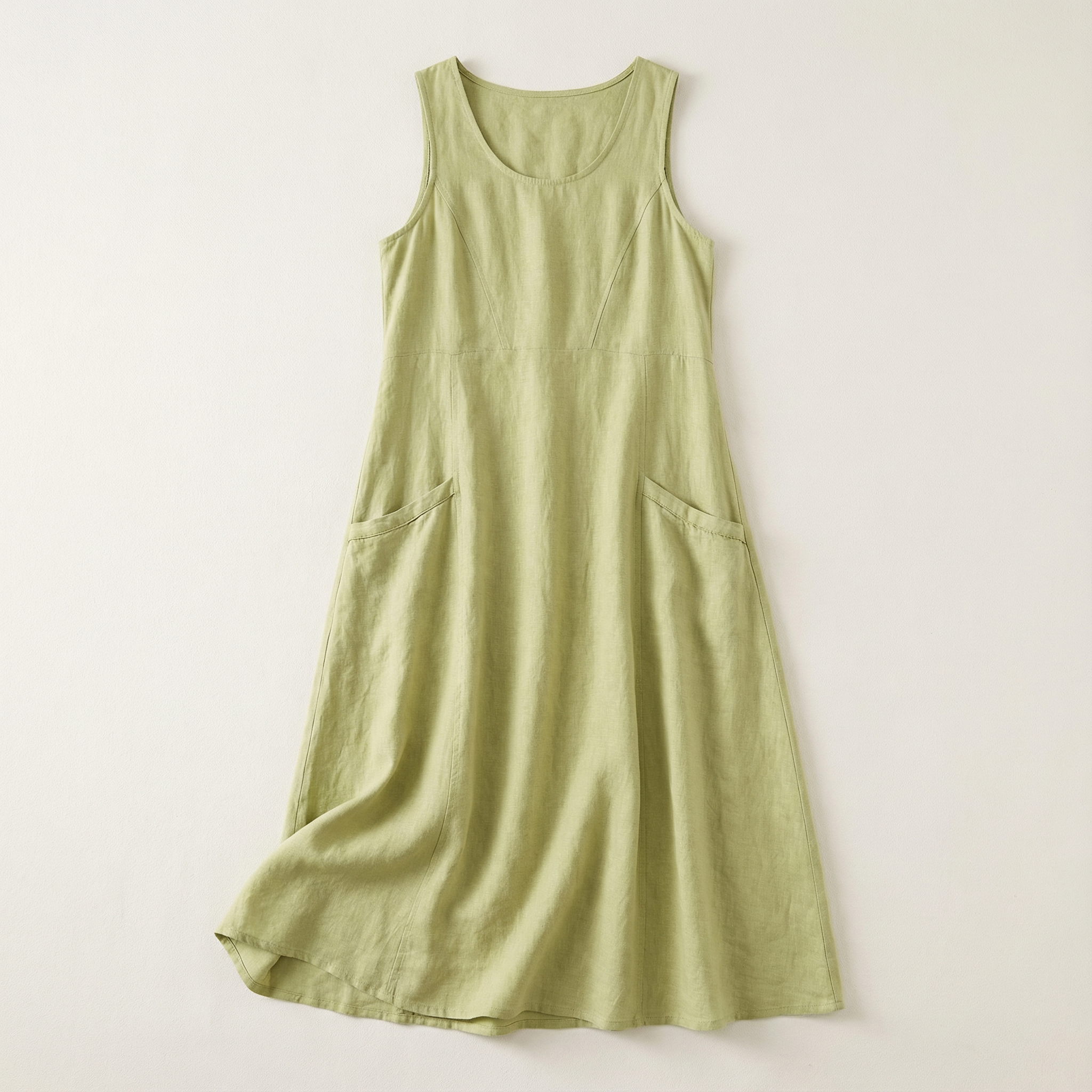 This women’s dress is designed for everyday warm-weather wear. It features a sleeveless design with a simple silhouette and side pockets.