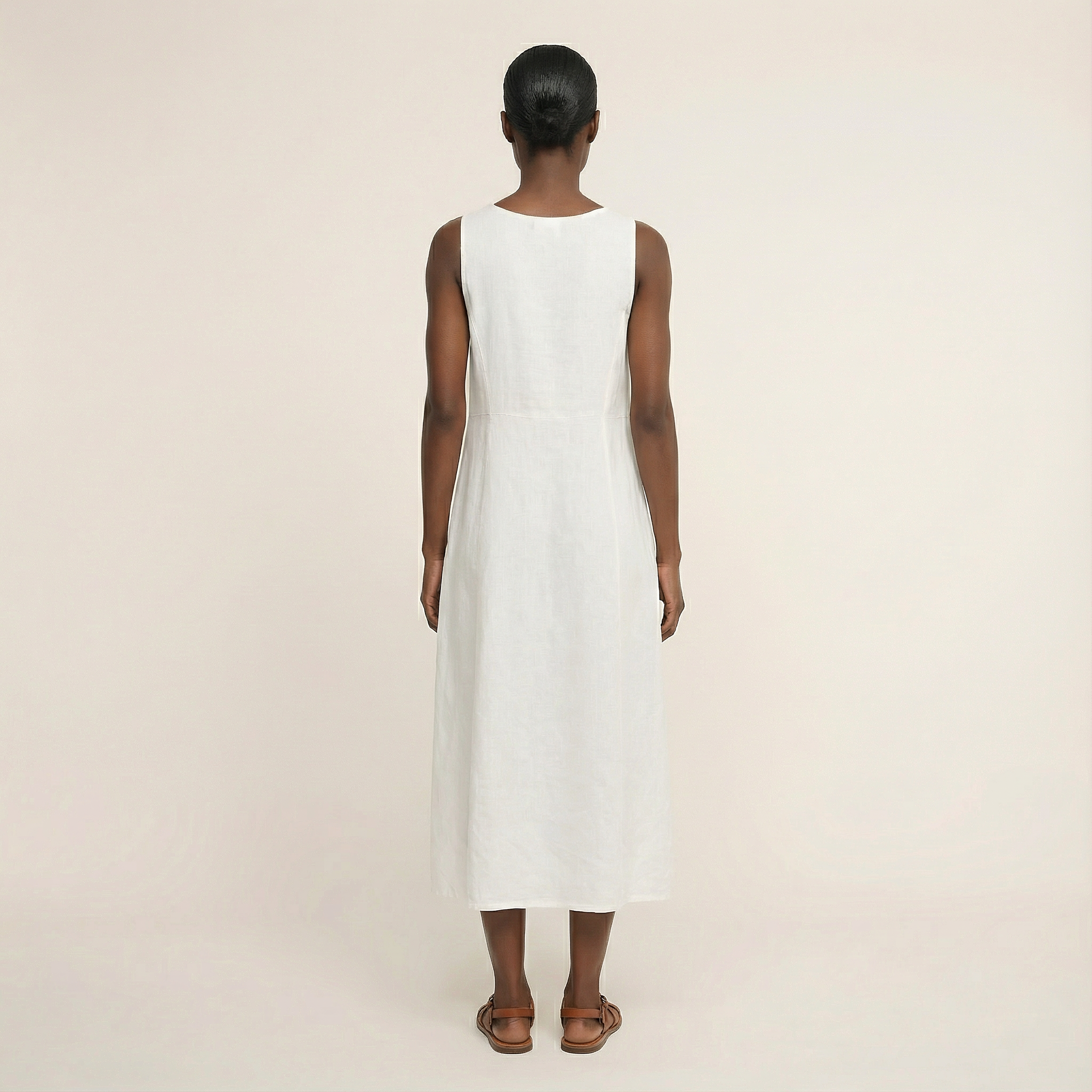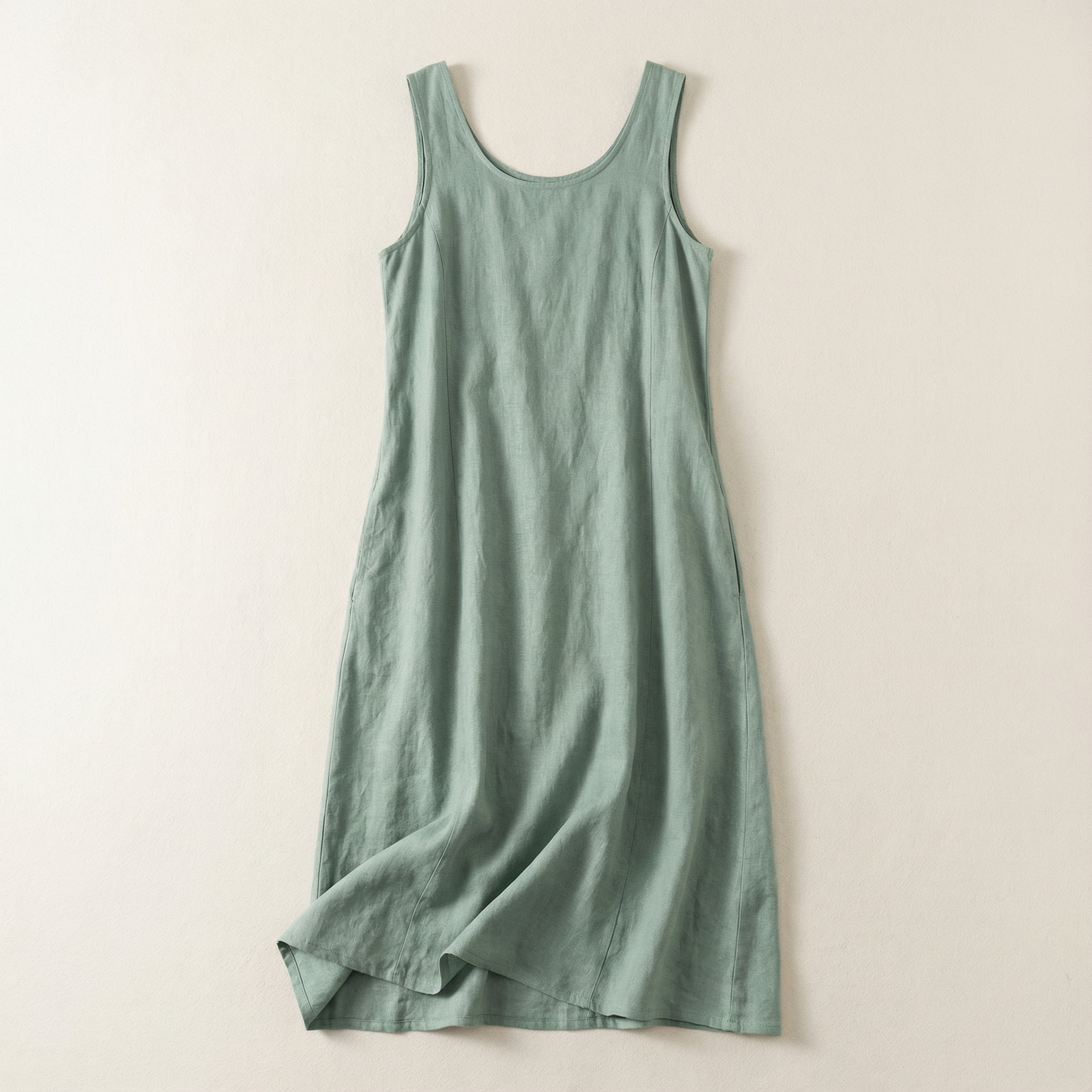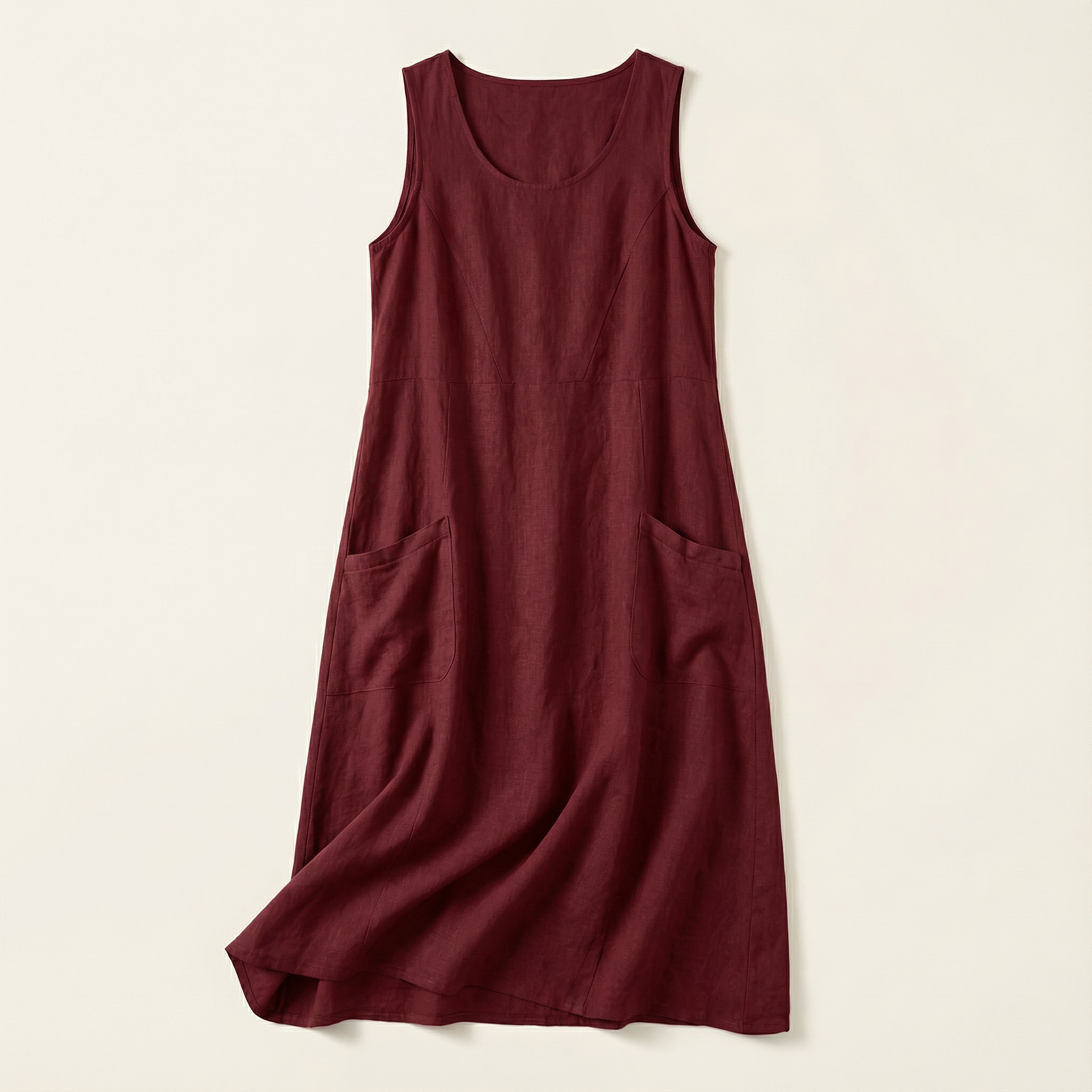 This women’s dress is designed for everyday warm-weather wear. It features a sleeveless design with a simple silhouette and side pockets.