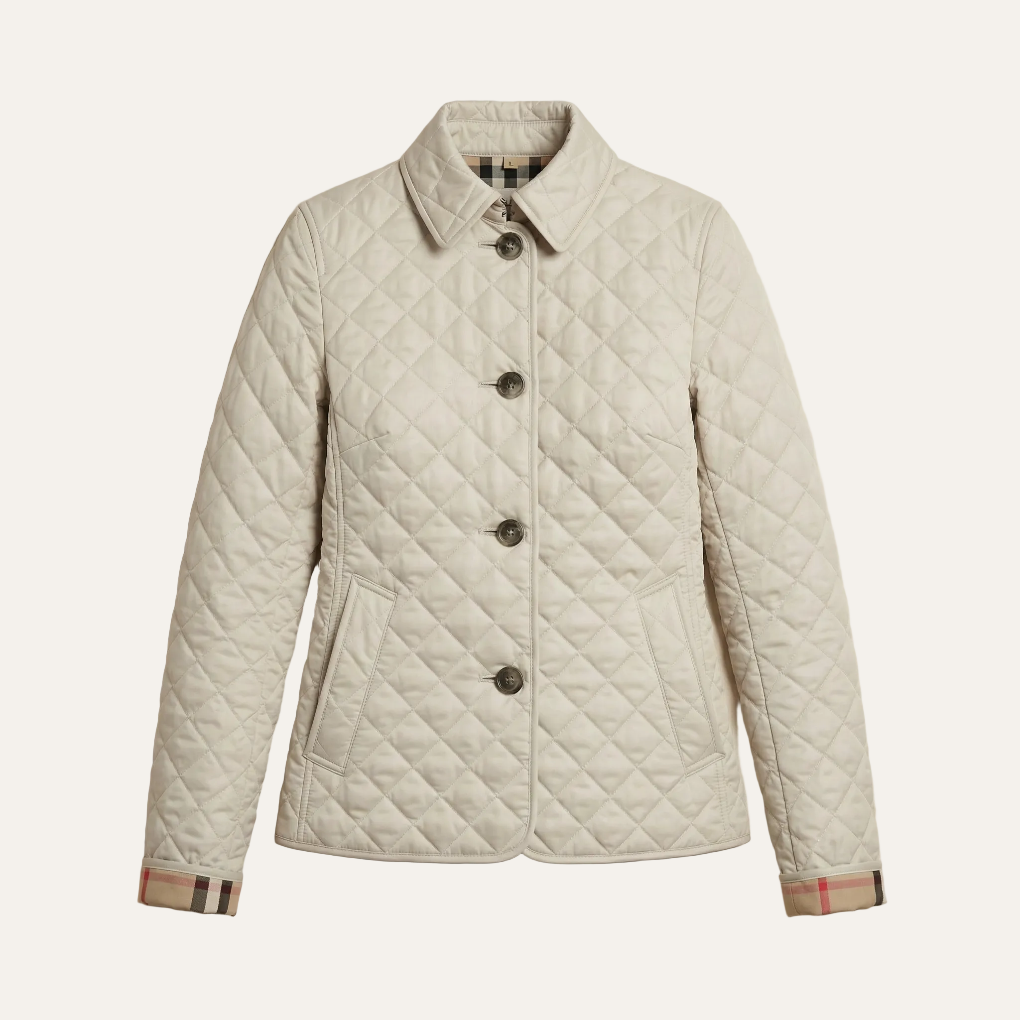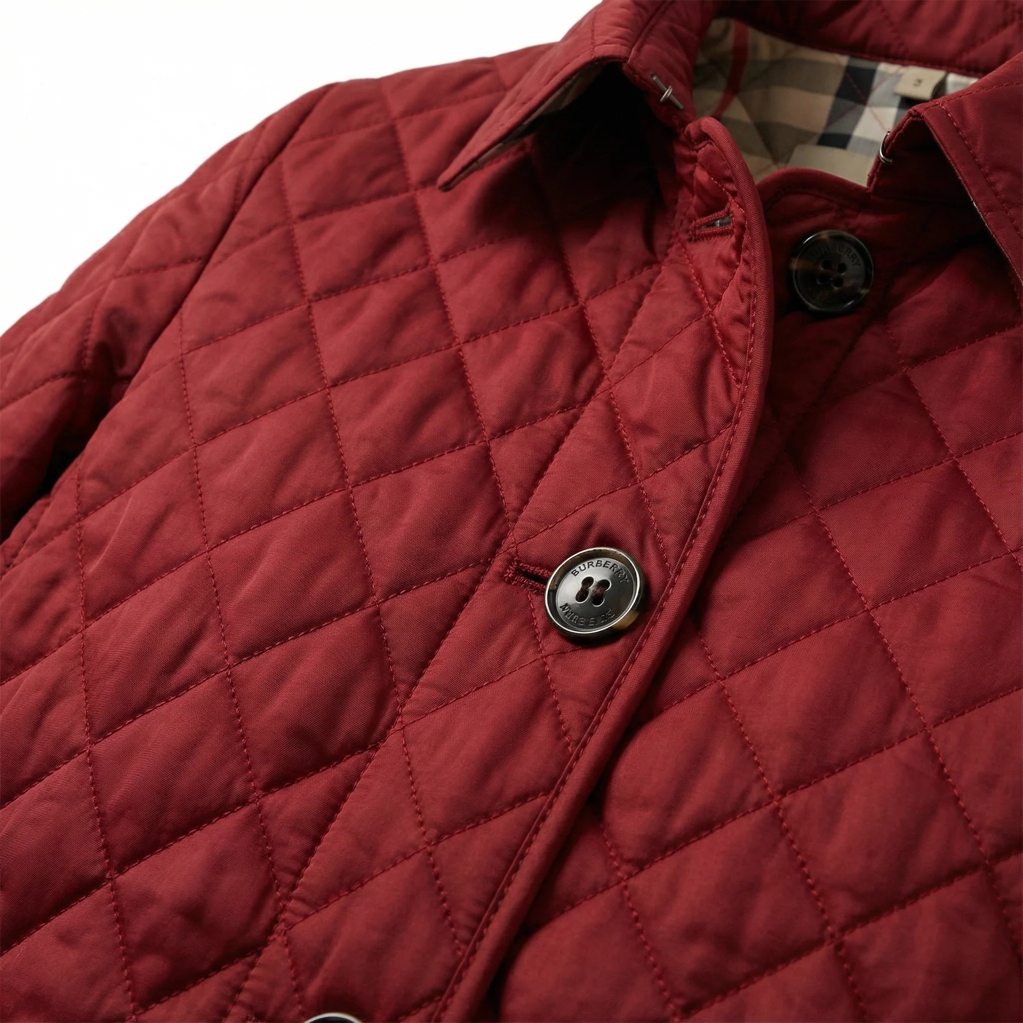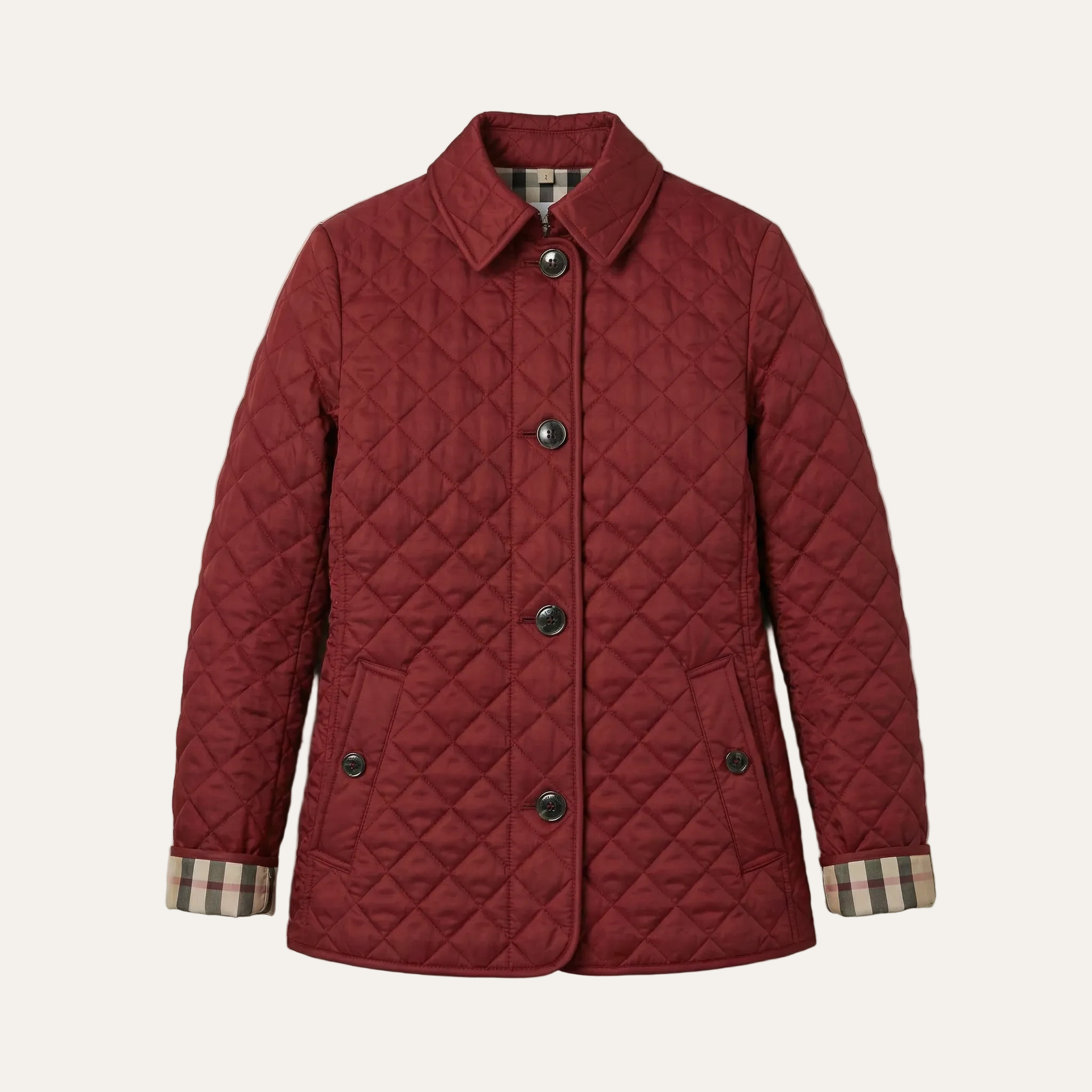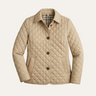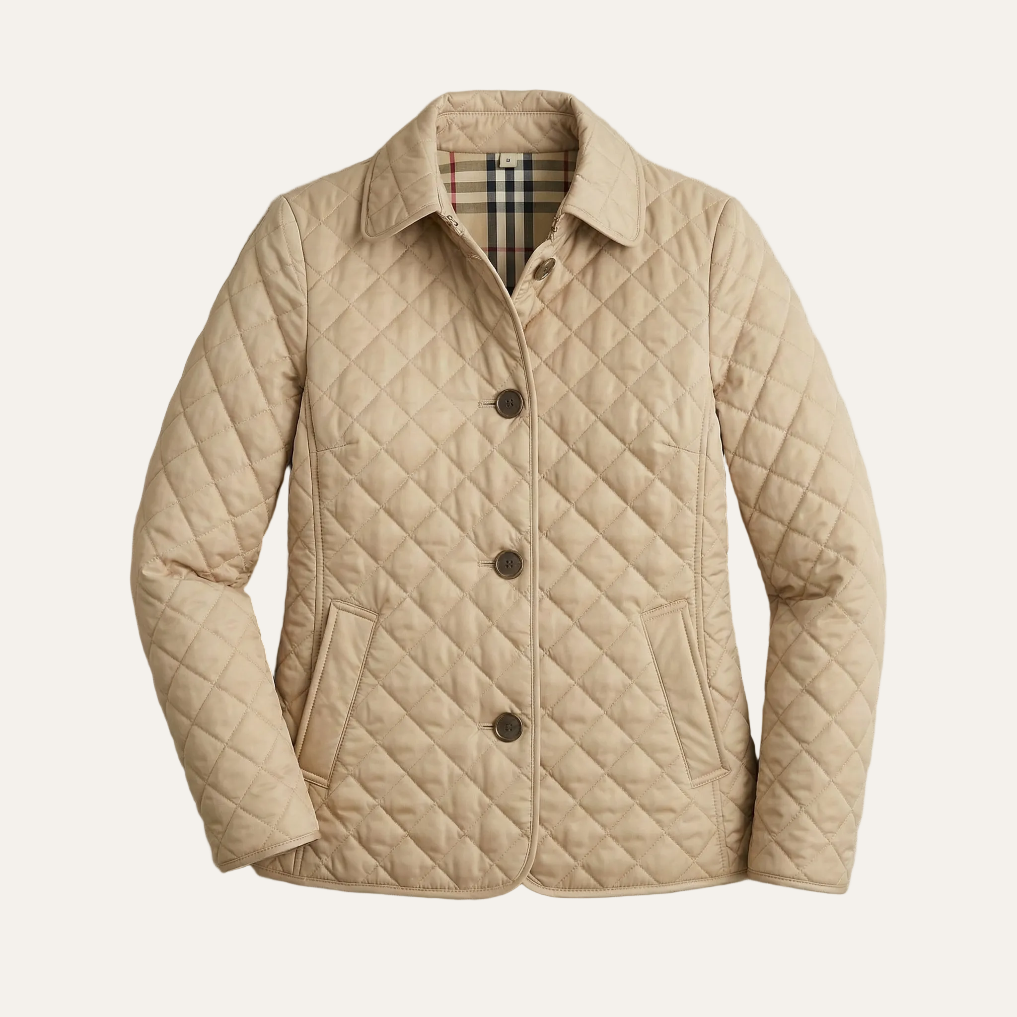 This women’s jacket is designed for everyday outerwear use. It features a quilted exterior with a button-front closure and a stand collar.