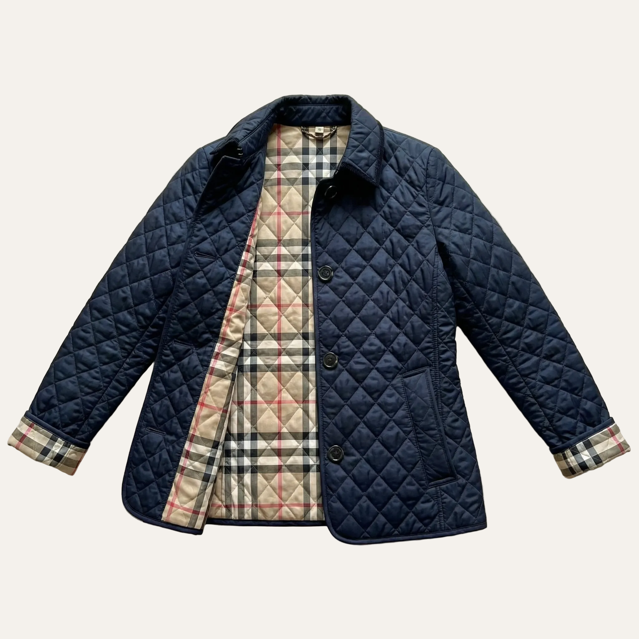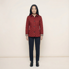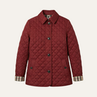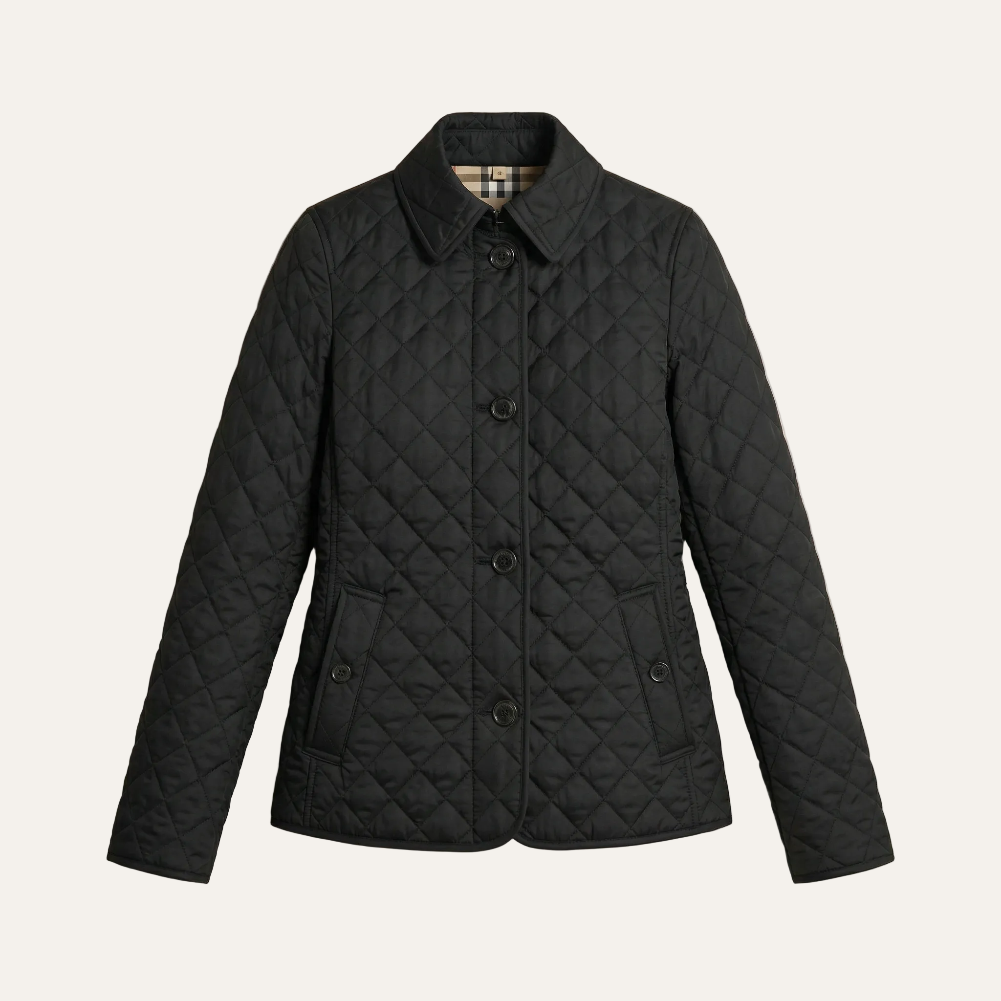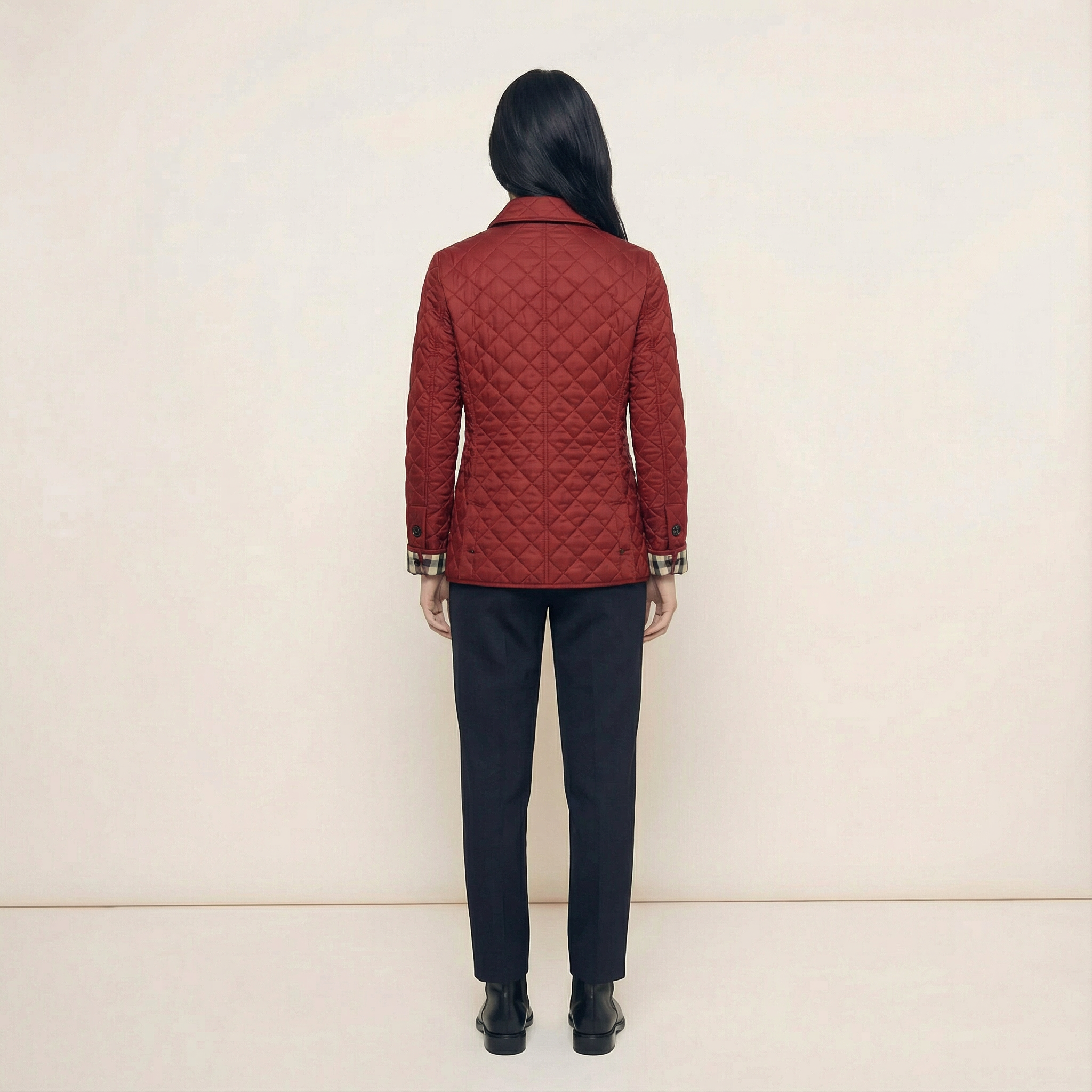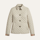 This women’s jacket is designed for everyday outerwear use. It features a quilted exterior with a button-front closure and a stand collar.