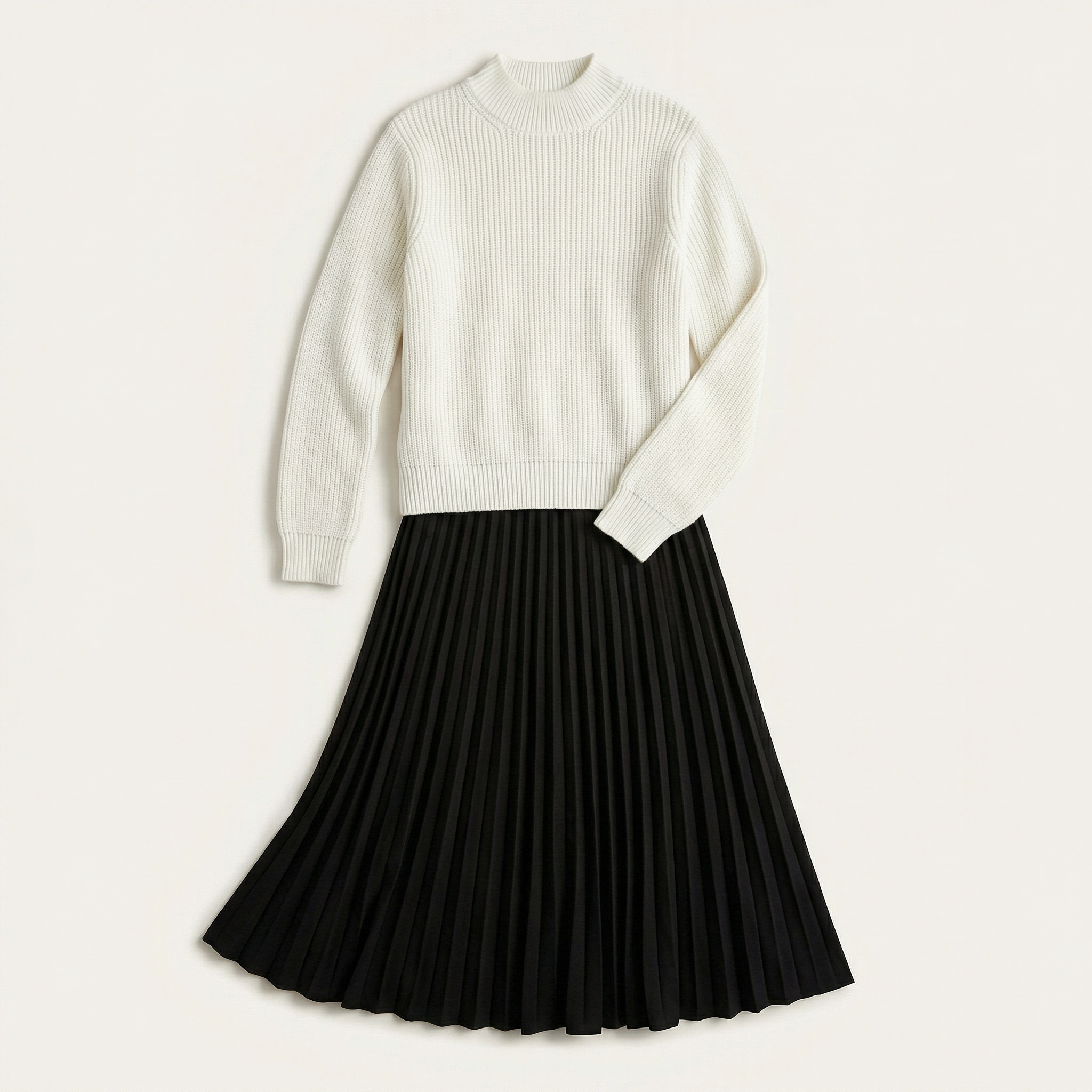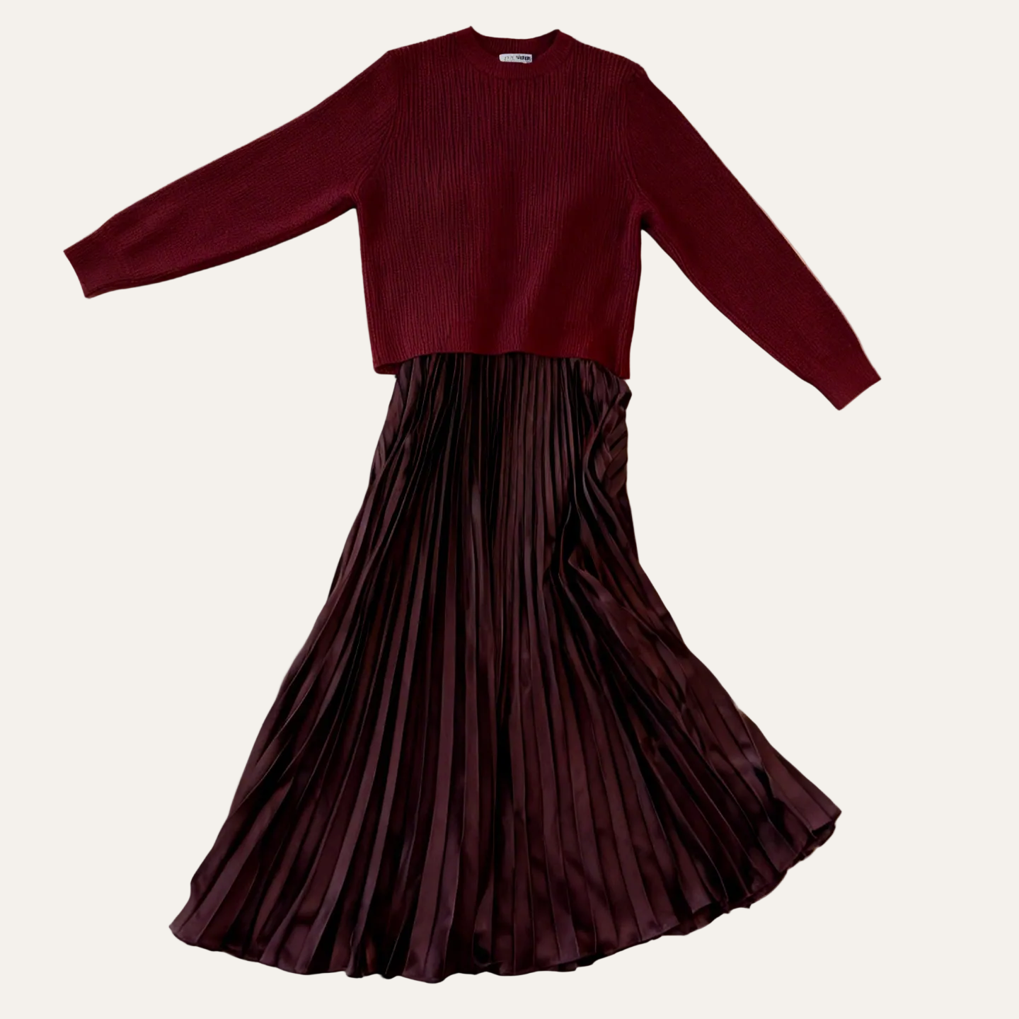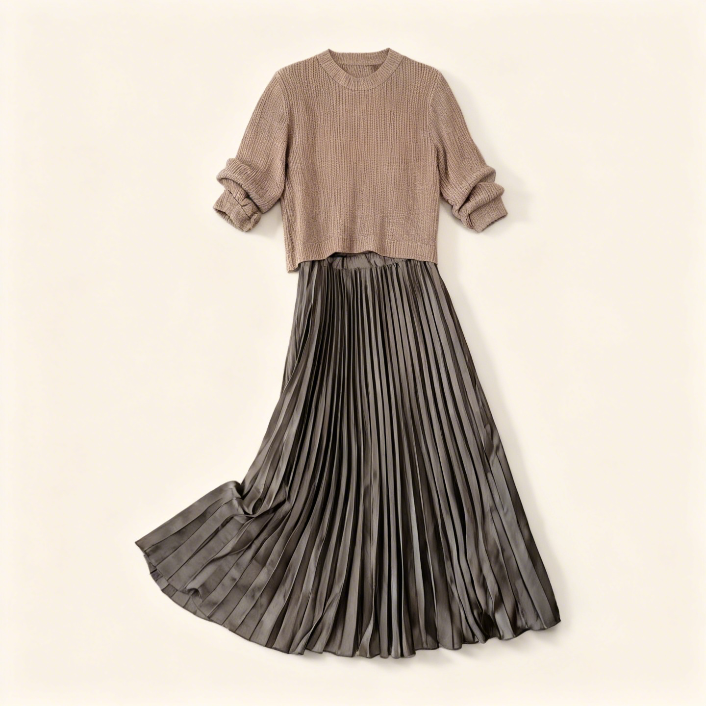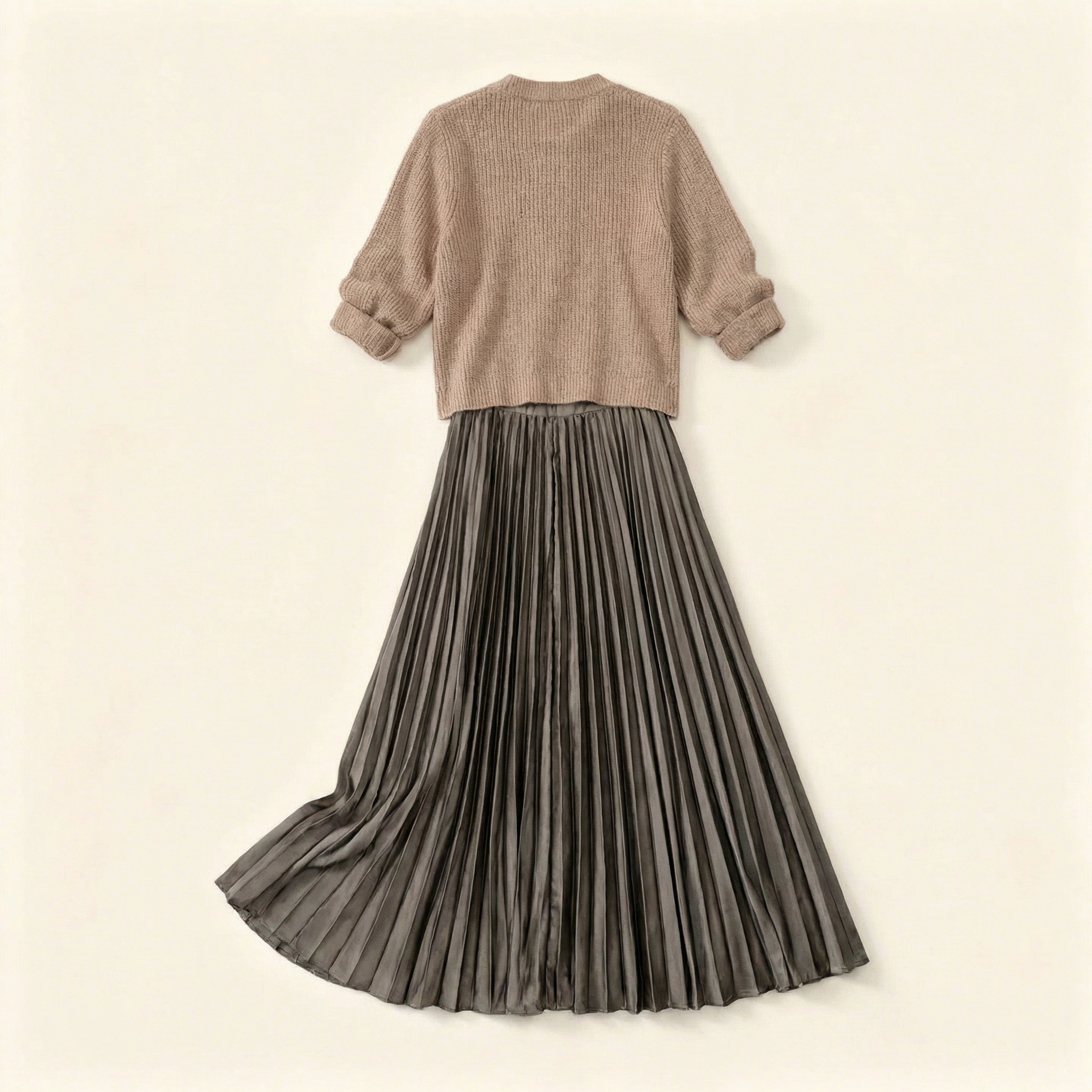 Women’s Two-Piece Set – Long-Sleeve Knit Top and Pleated Midi Skirt