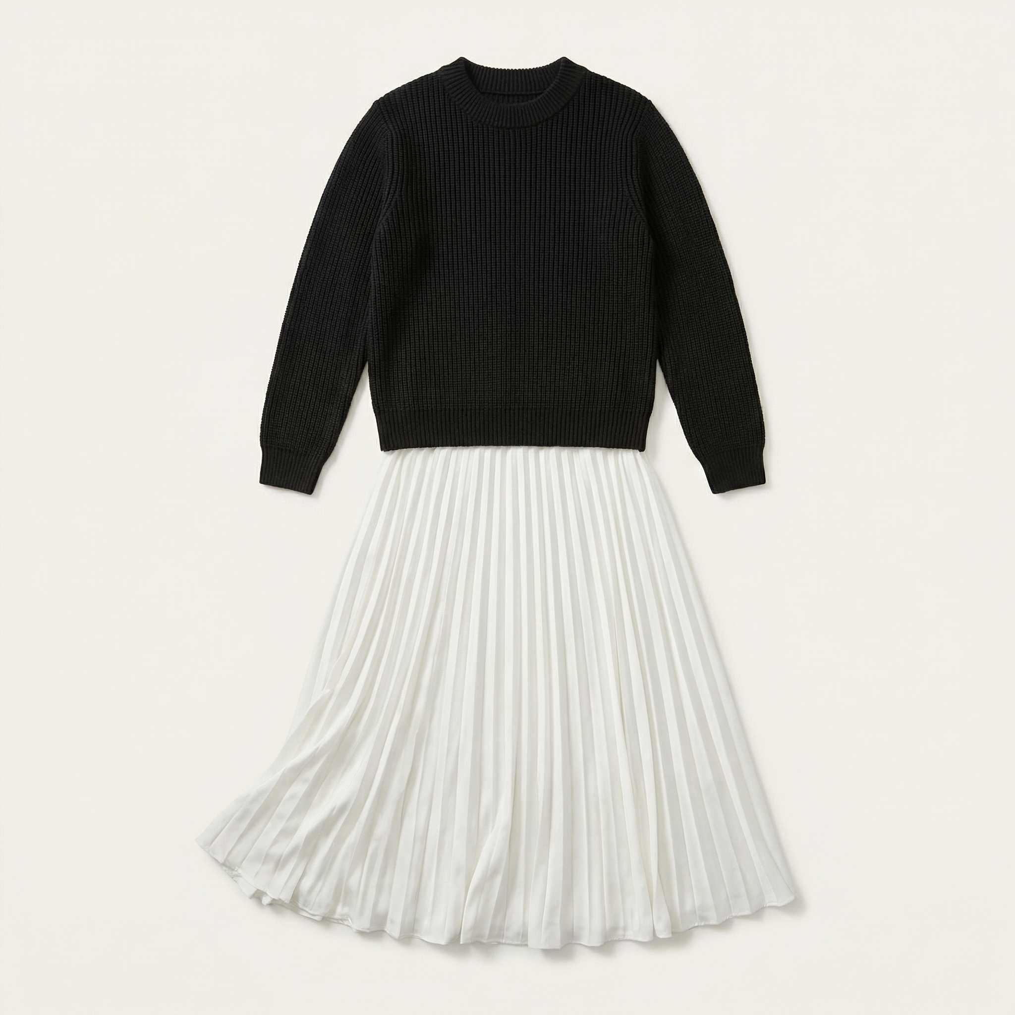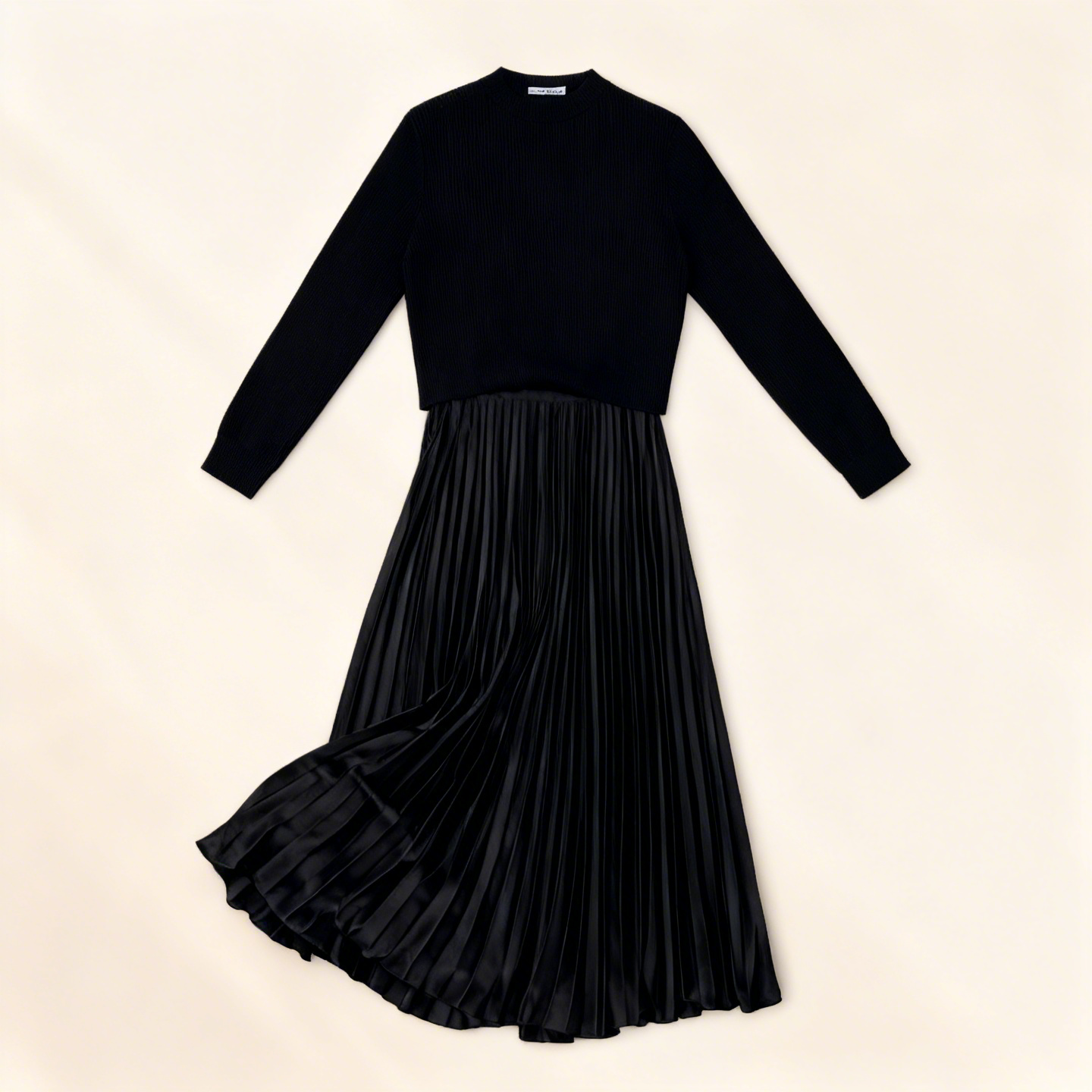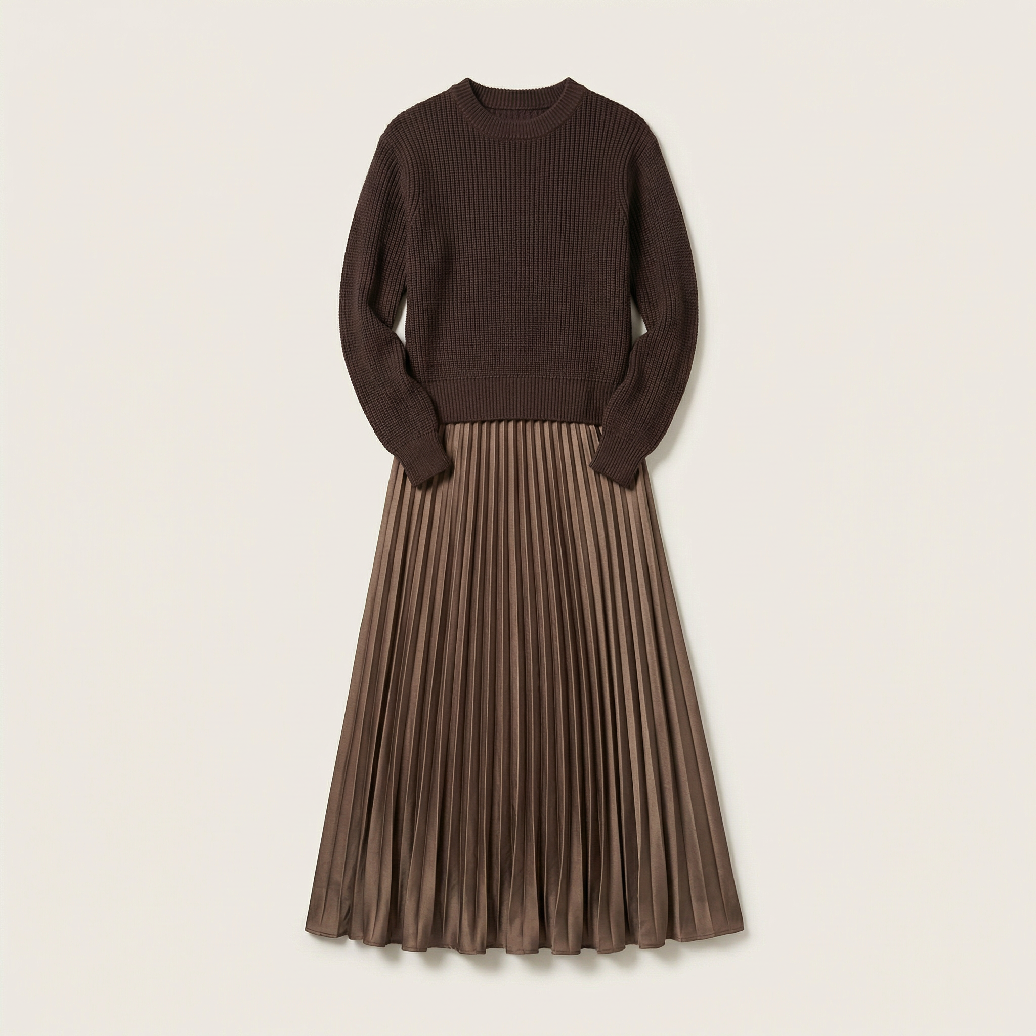 Women’s Two-Piece Set – Long-Sleeve Knit Top and Pleated Midi Skirt