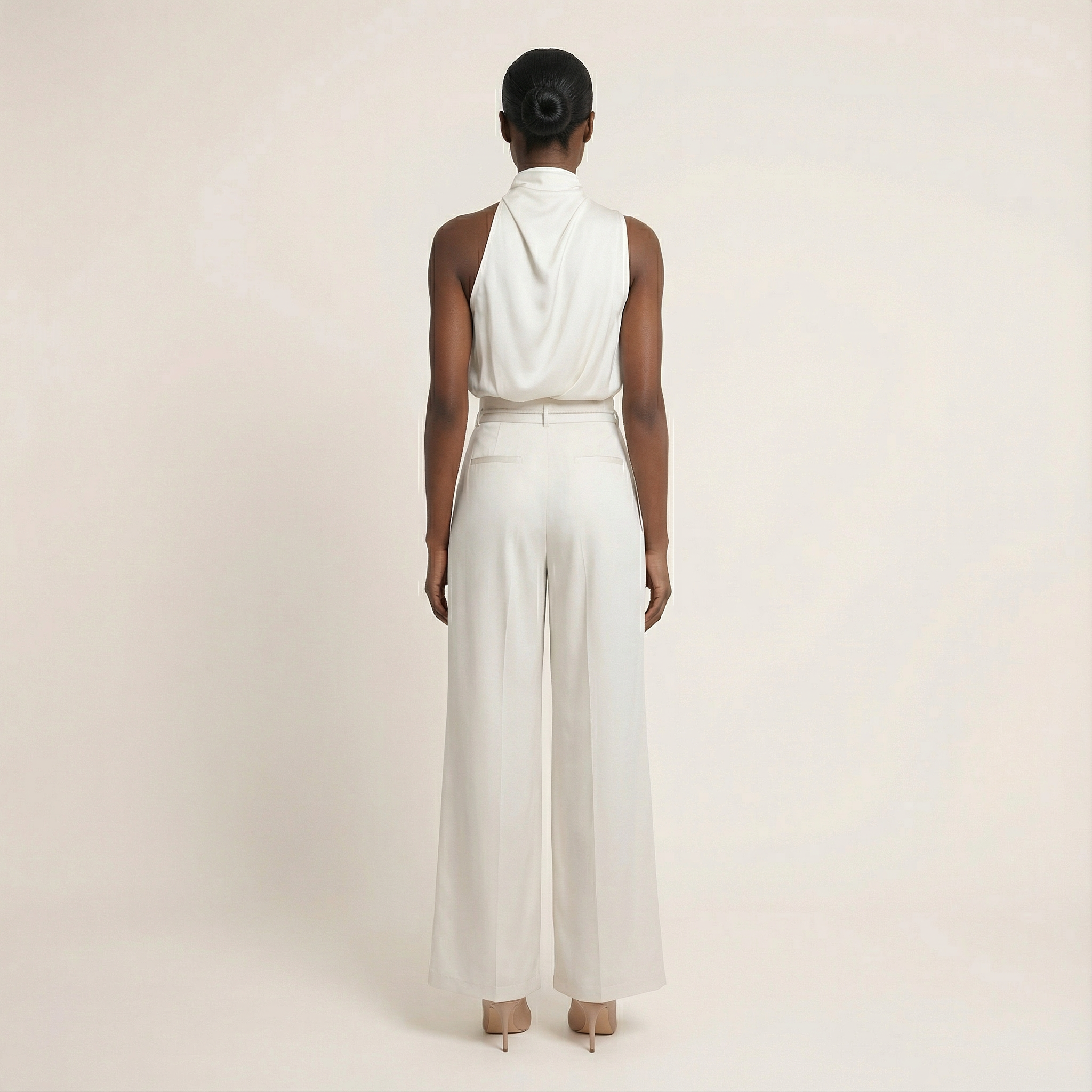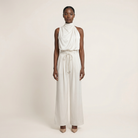 This women’s two-piece outfit set includes a sleeveless high-neck top and matching wide-leg pants. It is designed for everyday or casual wear.