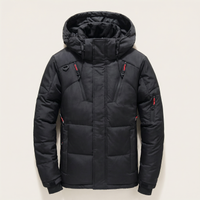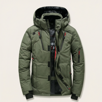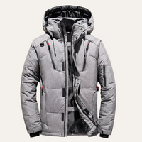 Men’s hooded puffer jacket with a front zipper closure and multiple zippered pockets for outerwear use in cool weather.
