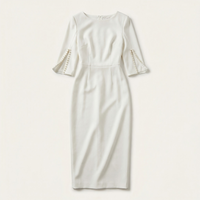 This women’s slim-fit midi dress features a polished silhouette with decorative pearl trim detailing along the sleeve openings. The structured waist seam and fitted shape create a refined look, ideal for formal or professional settings.
