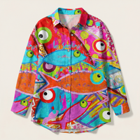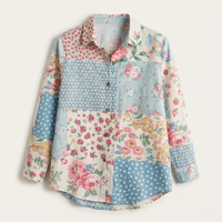 Long-sleeve button-front shirt with a mixed floral and geometric print panel design. Features a pointed collar and a curved hem.