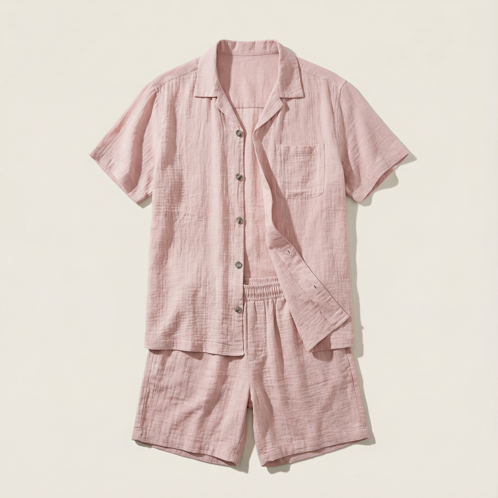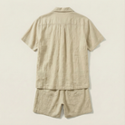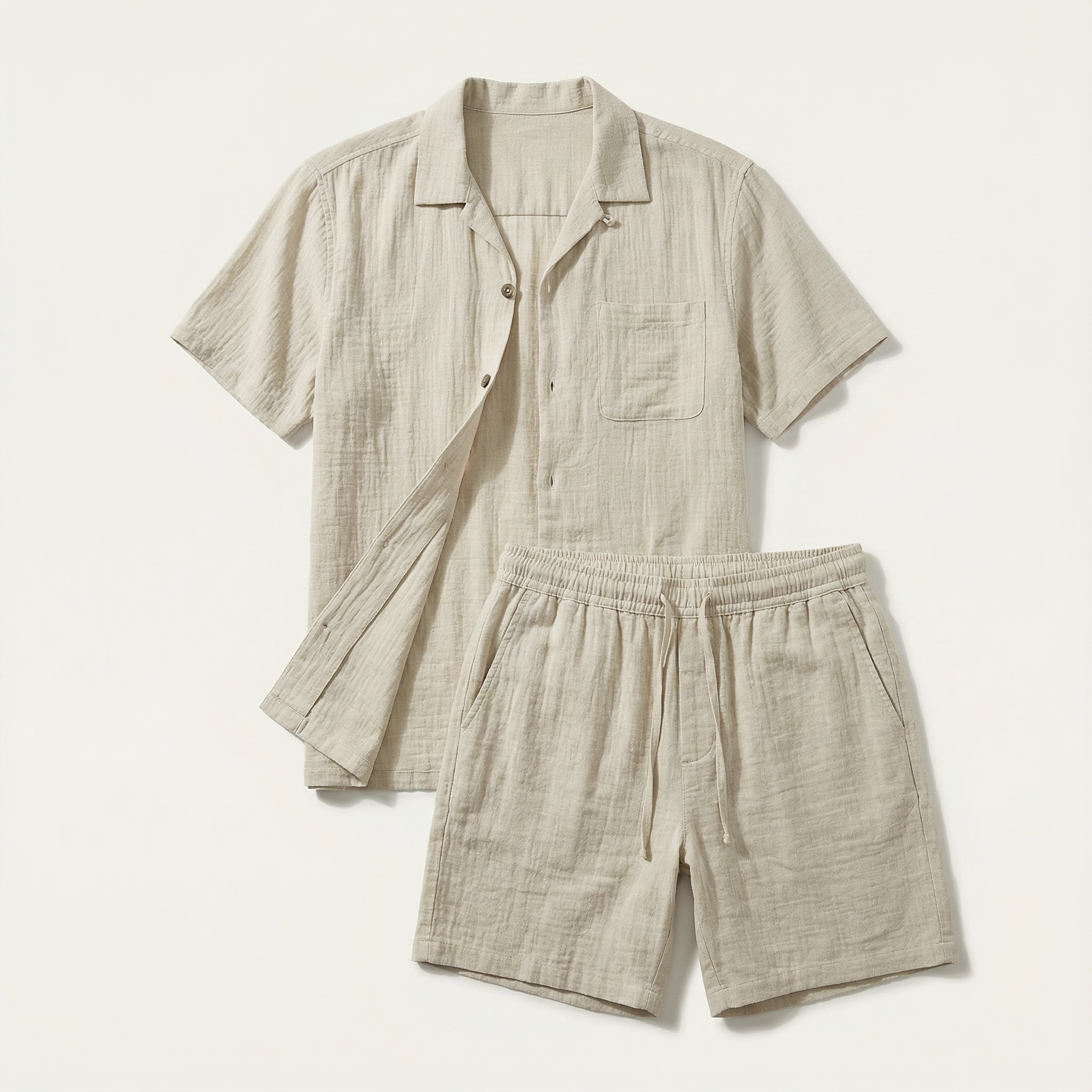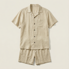 This men’s shirt and shorts set includes a short-sleeve button-up top and matching shorts. The set is designed for coordinated wear as a complete outfit.