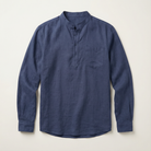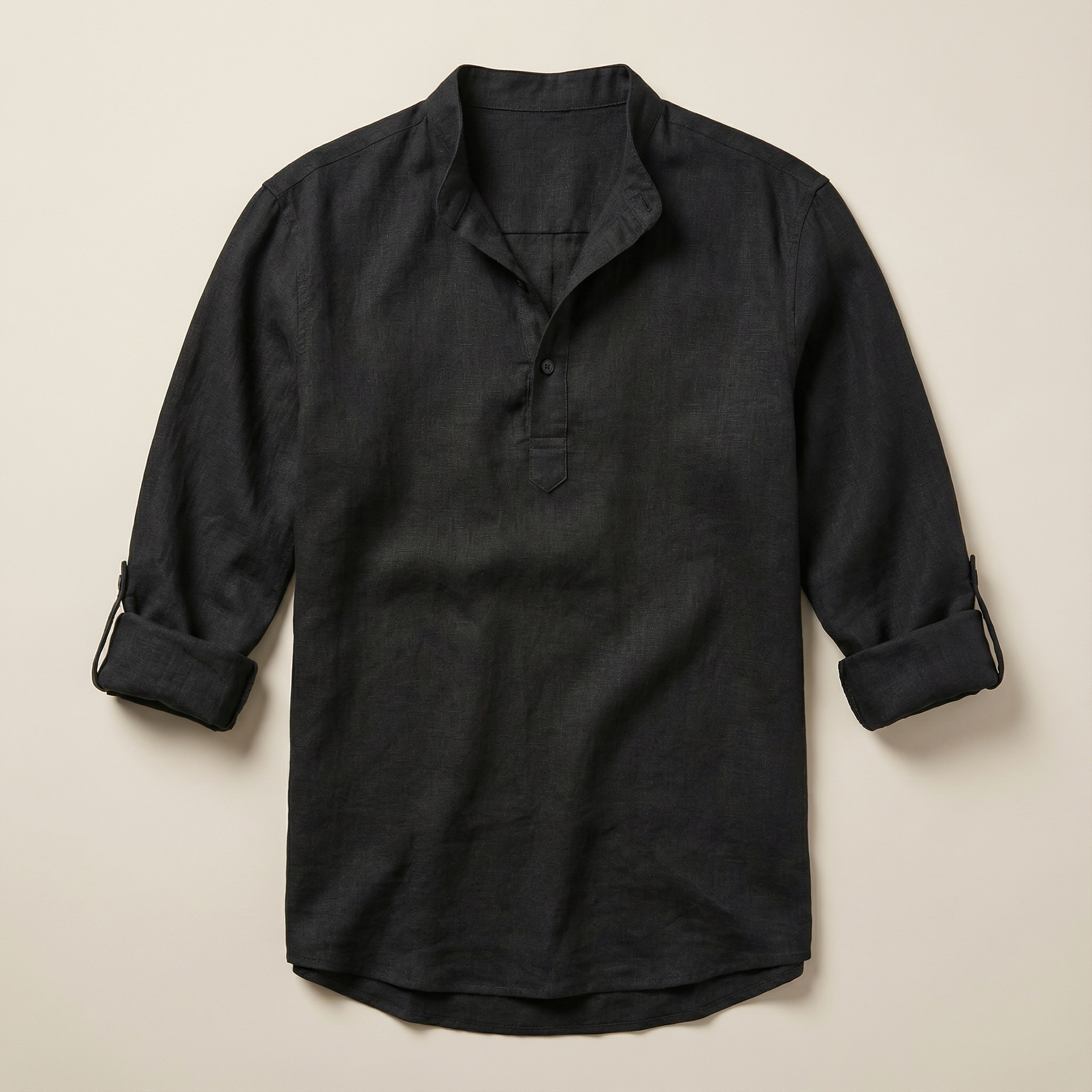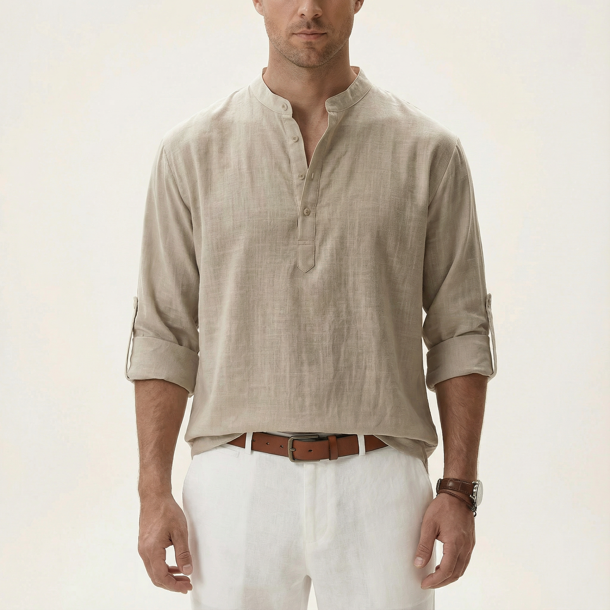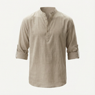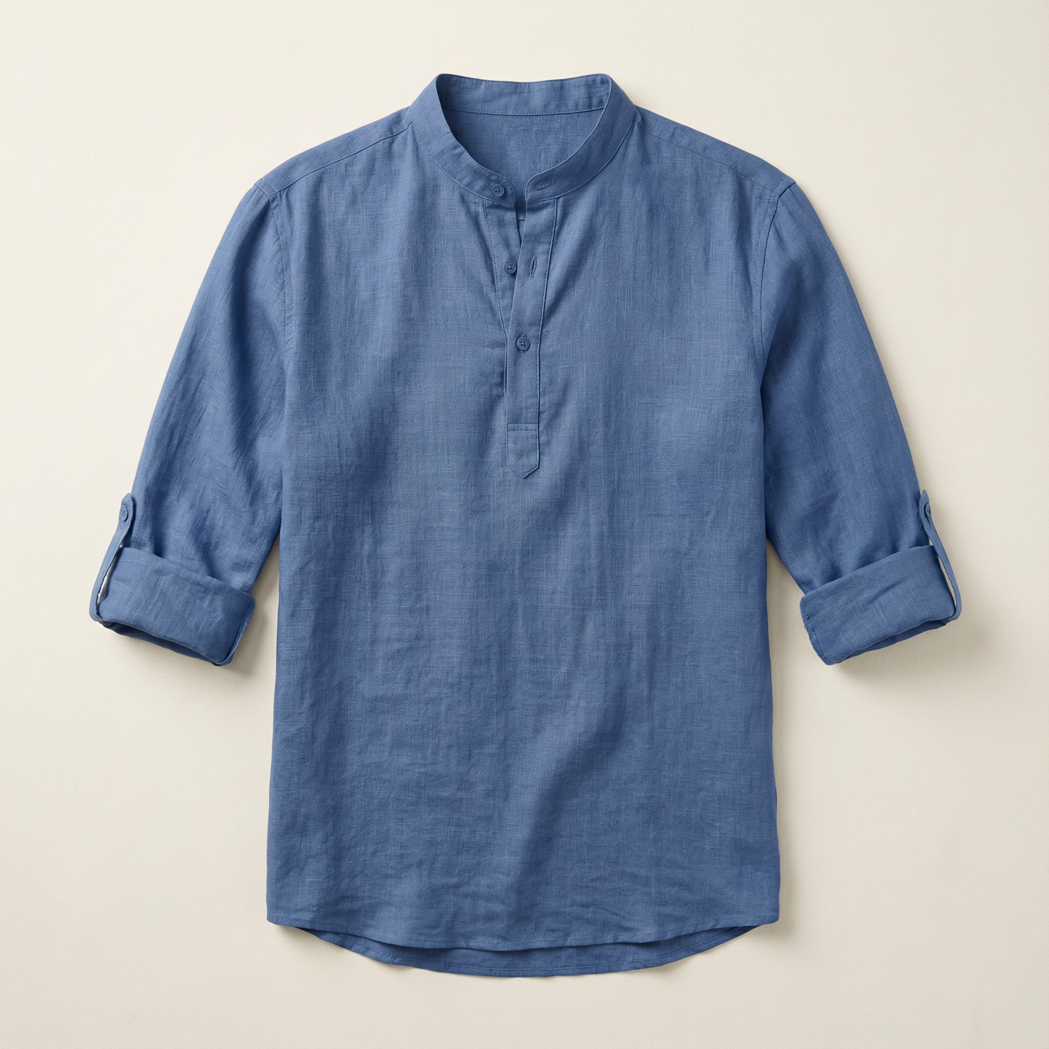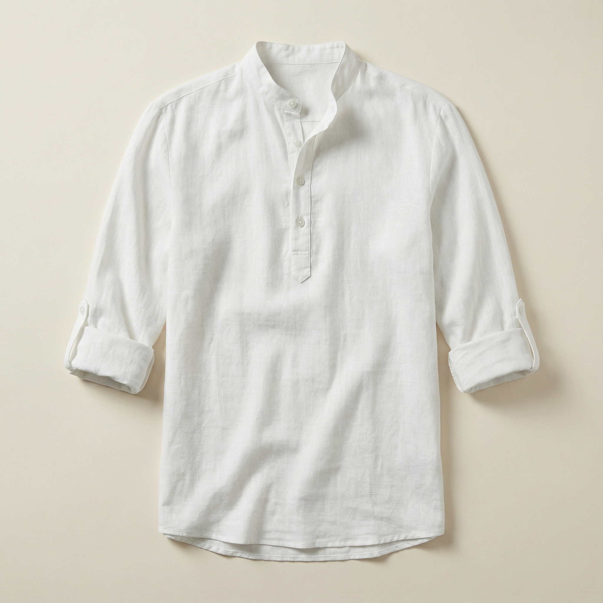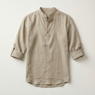This men’s long-sleeve shirt is designed for everyday and warm-weather wear, featuring a simple band collar and partial button front.