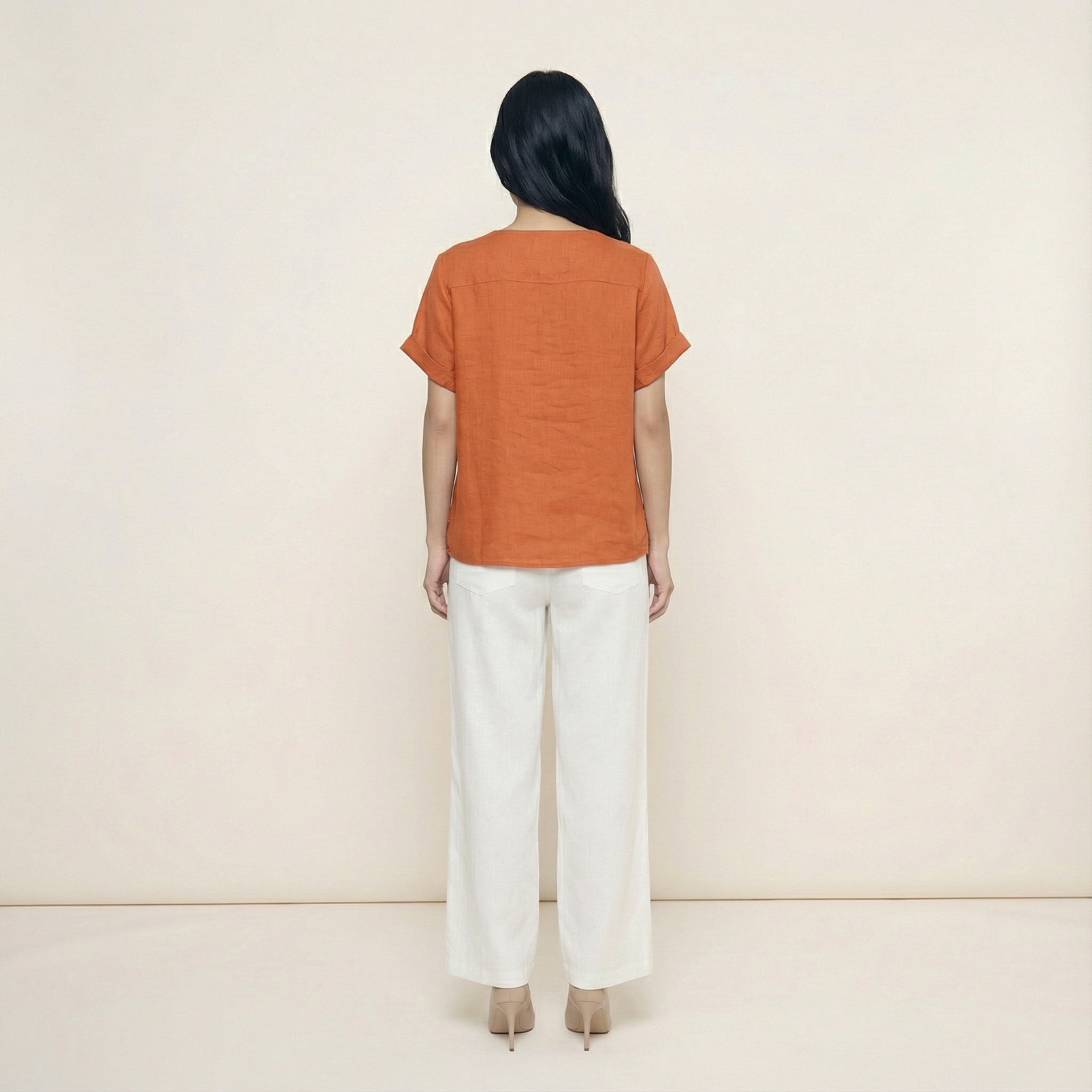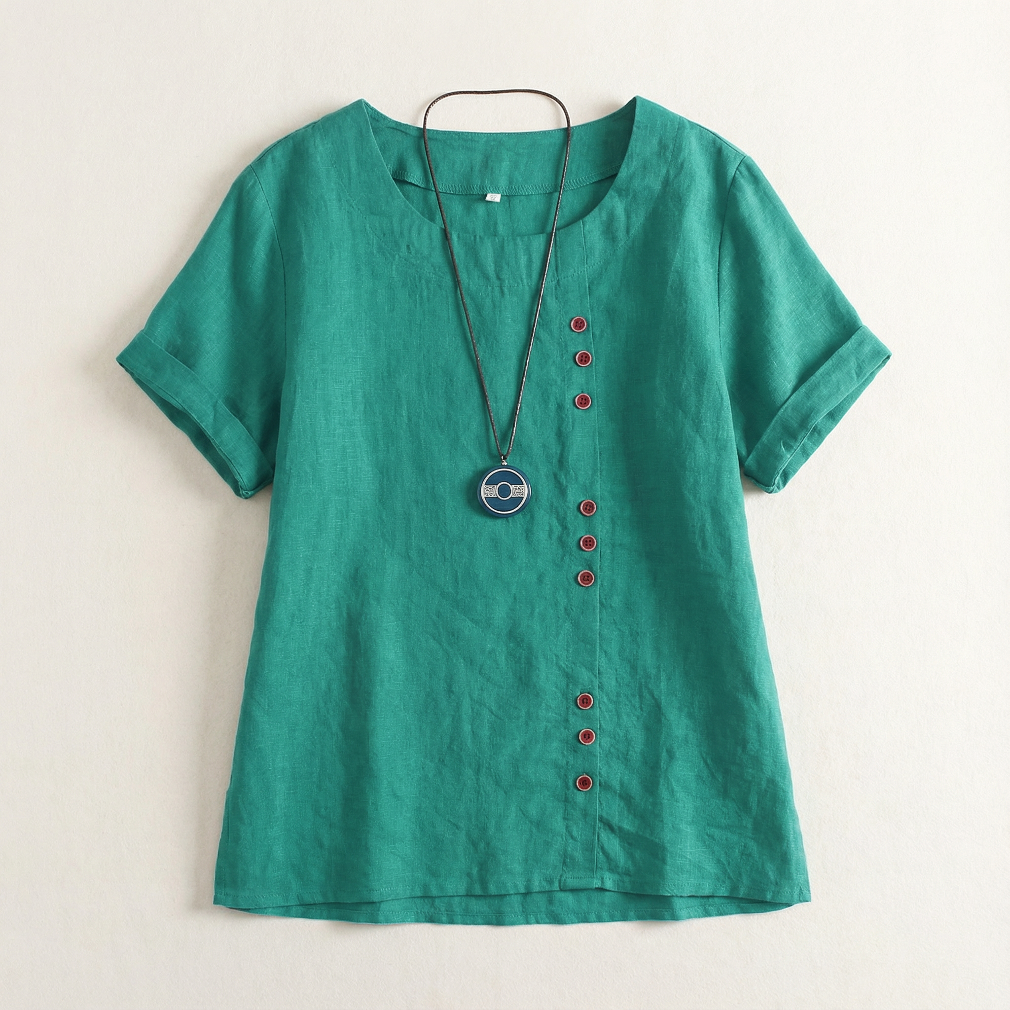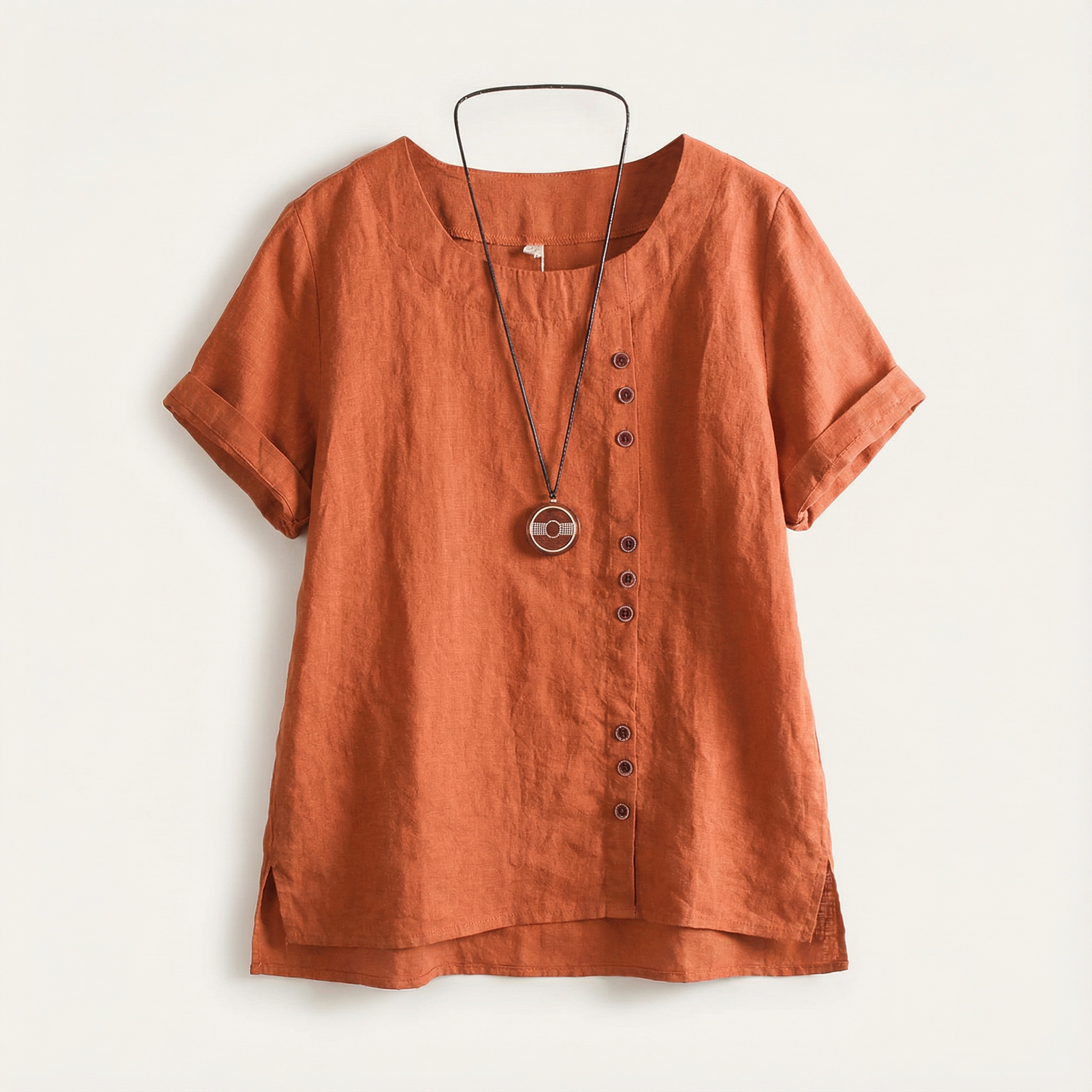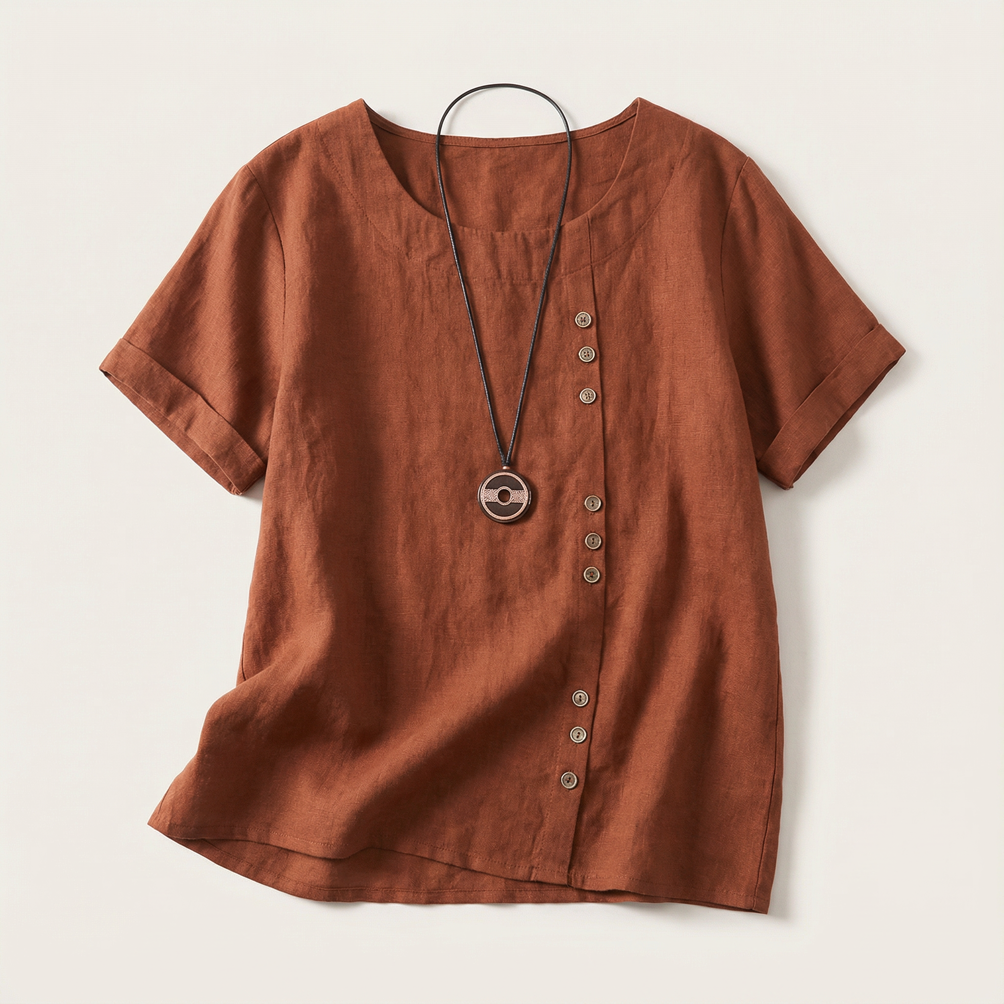 Short-Sleeve Top for Women – Asymmetric Hem, Button Detail