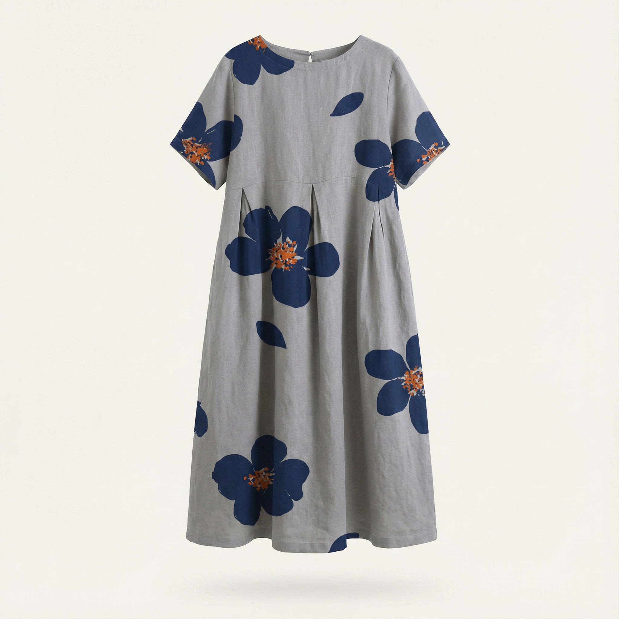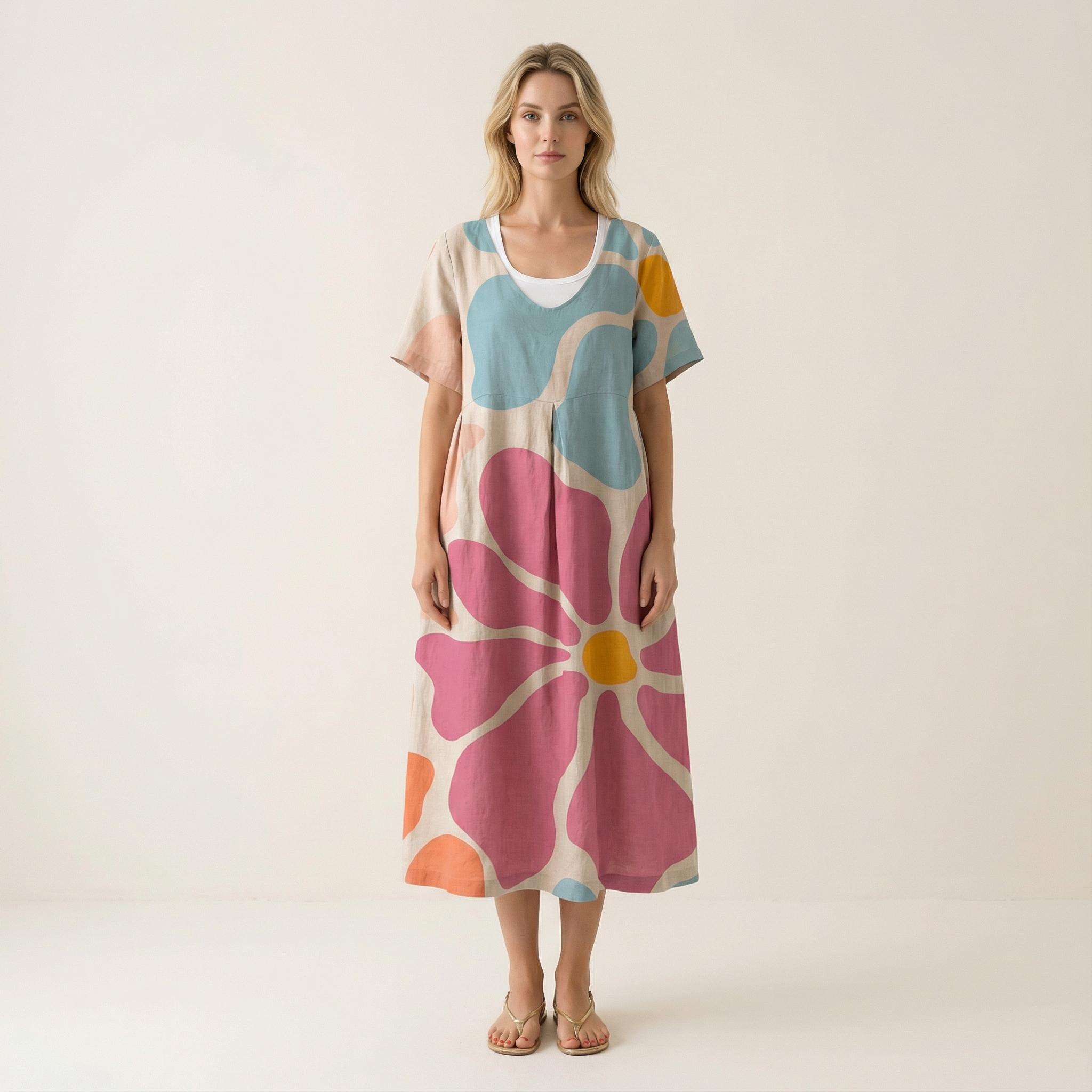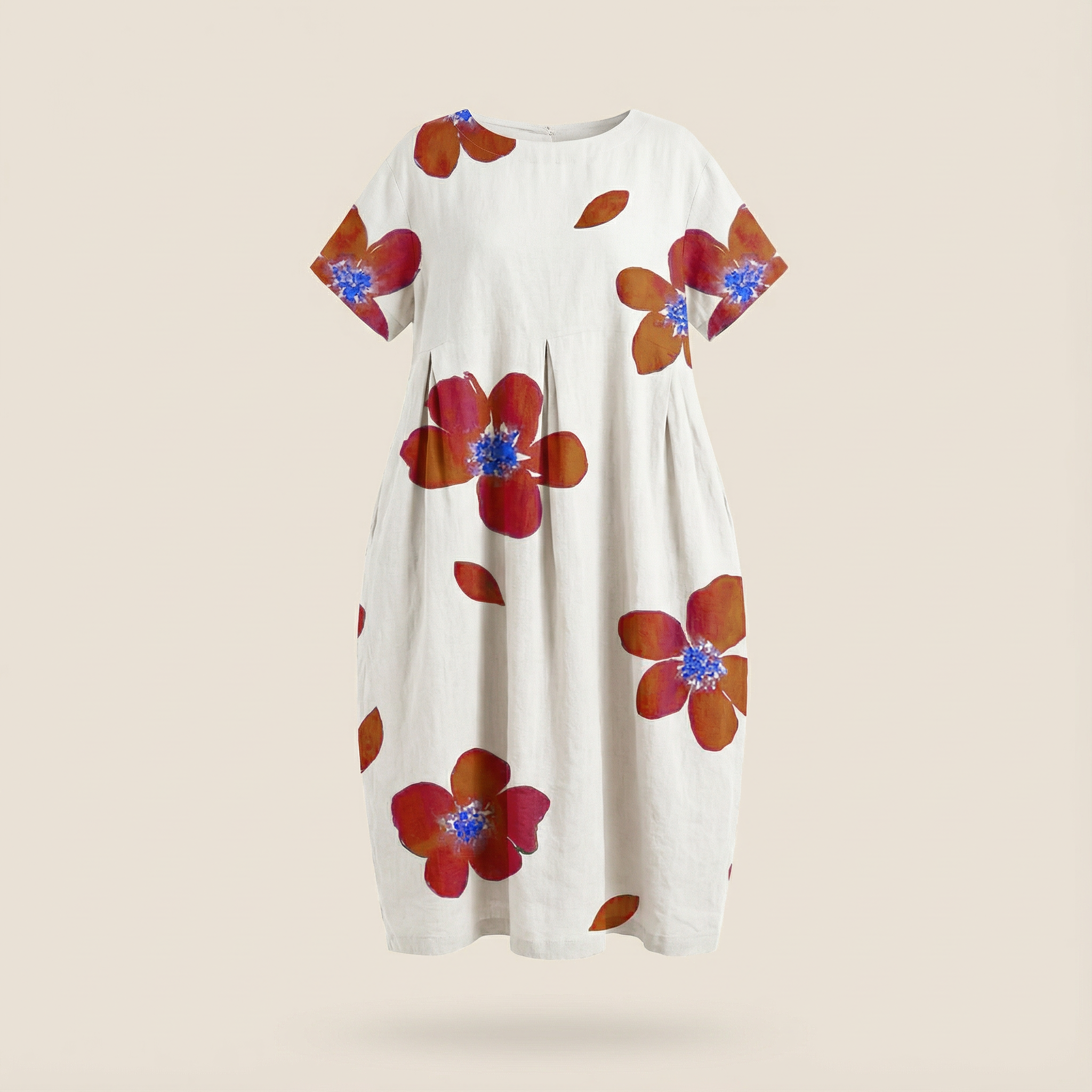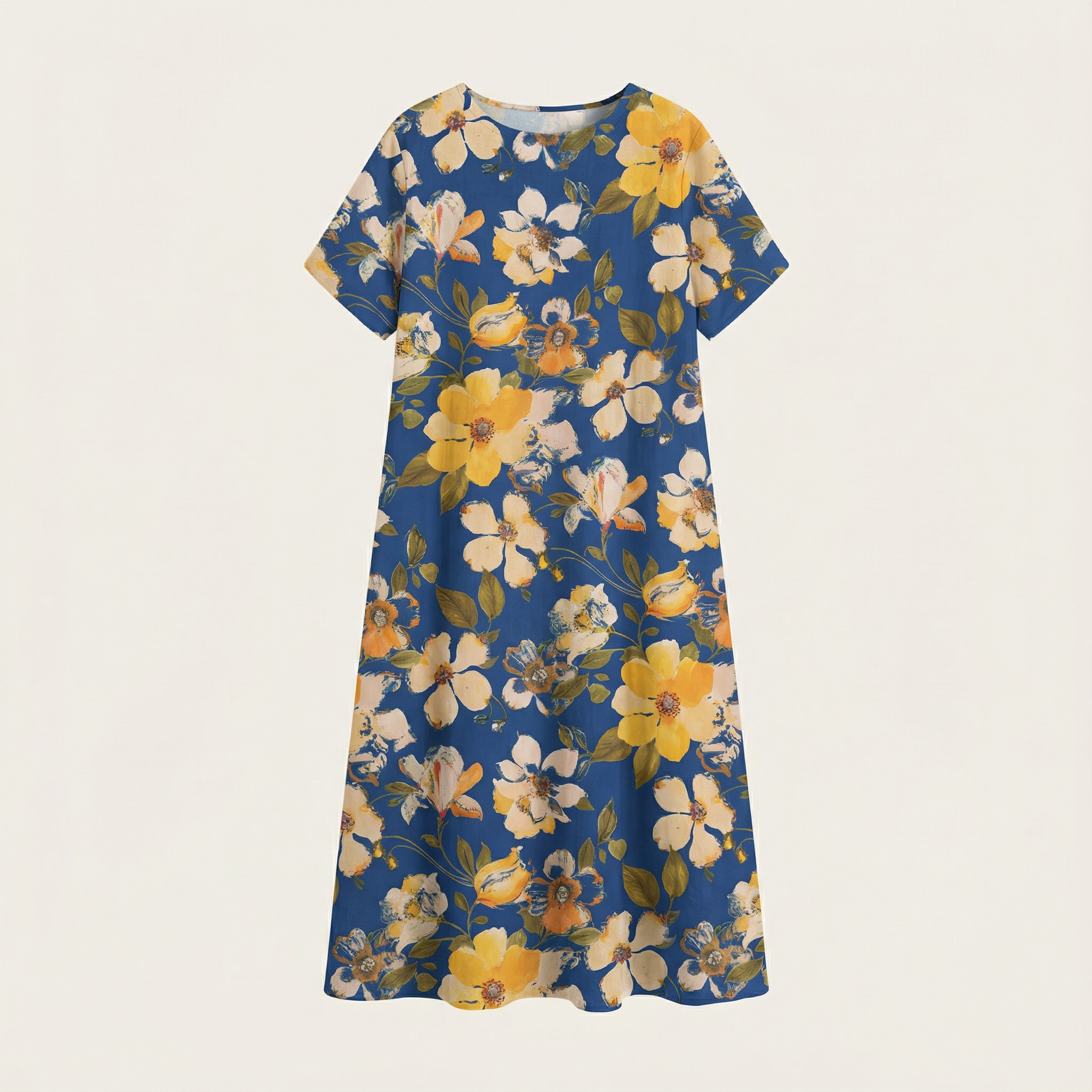 Women’s Midi Dress – Short Sleeves, Floral Print, Loose Fit