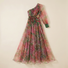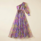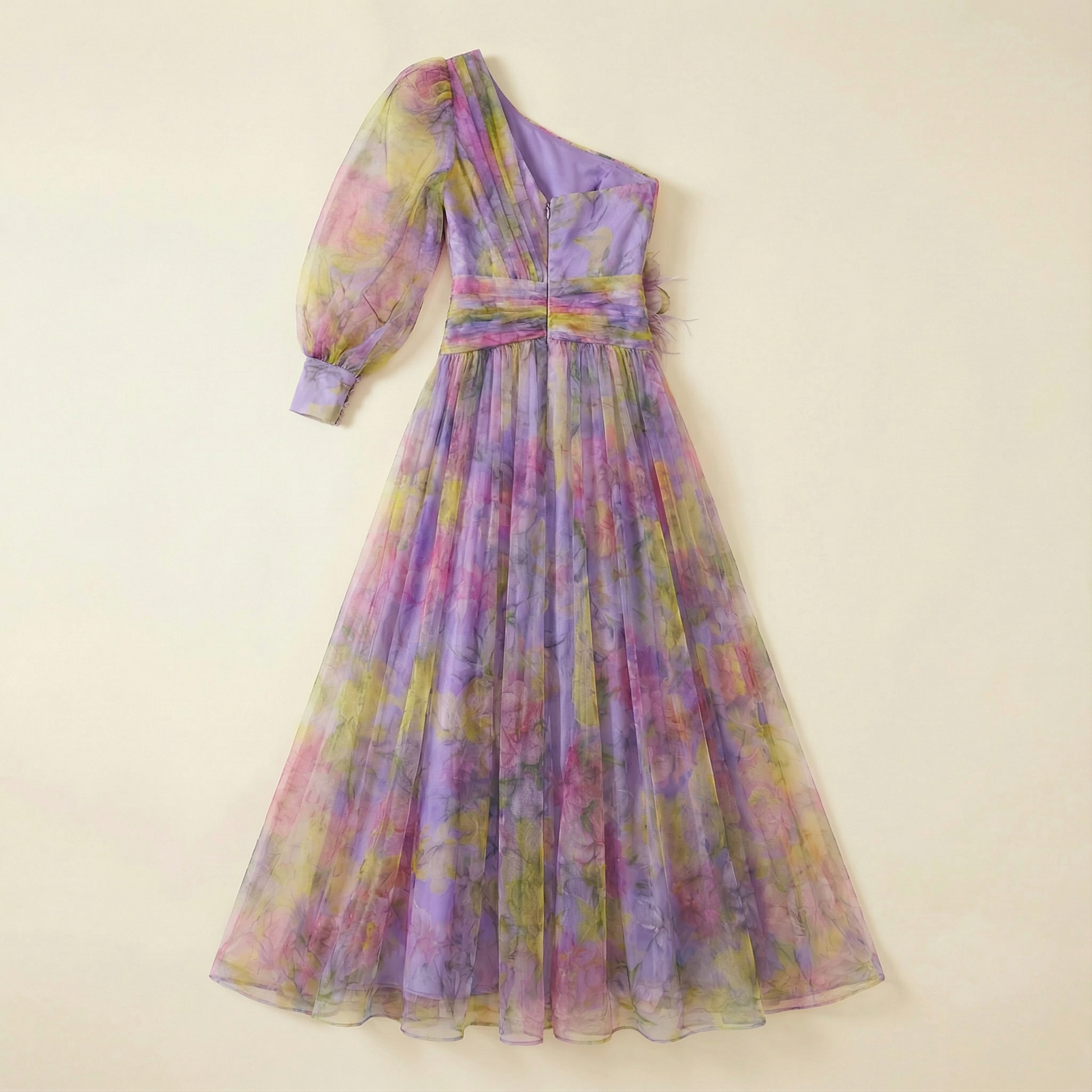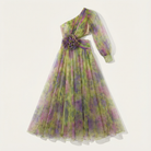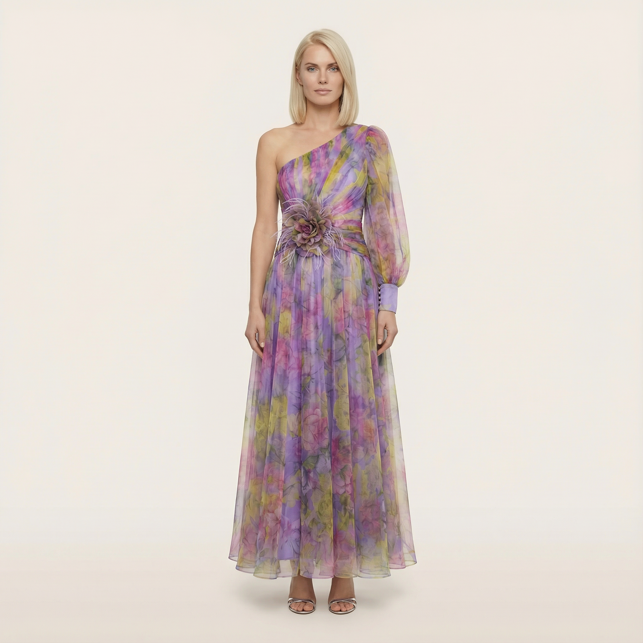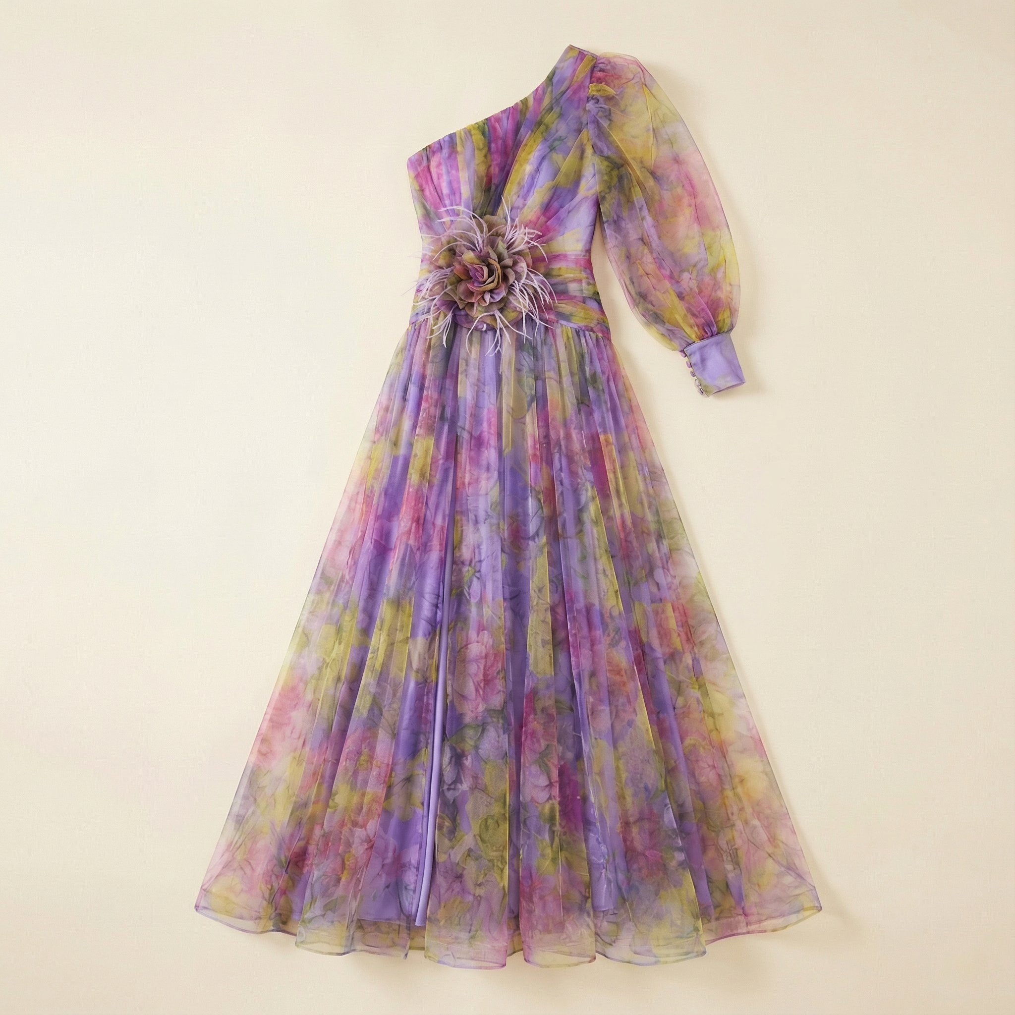 This women’s off-shoulder dress features a full-length silhouette with a colorful, semi-sheer overlay.