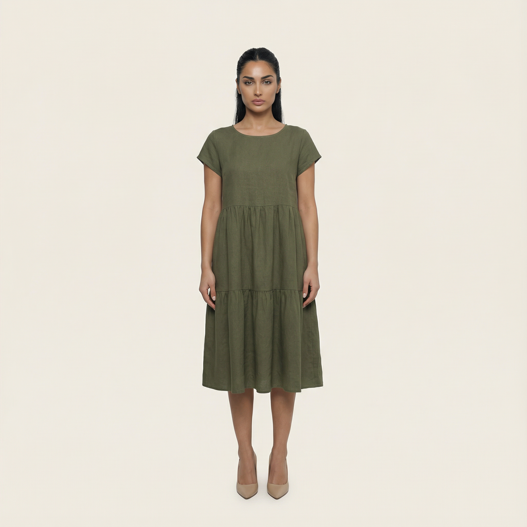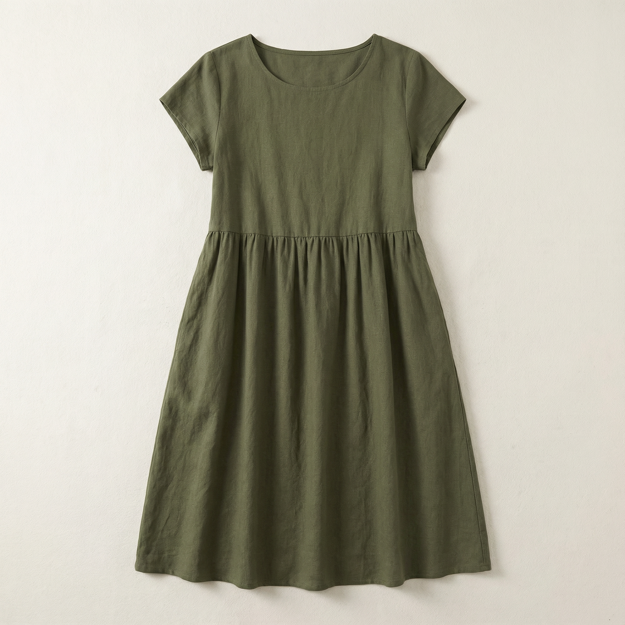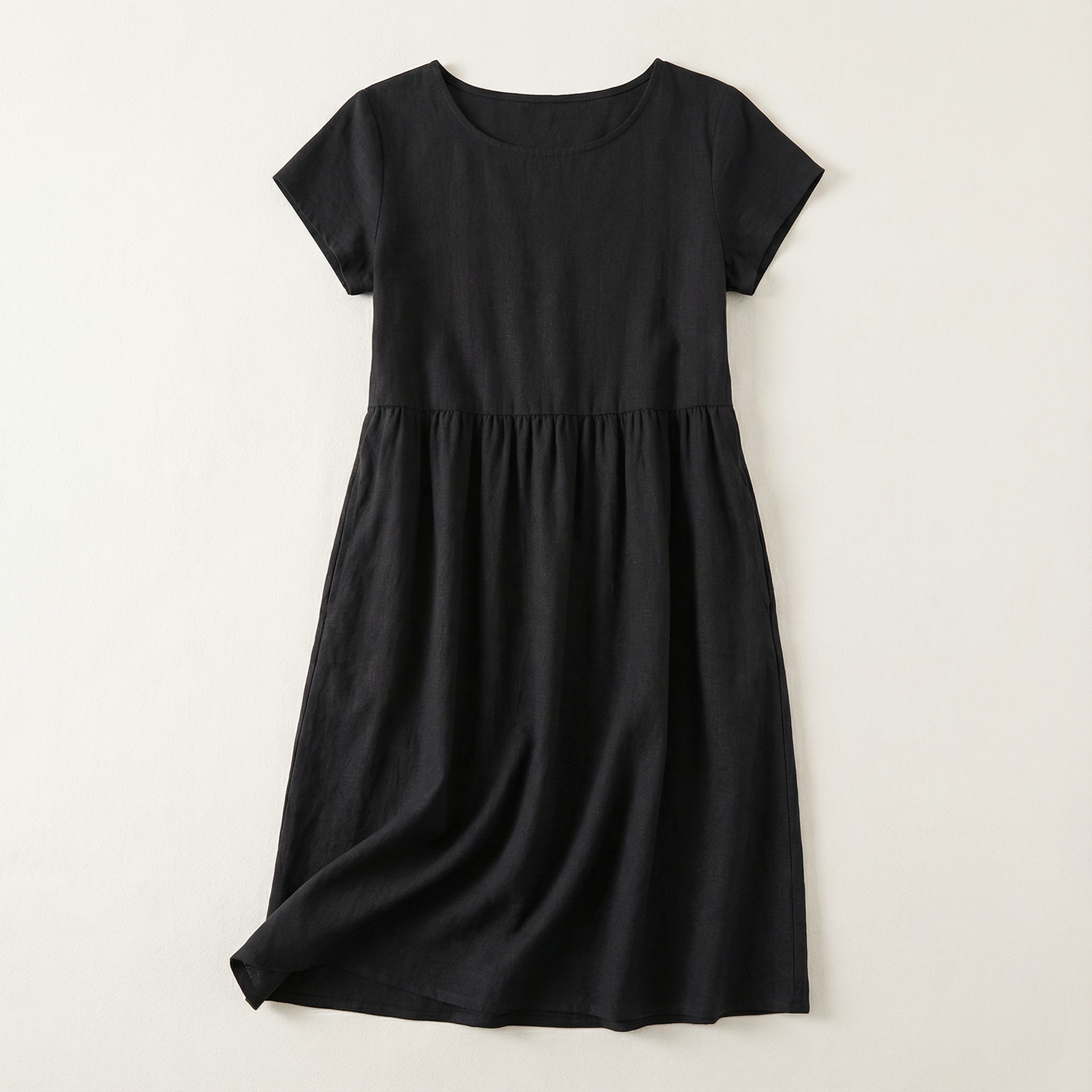 This women’s dress is designed for everyday and casual wear. It features a simple round neckline and a knee-length cut.