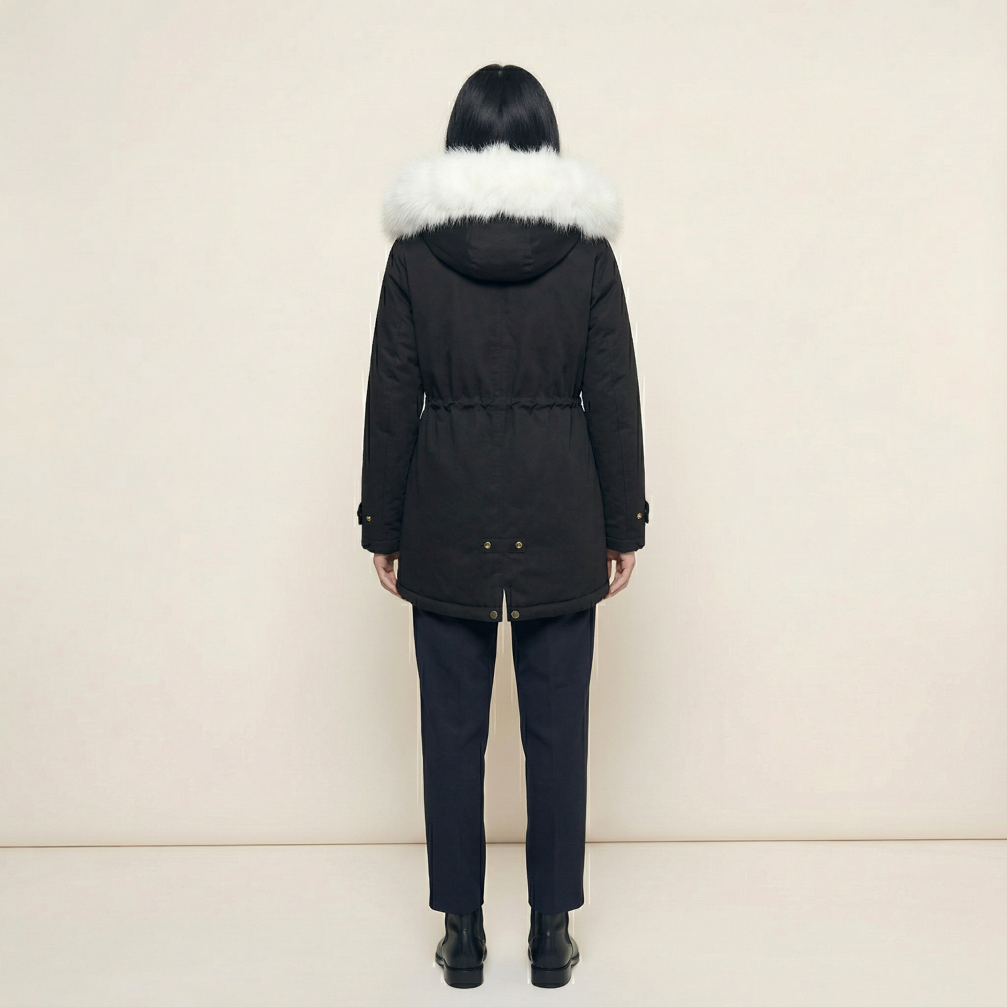 Women’s Mid-Length Hooded Coat – Faux Fur Collar, Button and Zip Closure