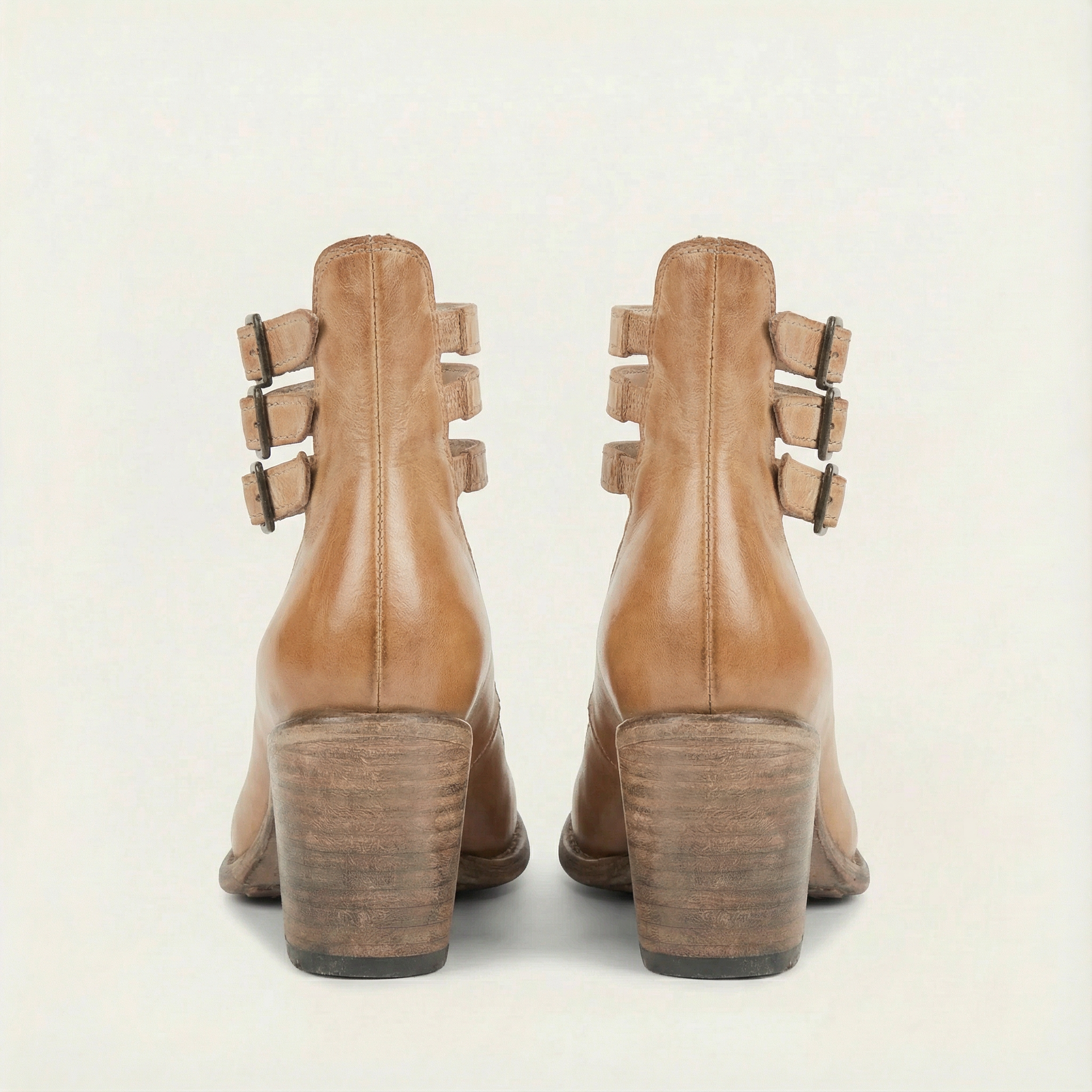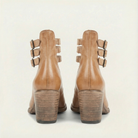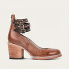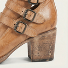 Women’s ankle-height boots with a closed-toe design, block heel, and buckle strap closure.
