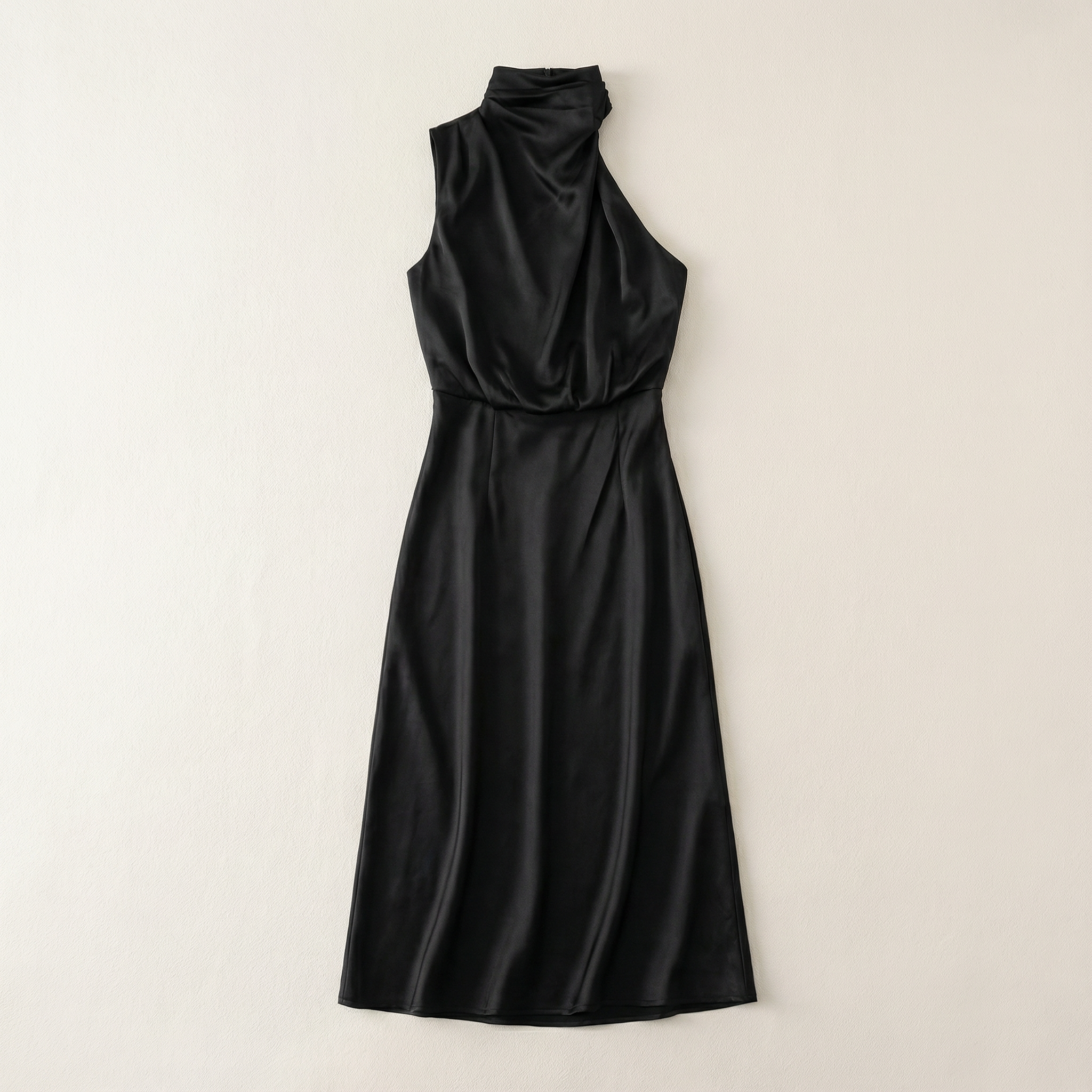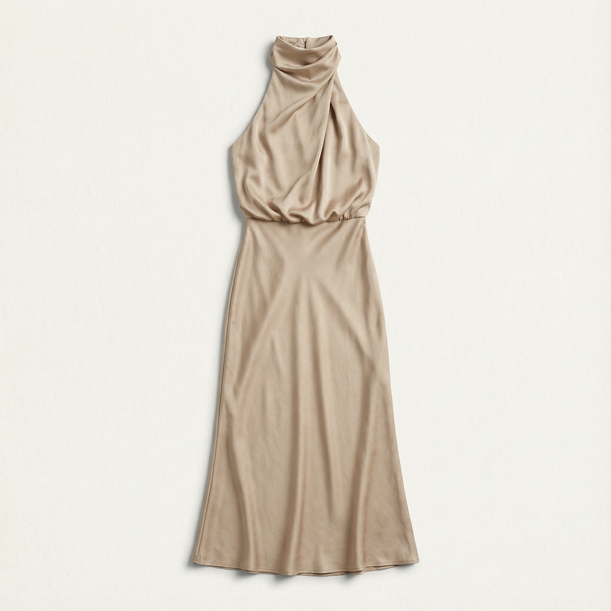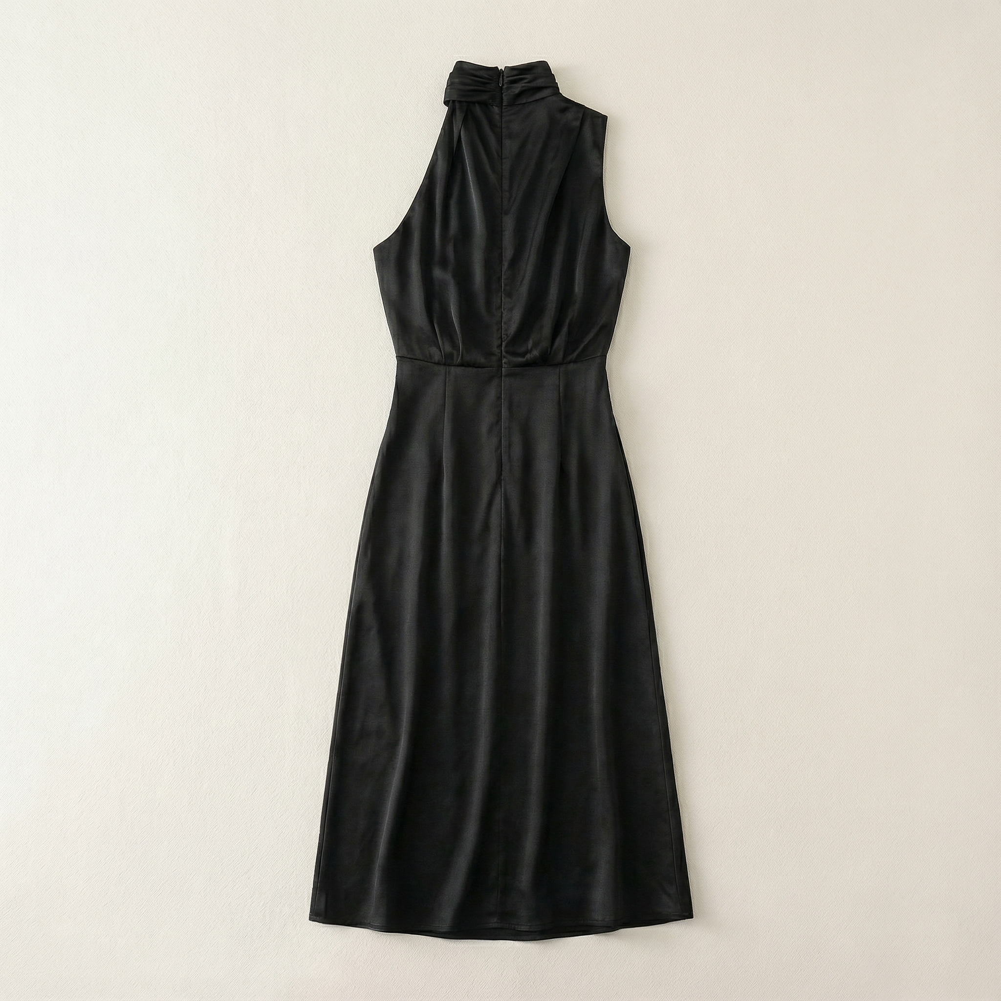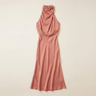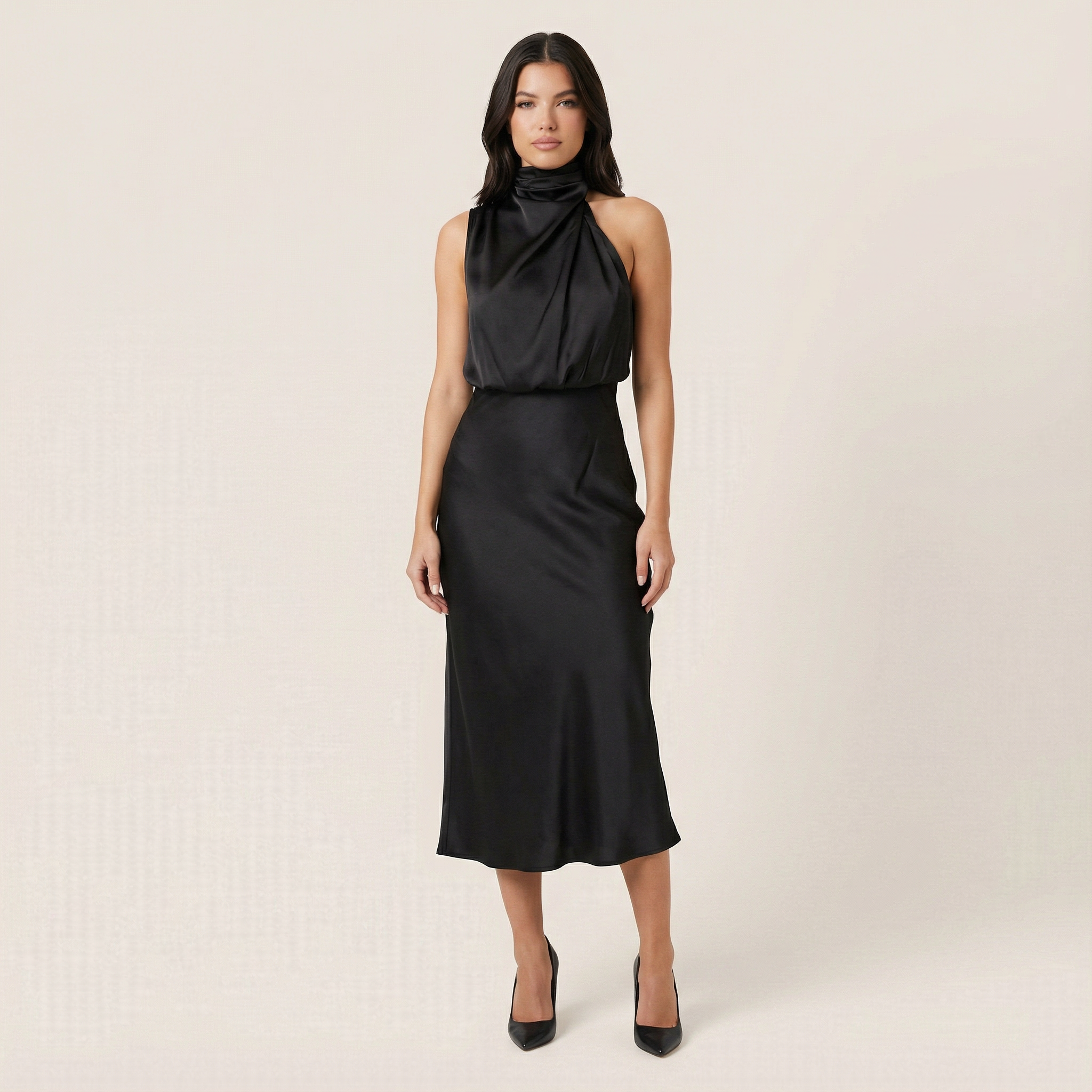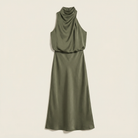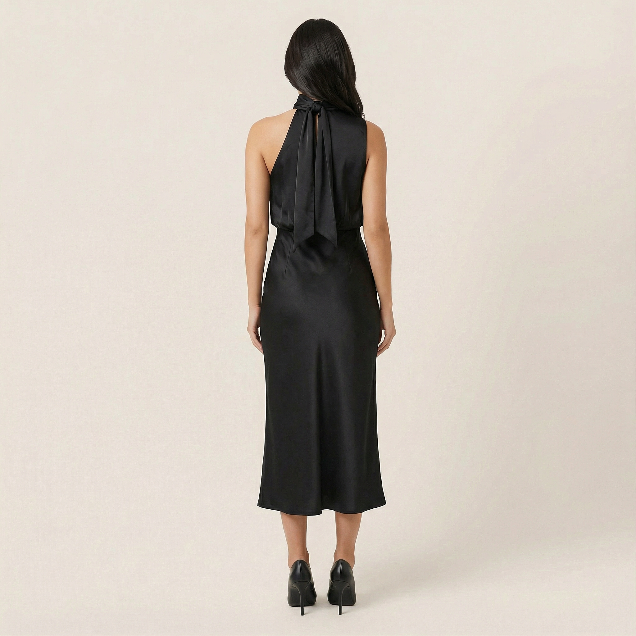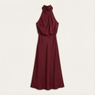 This women’s dress is designed for evening and occasion wear. It features a long silhouette with a sleeveless style.