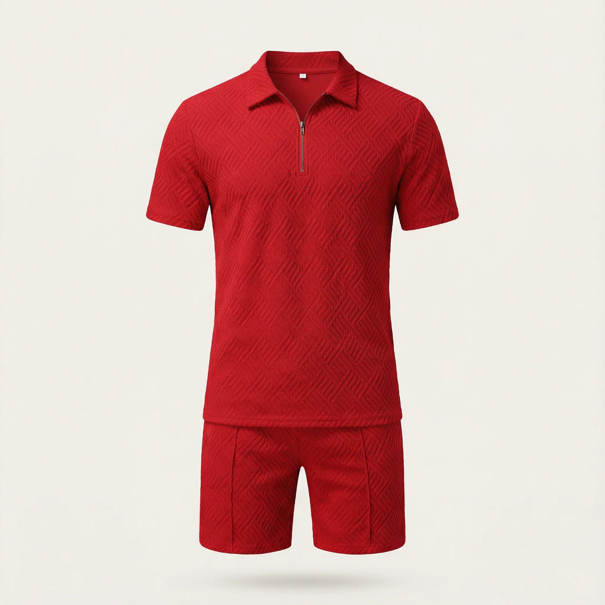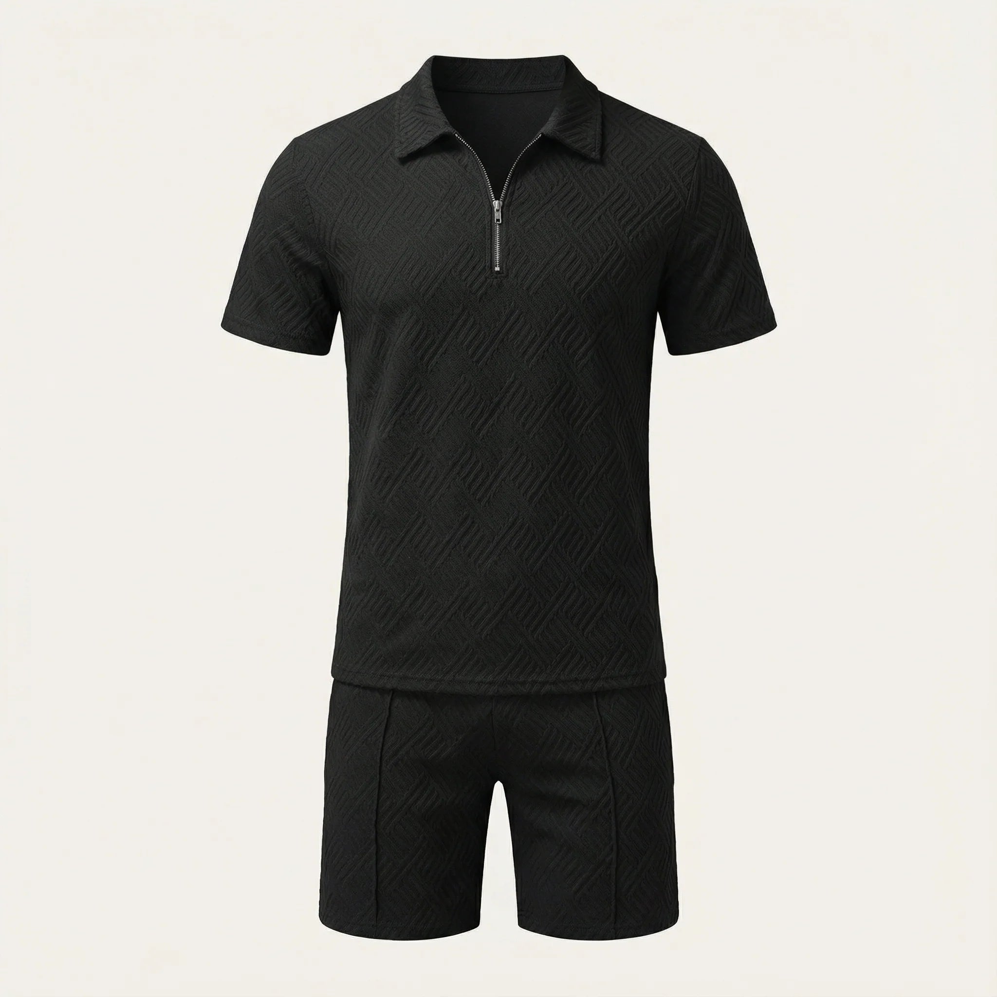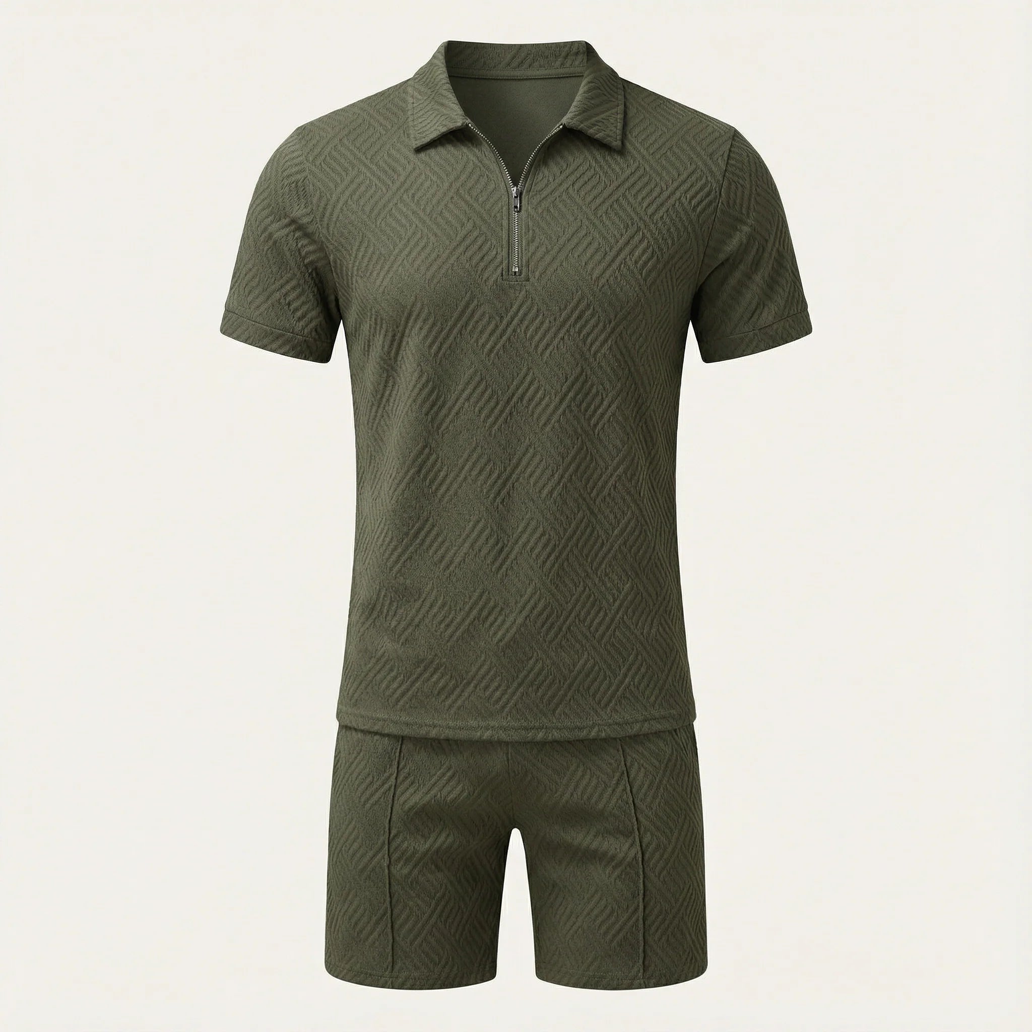 This men’s two-piece set includes a polo-style top and matching shorts for everyday and warm-weather wear. The pieces are designed to be worn together as a coordinated outfit.