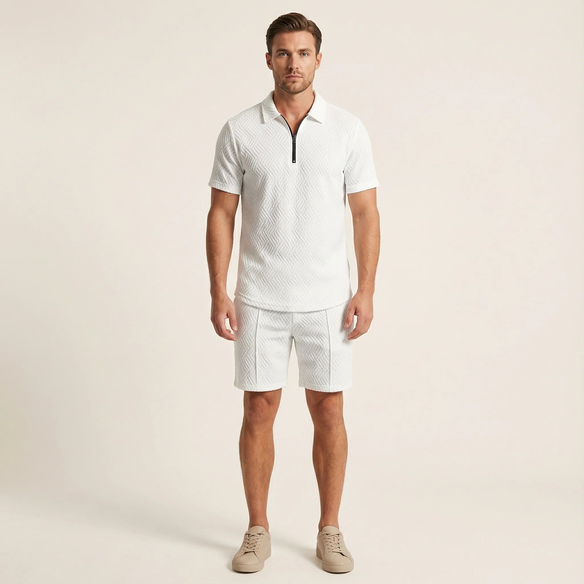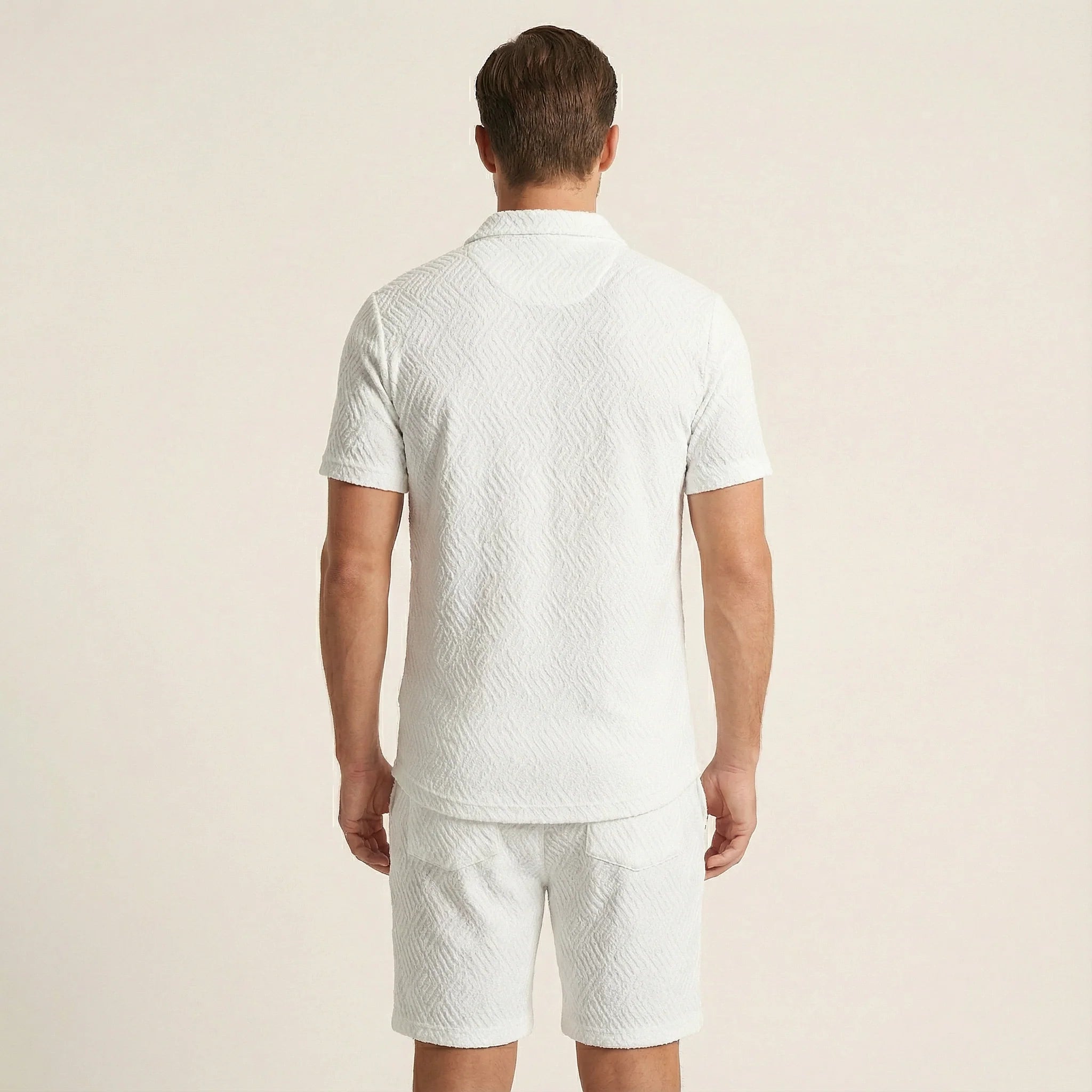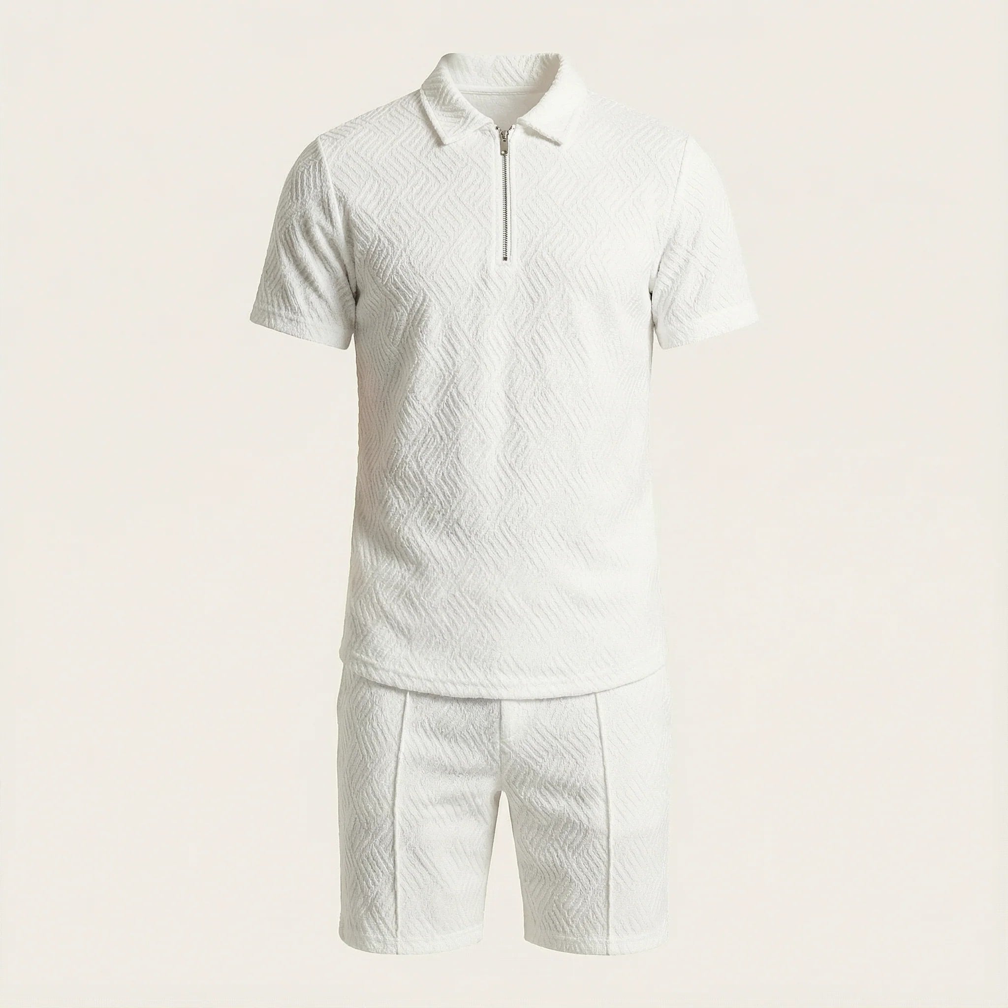 This men’s two-piece set includes a polo-style top and matching shorts for everyday and warm-weather wear. The pieces are designed to be worn together as a coordinated outfit.