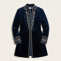 Women’s long coat featuring embroidered trim detailing and an open front design. Suitable for casual and formal layering.