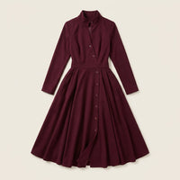 Women’s long-sleeve midi dress featuring a button-front design and stand collar. Suitable for formal and semi-formal occasions.