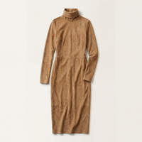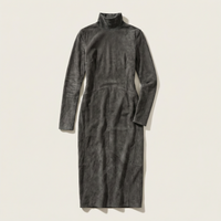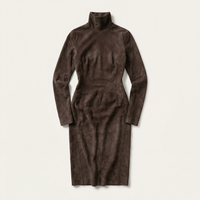 Women’s long sleeve dress featuring a high neckline and a solid color design. The garment is designed in a midi length with a straight cut.